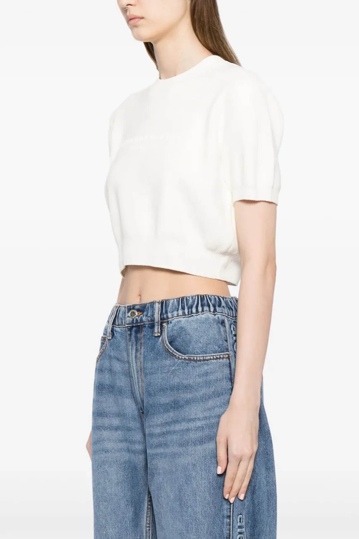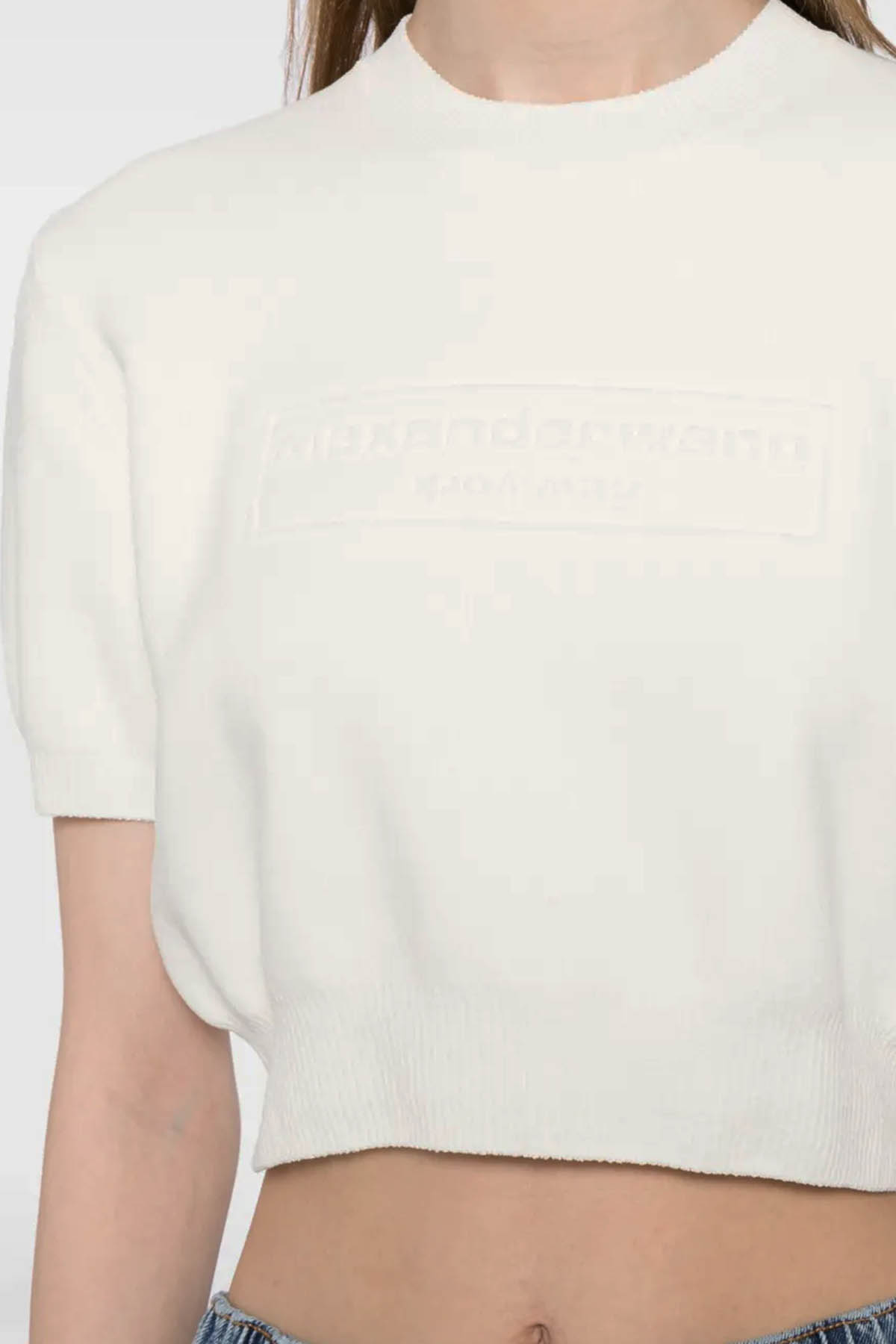 Modelo con diseño de punto, diseño de cultivos, logotipo grabado en la parte delantera, cuello redondo, manga corta y borde acanalado. Poliéster de composición 89%, poliamida 9%, elastam 2%