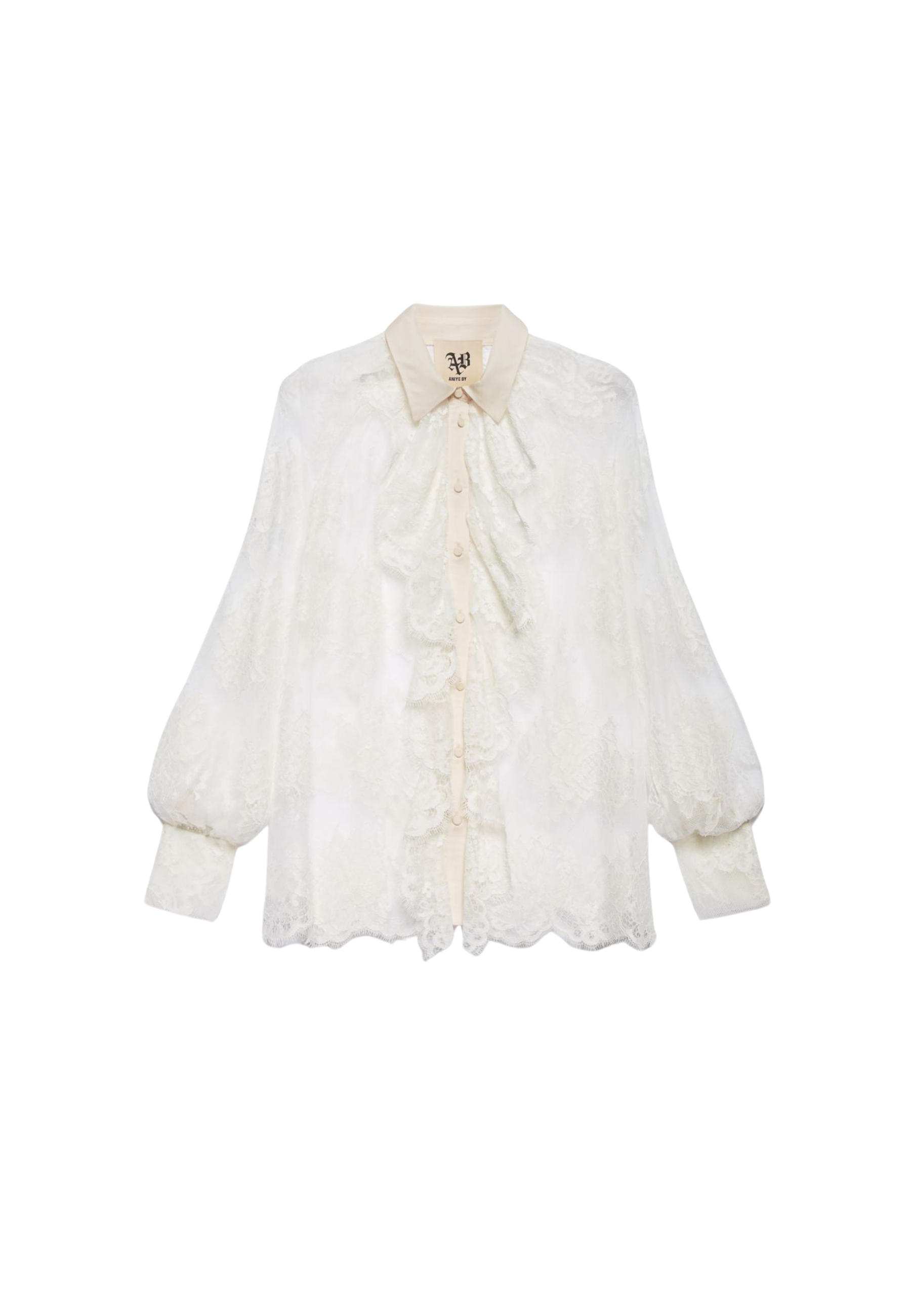 Camisa de encaje juega con ligero volumen de mangas de globo y rouches románticos en la parte delantera. El cuello clásico y el cierre de botones mantienen un atractivo tradicional, mientras que el pequeño logotipo metálico "ab" muestra la mirada en la espalda.