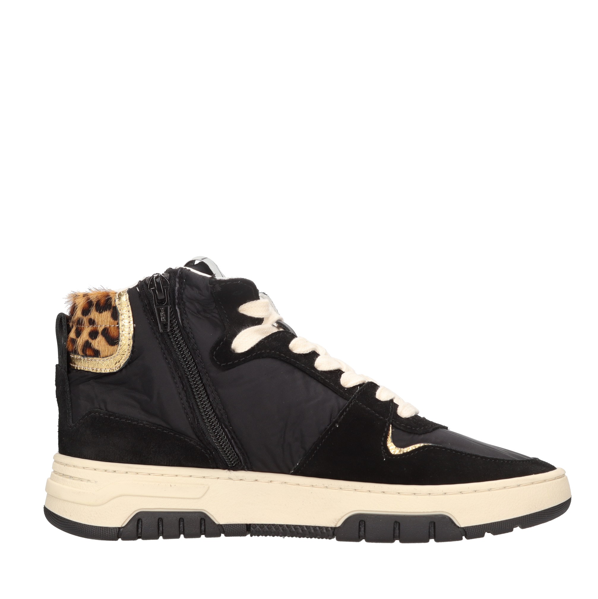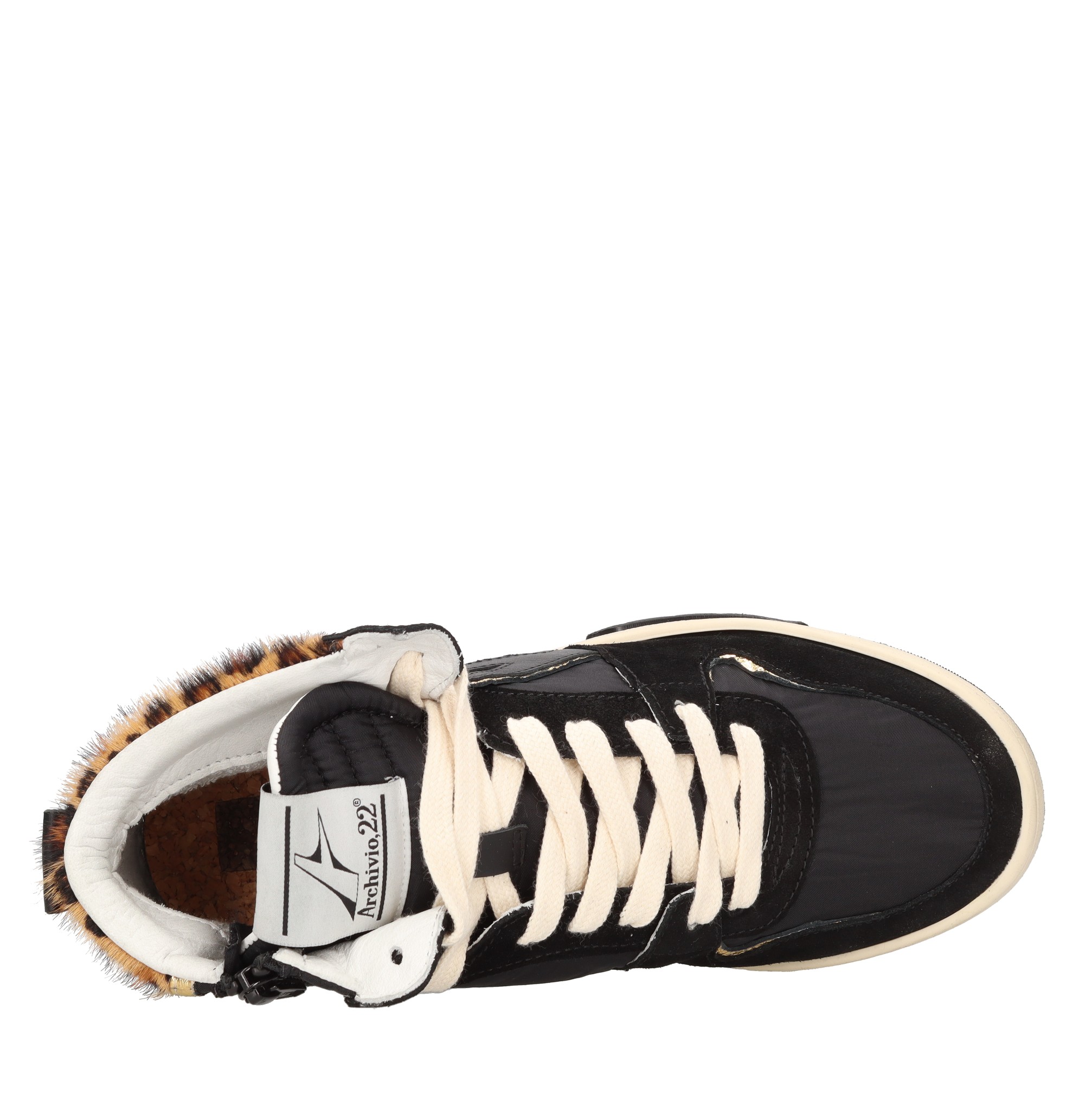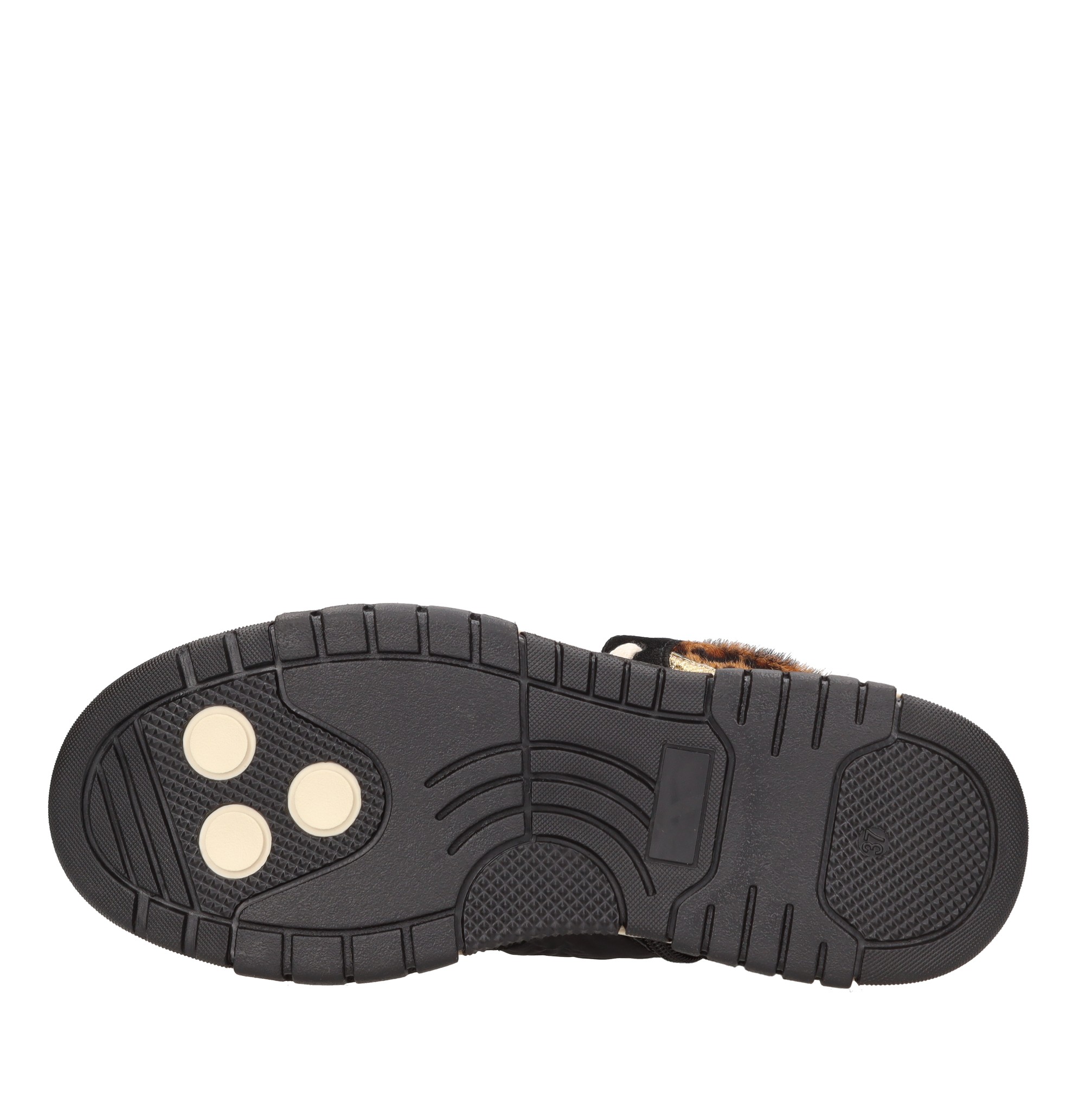 Zapatillas altas en ante y tejido. Parte superior interna en piel y tela. Suela exterior de goma.