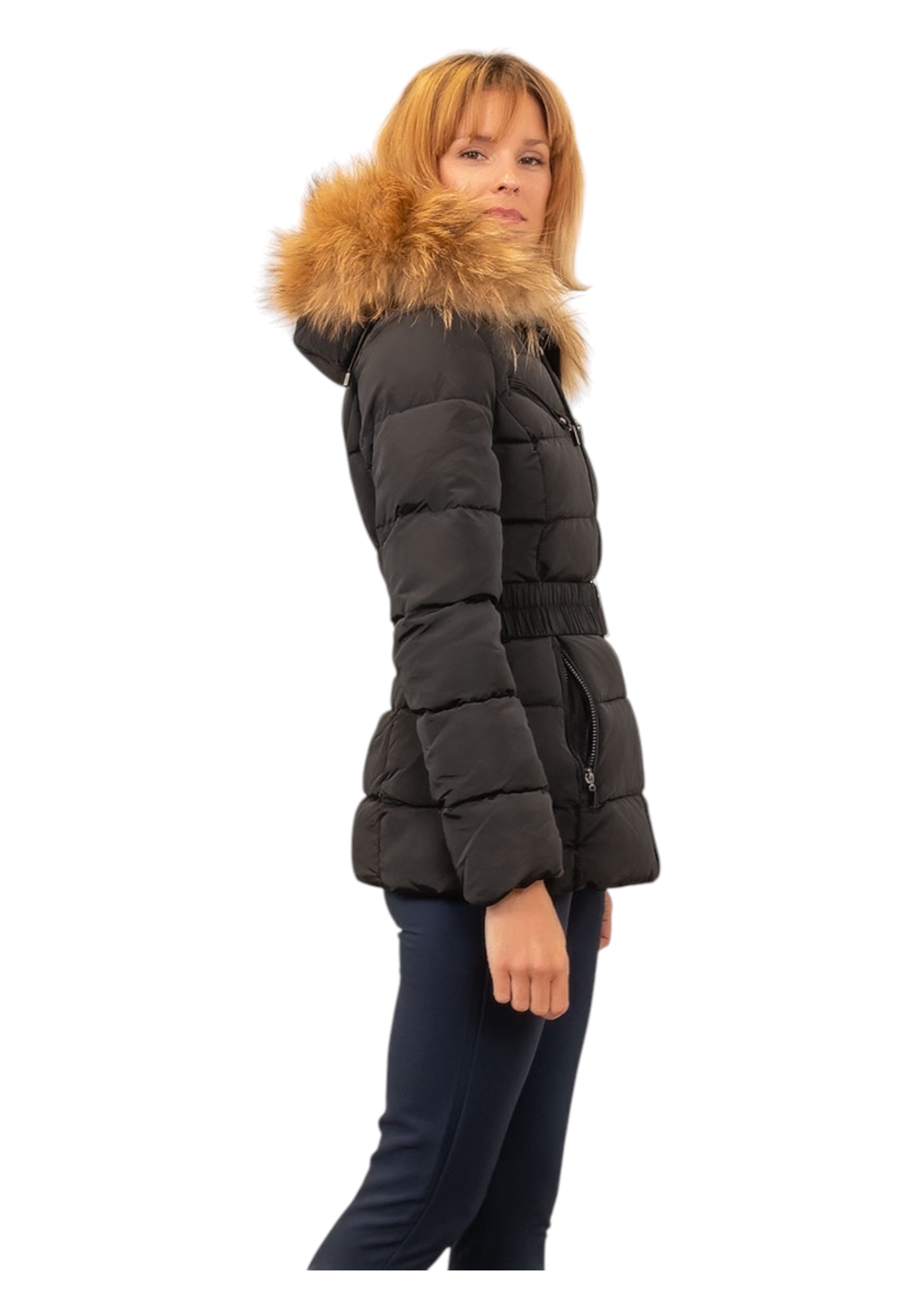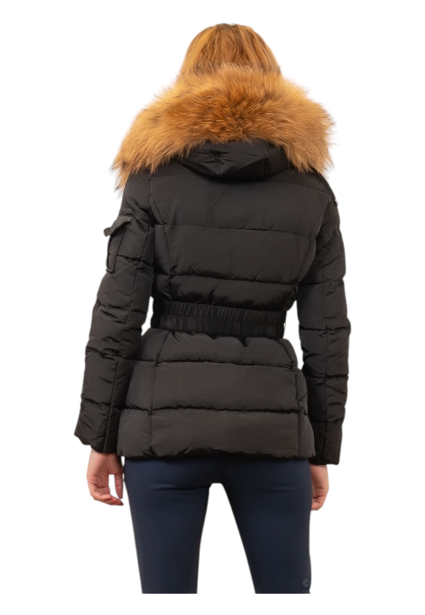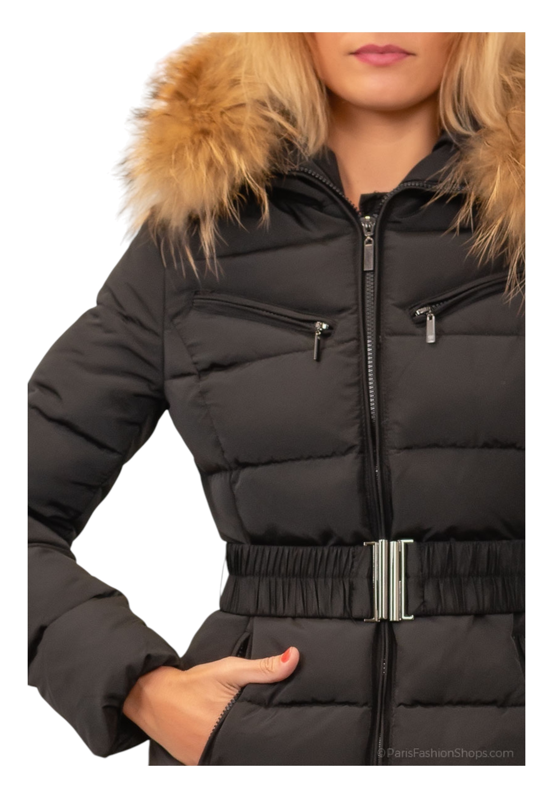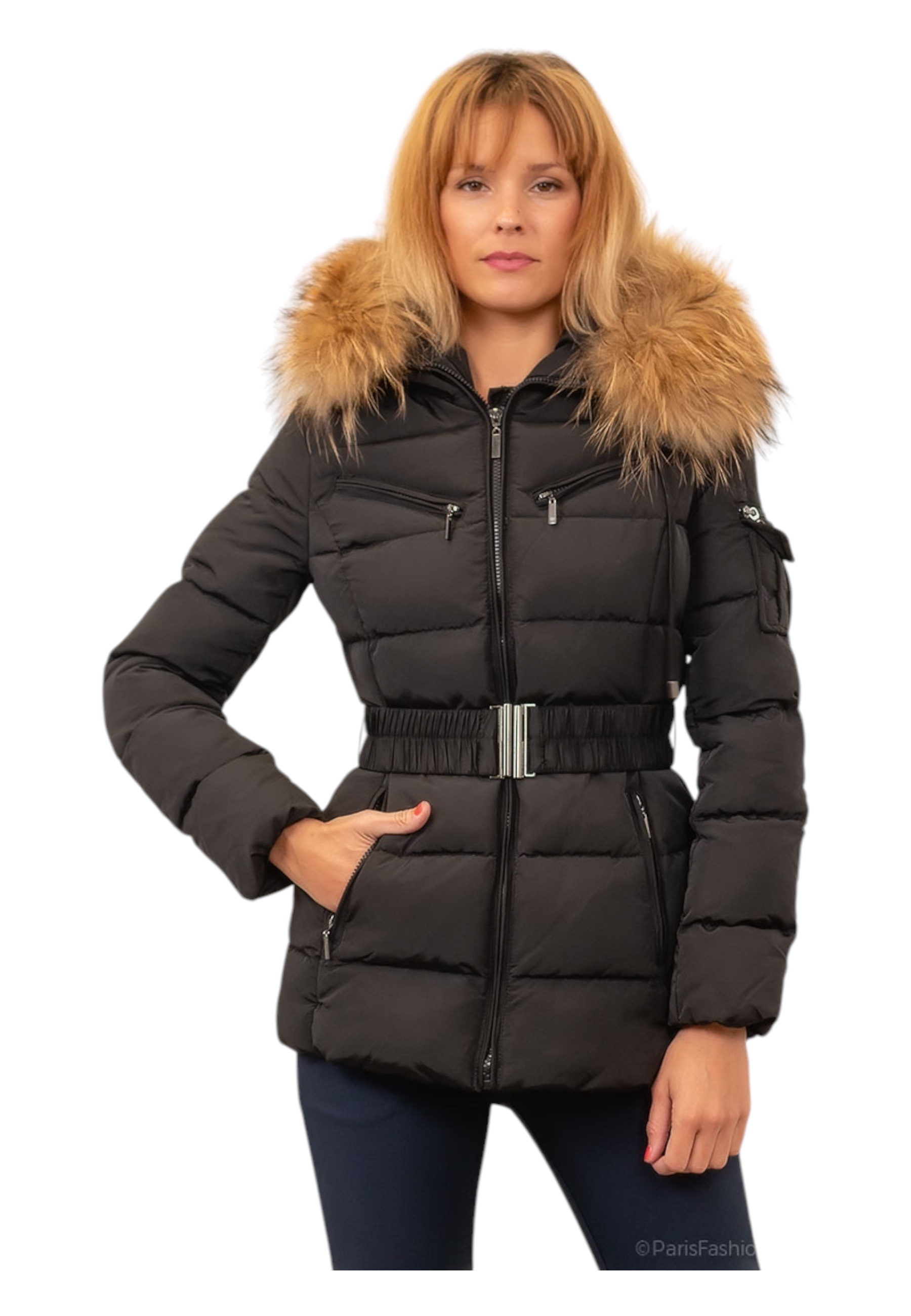 Estaciona maciza acolchada de longitud media con correa y piel de mapache grueso real.