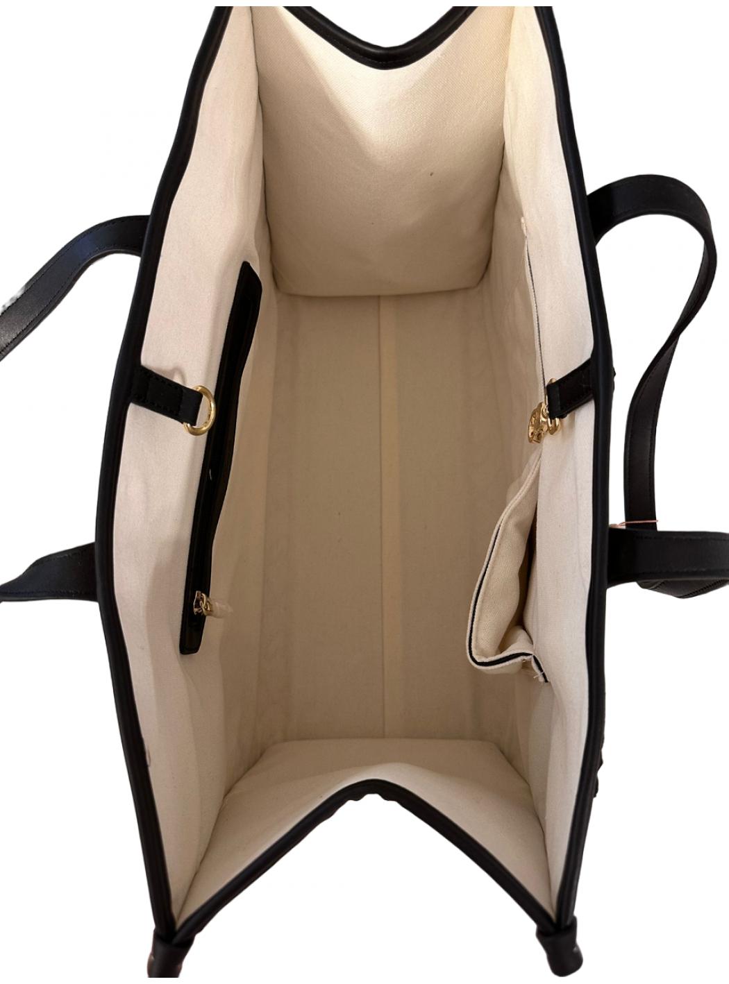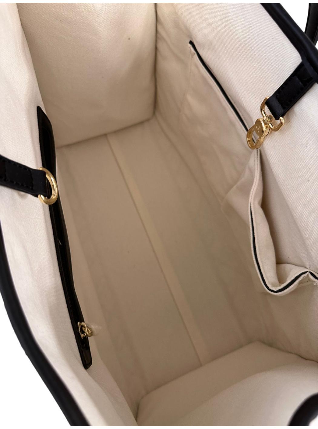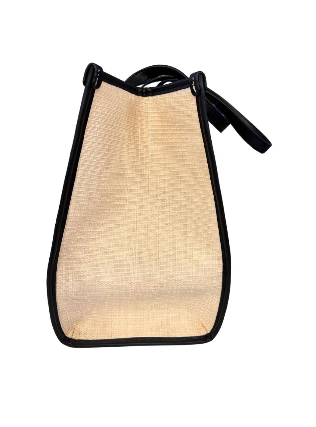 Gran bolsa de mar efecto paja con insertos negros. Mangos de cuero negro. Recubierto internamente con bolsillos.Para una mujer dinámica y para los trajes primavera verano 2024.