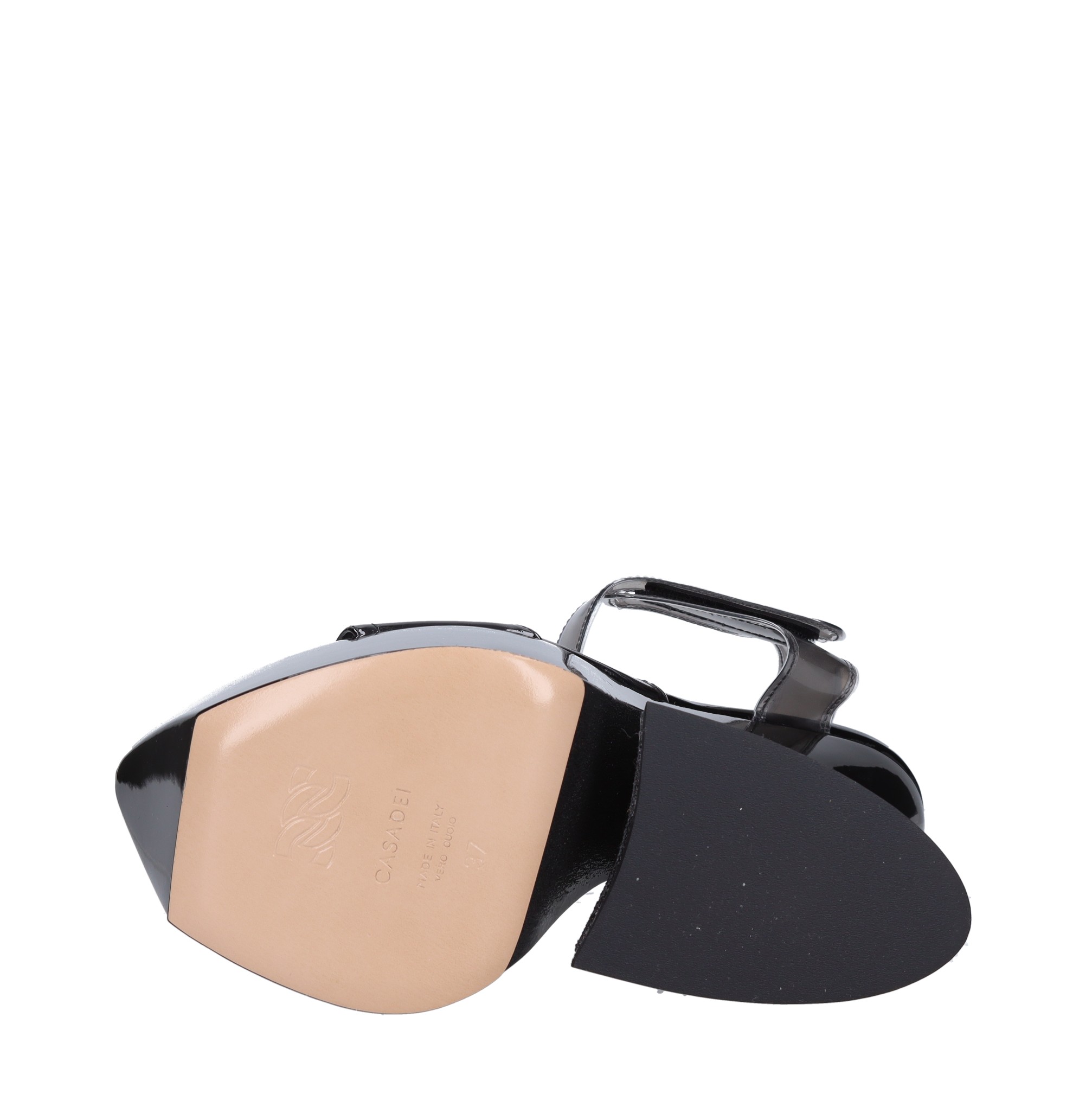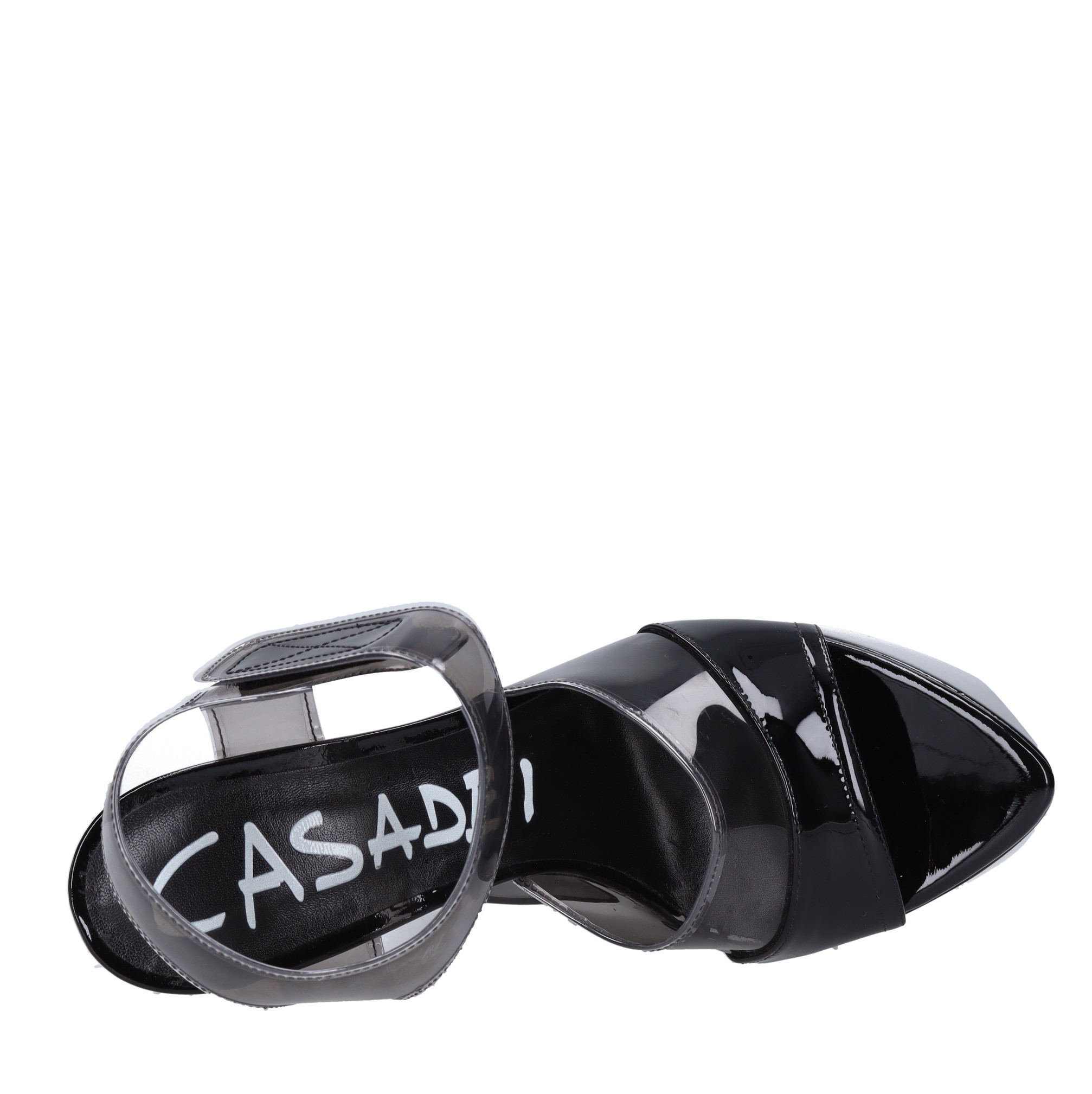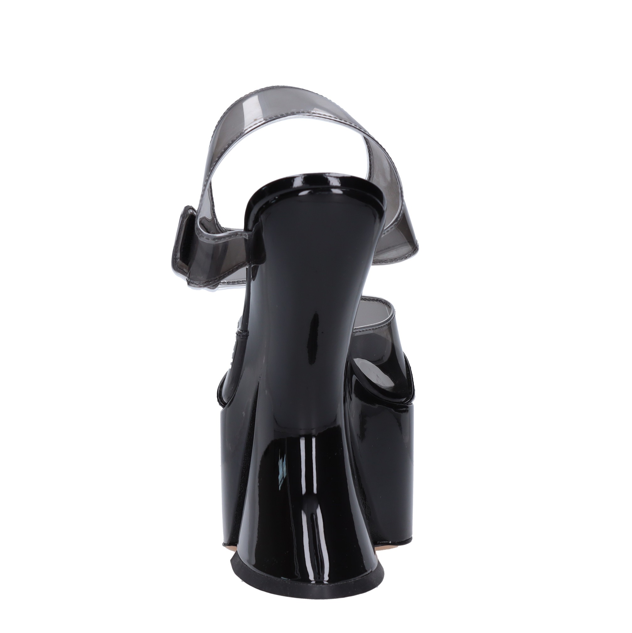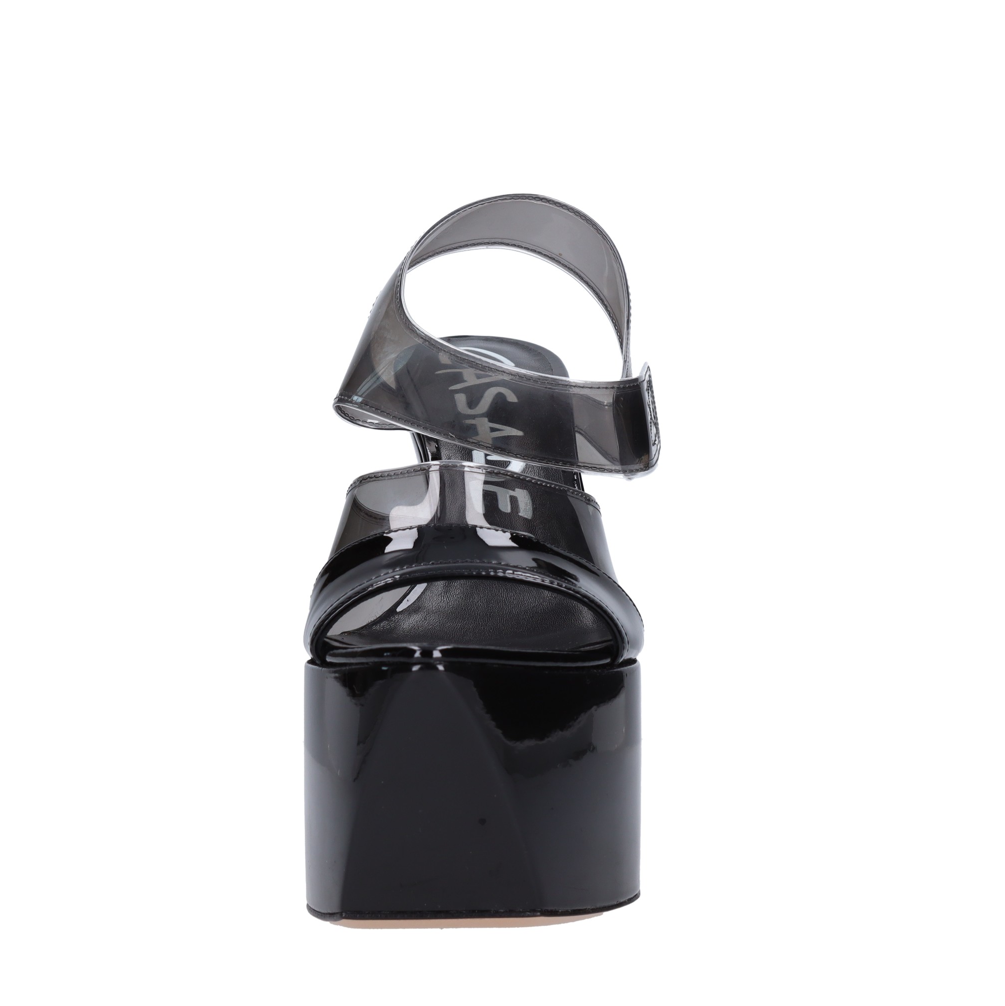 Sandalias de charol y plexiglás. Muestras. Meseta: 7 cm. Cierre de gancho y bucle. Suela exterior de piel. Parte superior interna de cuero. Se envía en caja neutra.