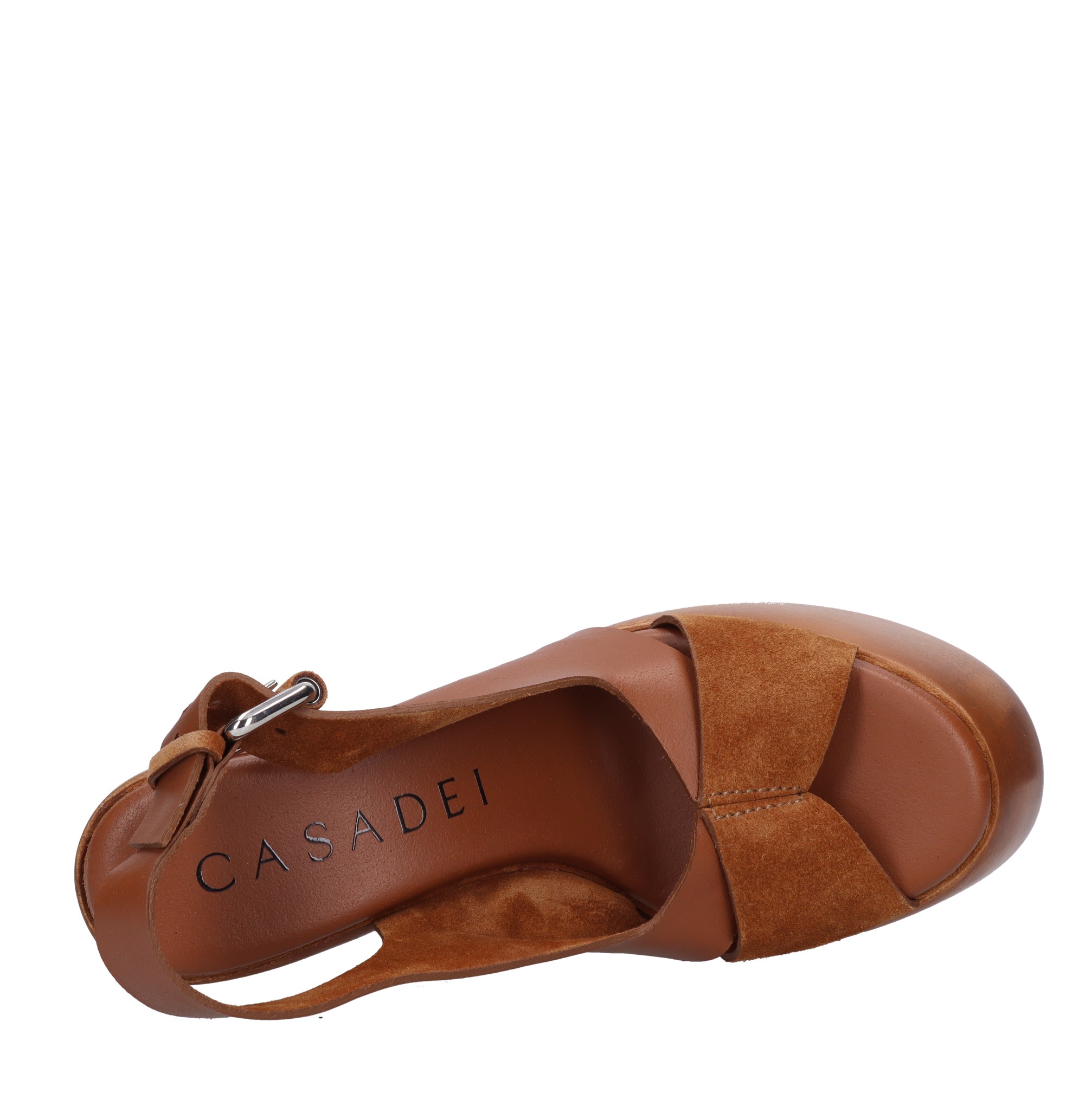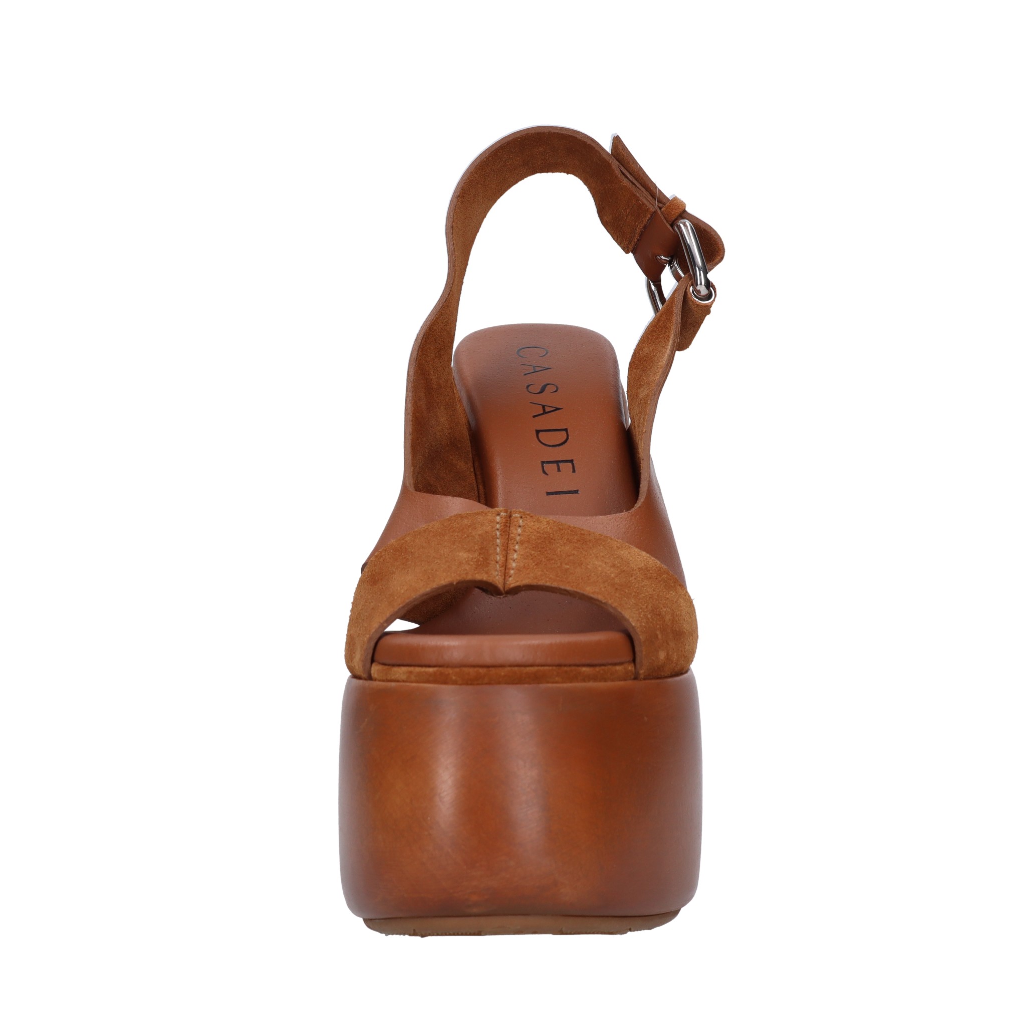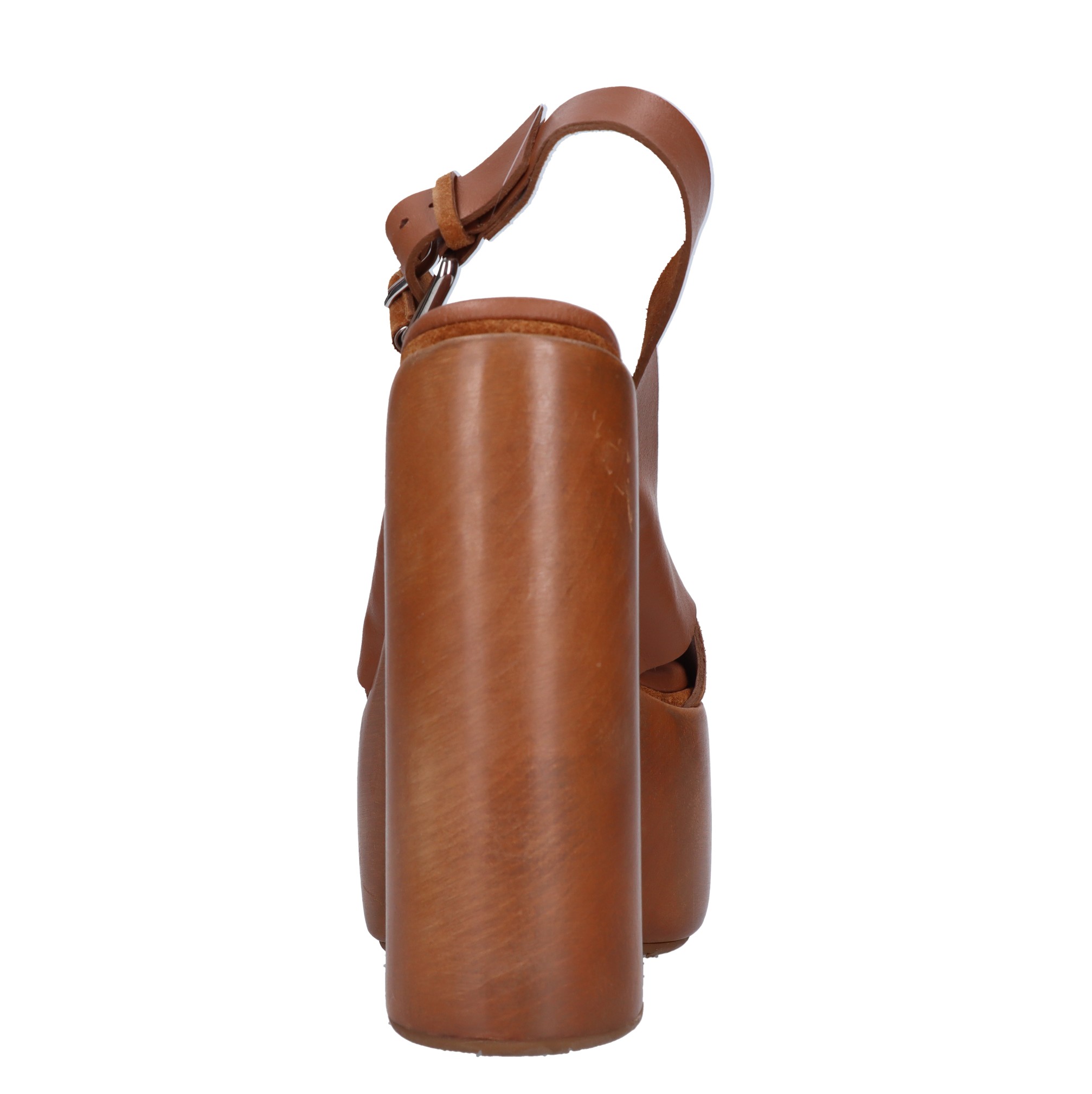 Sandalias de piel y ante. Meseta: 7 cm. Suela exterior de goma. Parte superior interna de cuero. Pequeñas imperfecciones en el cuero y la madera. Efecto vintage. Muestras. Se envía en caja neutra.