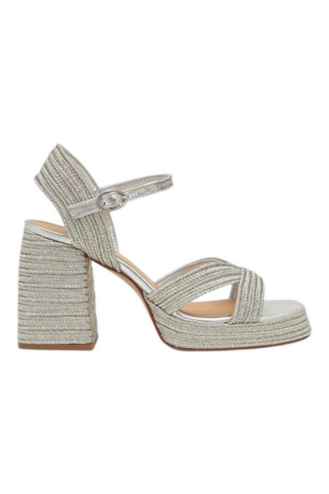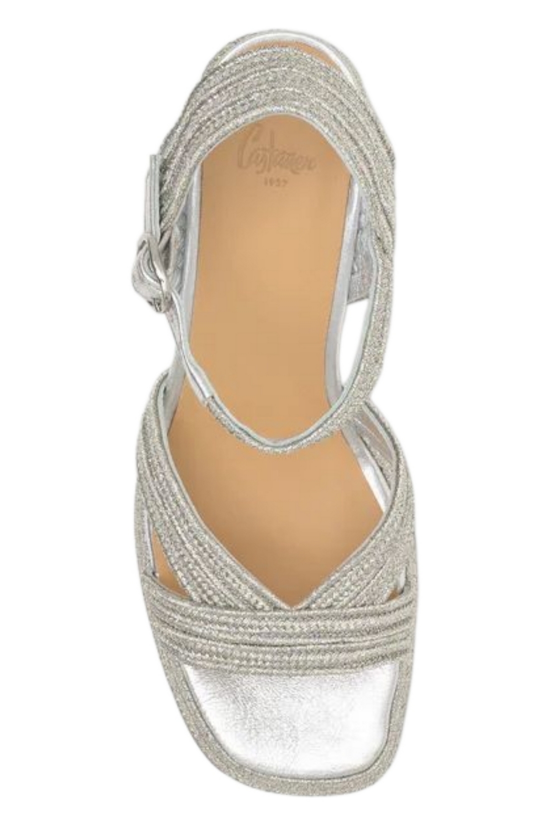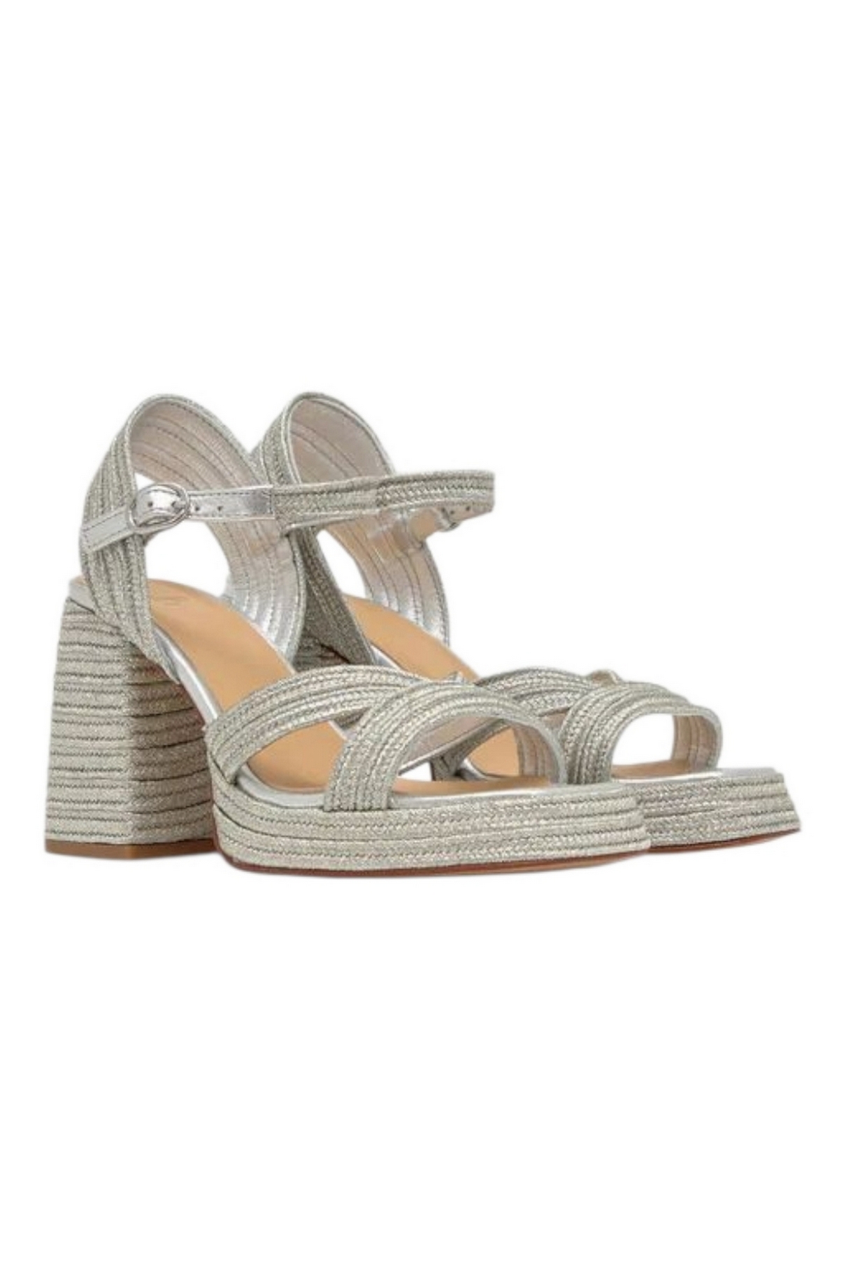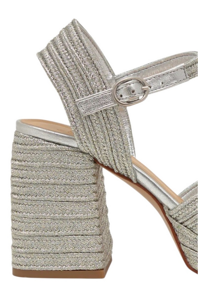 Sandalias Valle de Castaner. Acabados tejidos de metal. Punta abierta cuadrada. Cierre lateral con correa de hebilla metálica. Apertura trasera. Suela de cuero simil. Composición interna: 100% piel de oveja. Composición externa: 65% poliéster, 30% poliéster metalizado, 5% piel de oveja. Material del solo: cuerolite. Altura total: 10 cm. Altura de la plataforma: 2cm. Altura: 8 cm. Fabricado en España.