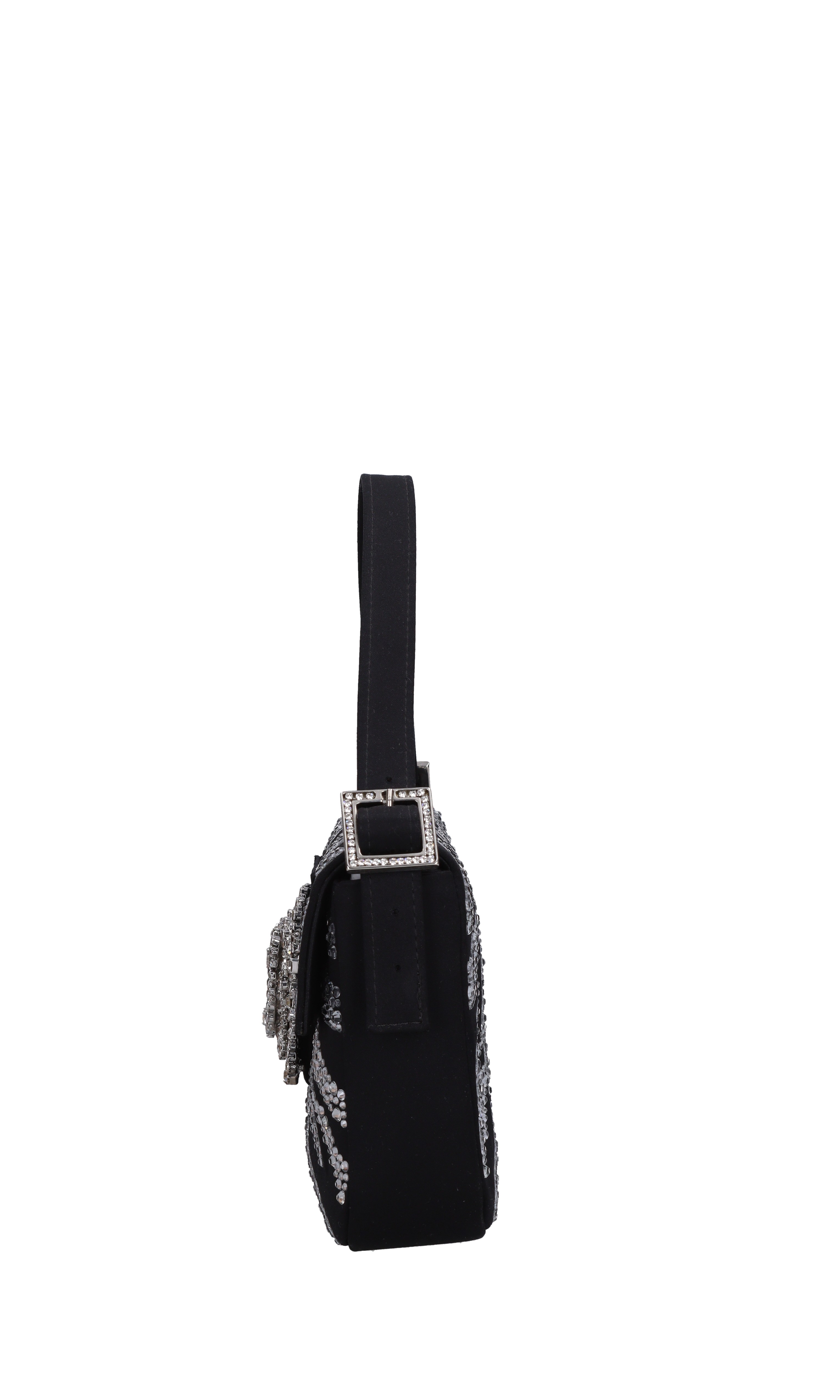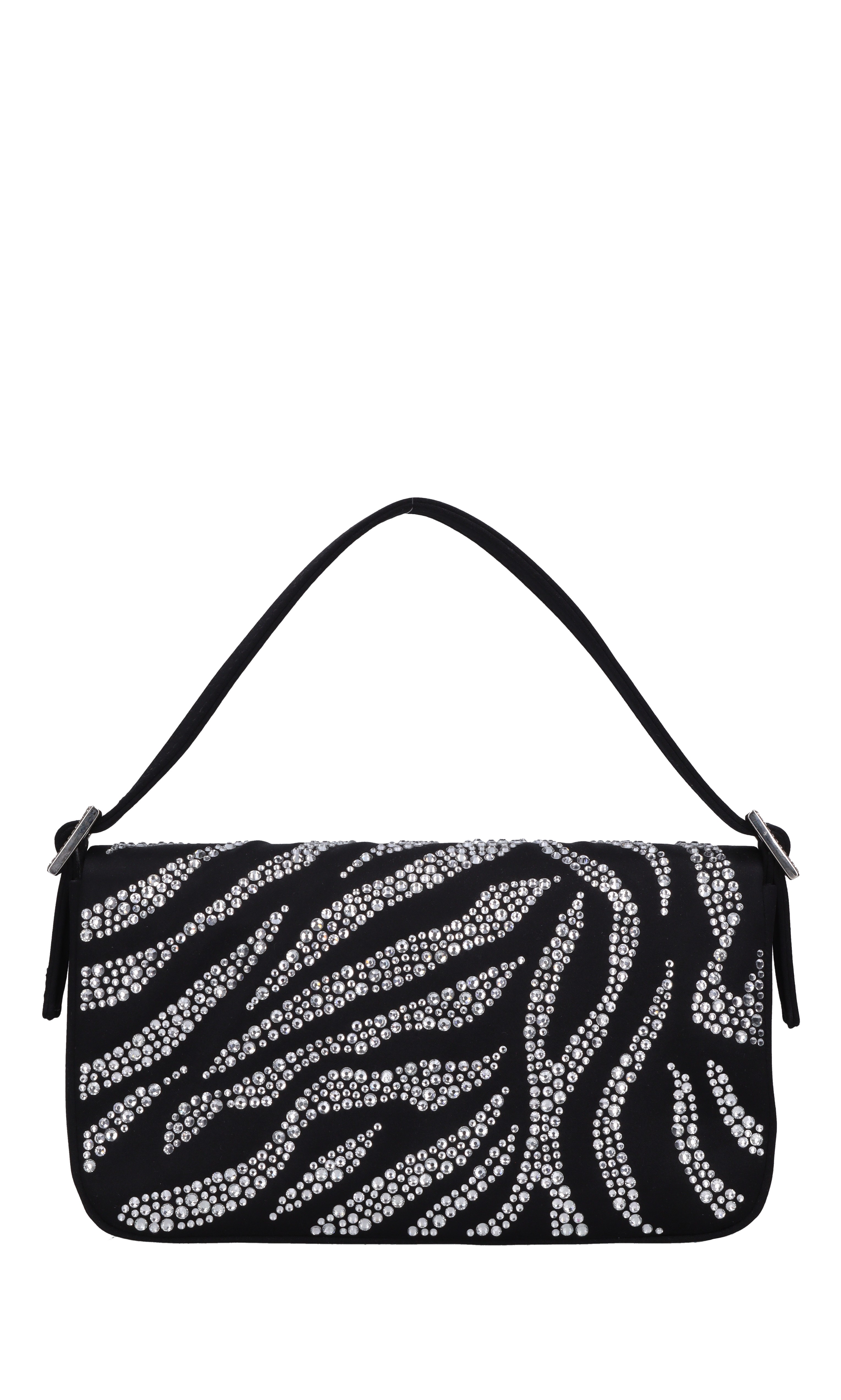 Habibi mini bolsa en satinado y estrado. Cierre con solapa y botón magnético. Un compartimento. 1 bolsillo interno. Sobre transparente.