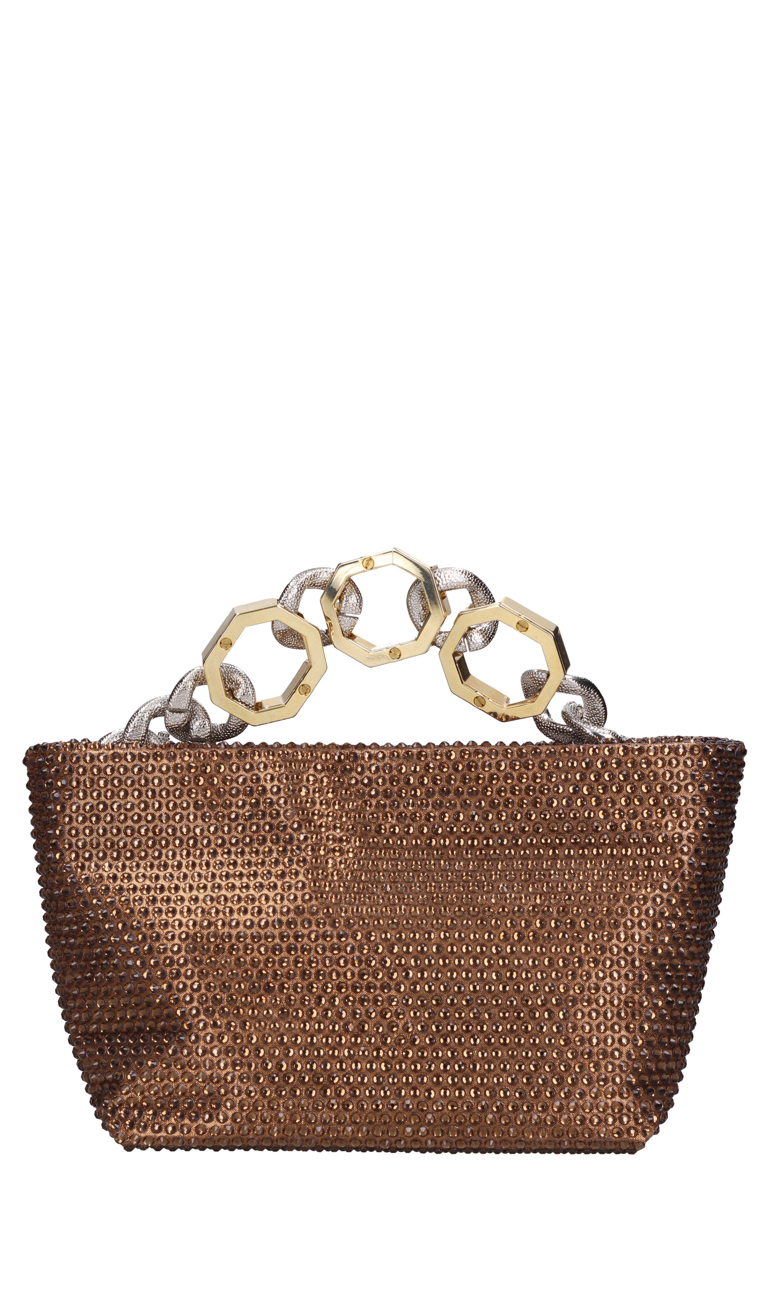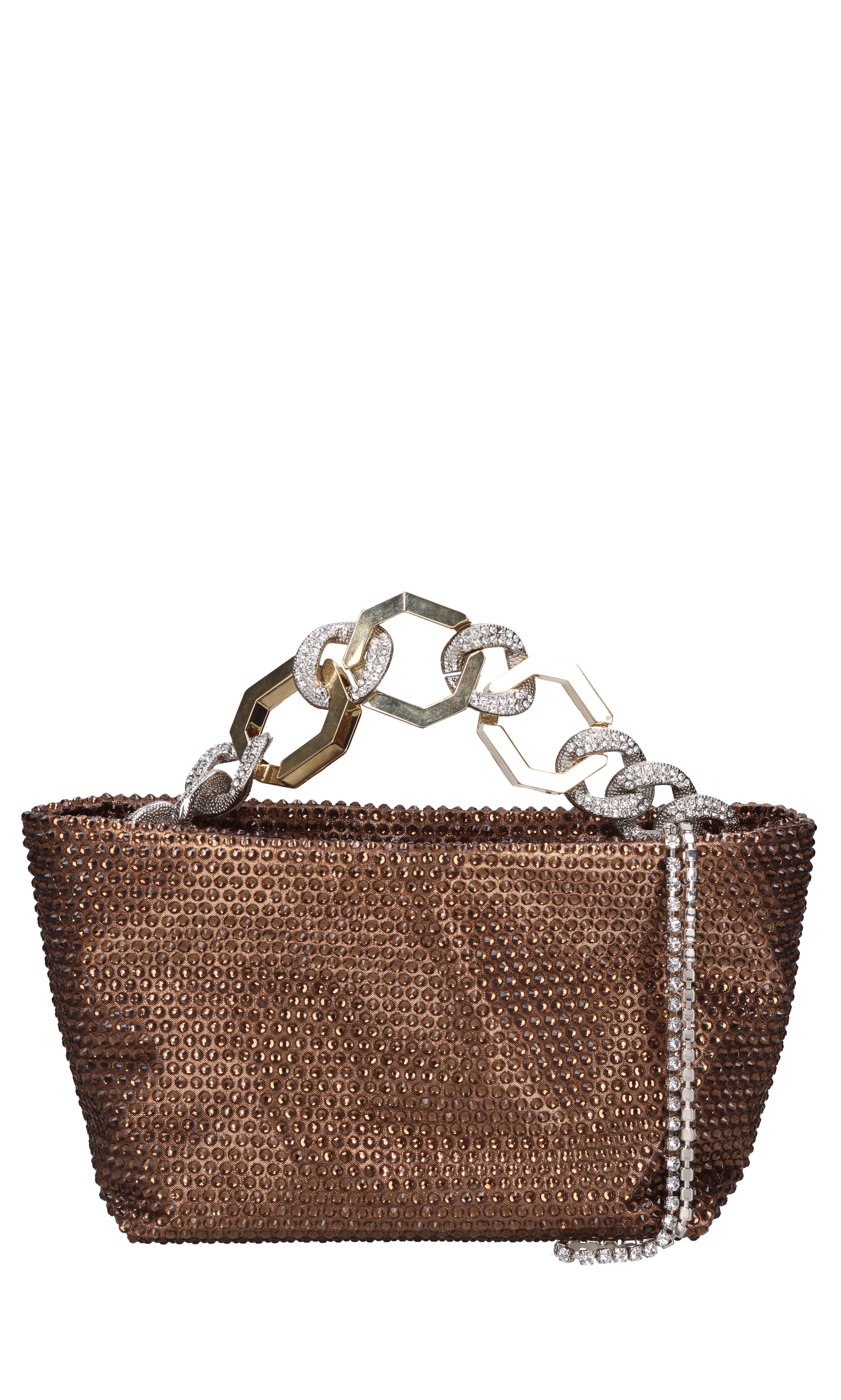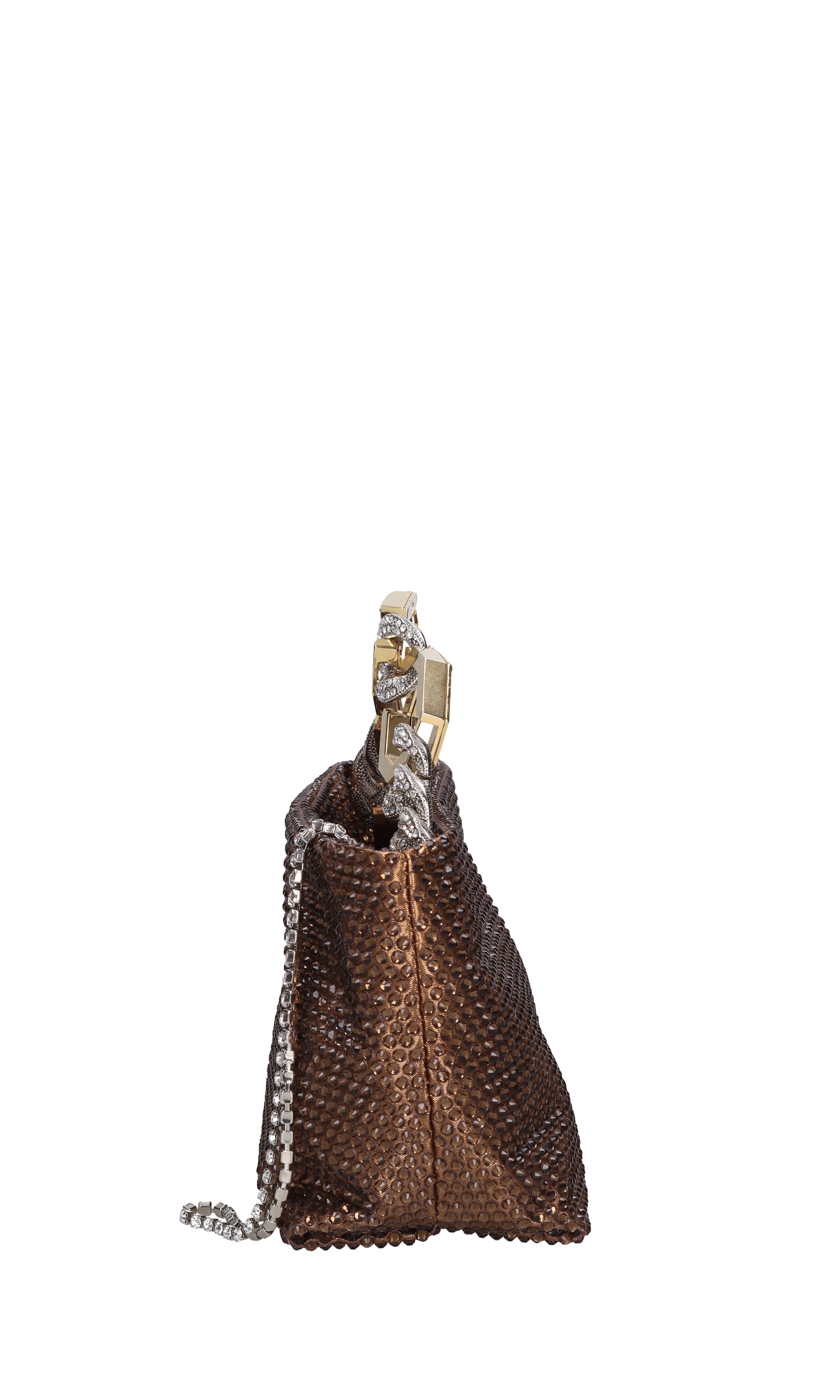 Bolsa de Jessye en tela y estragos. Cierre con cremallera de joyas. Un compartimento. Mango de cadena de oro y plata con diamantes de imitación aplicados. Sin etiqueta pero con certificado de autenticidad. Enganchado en una cucaracha transparente.