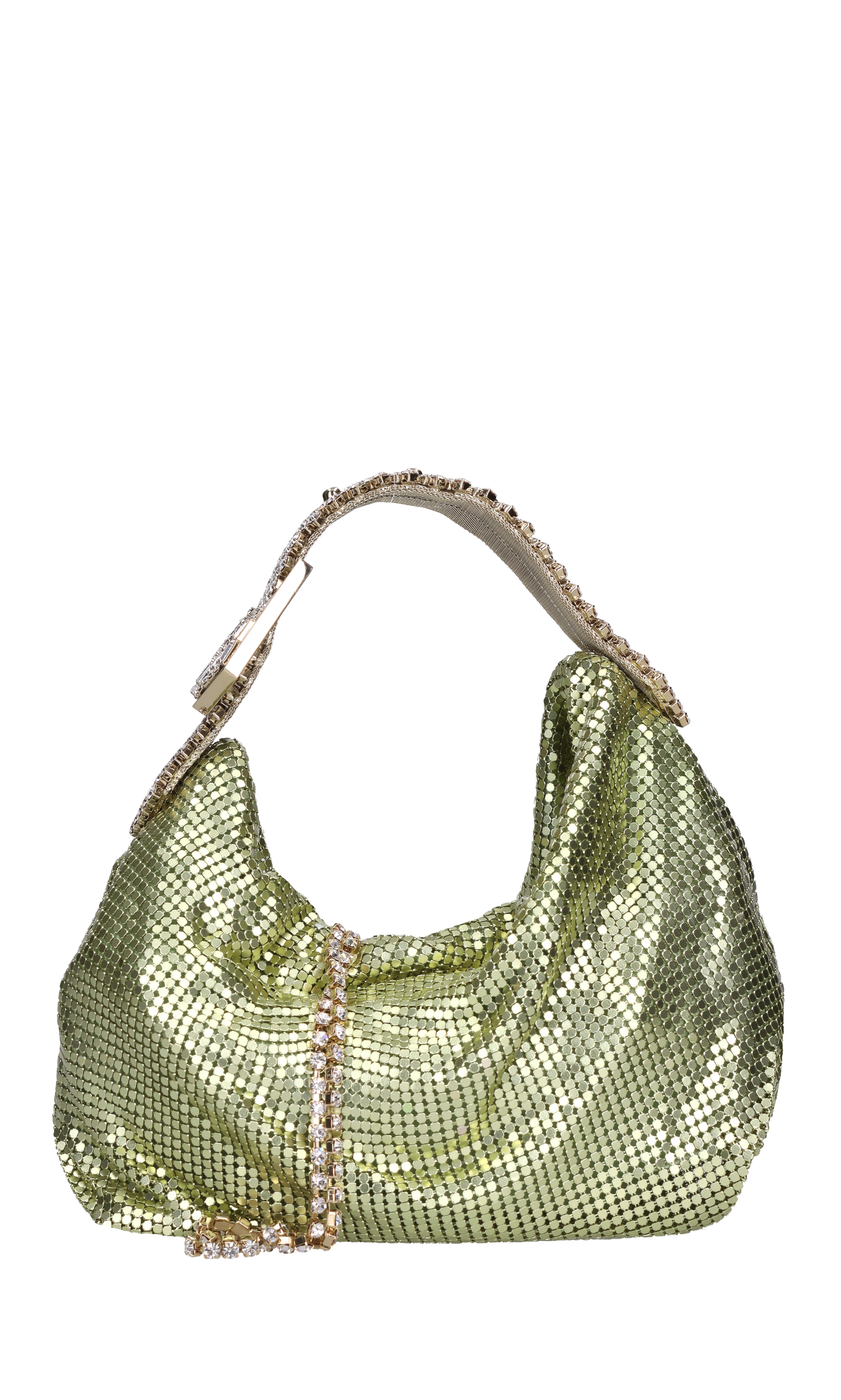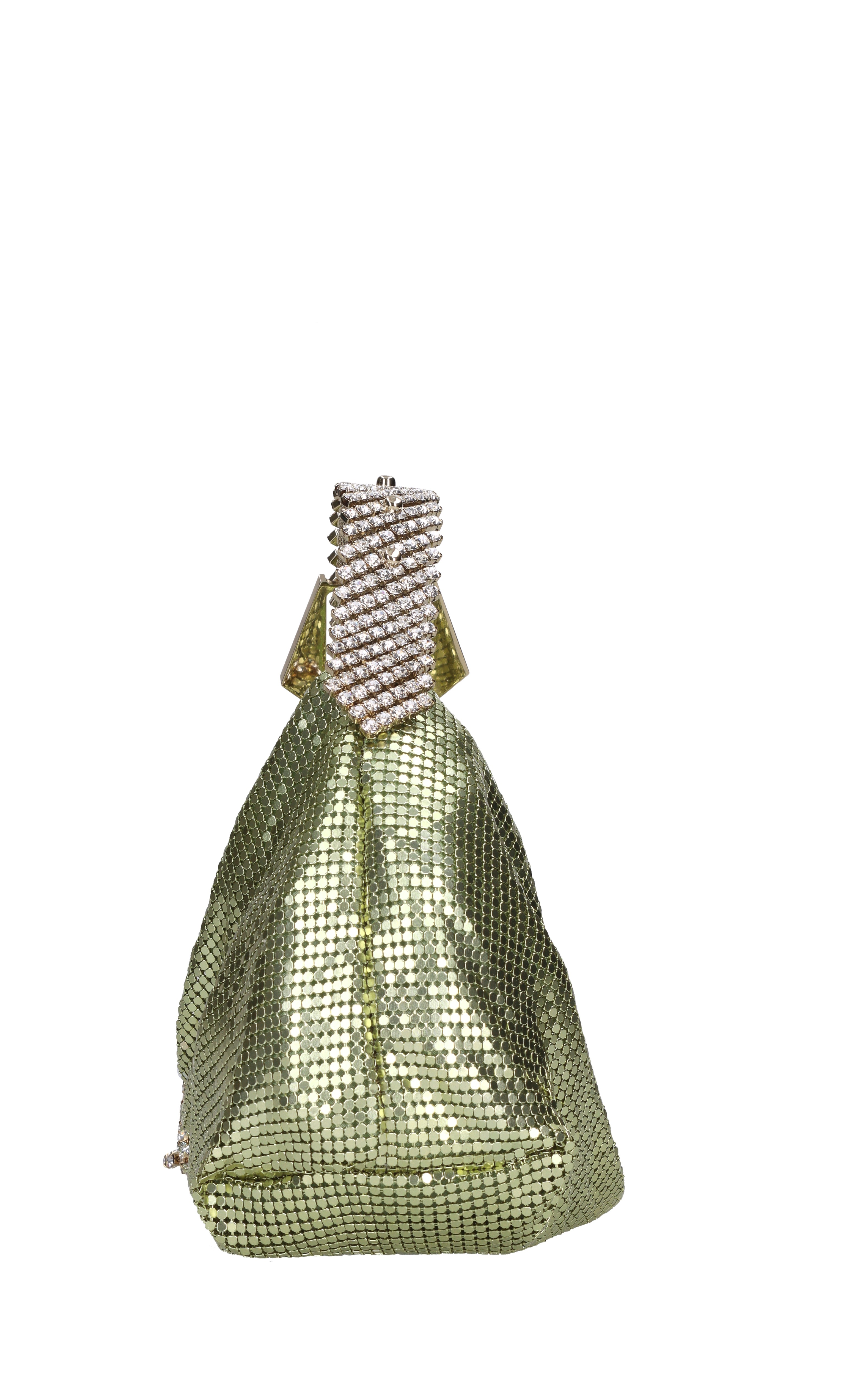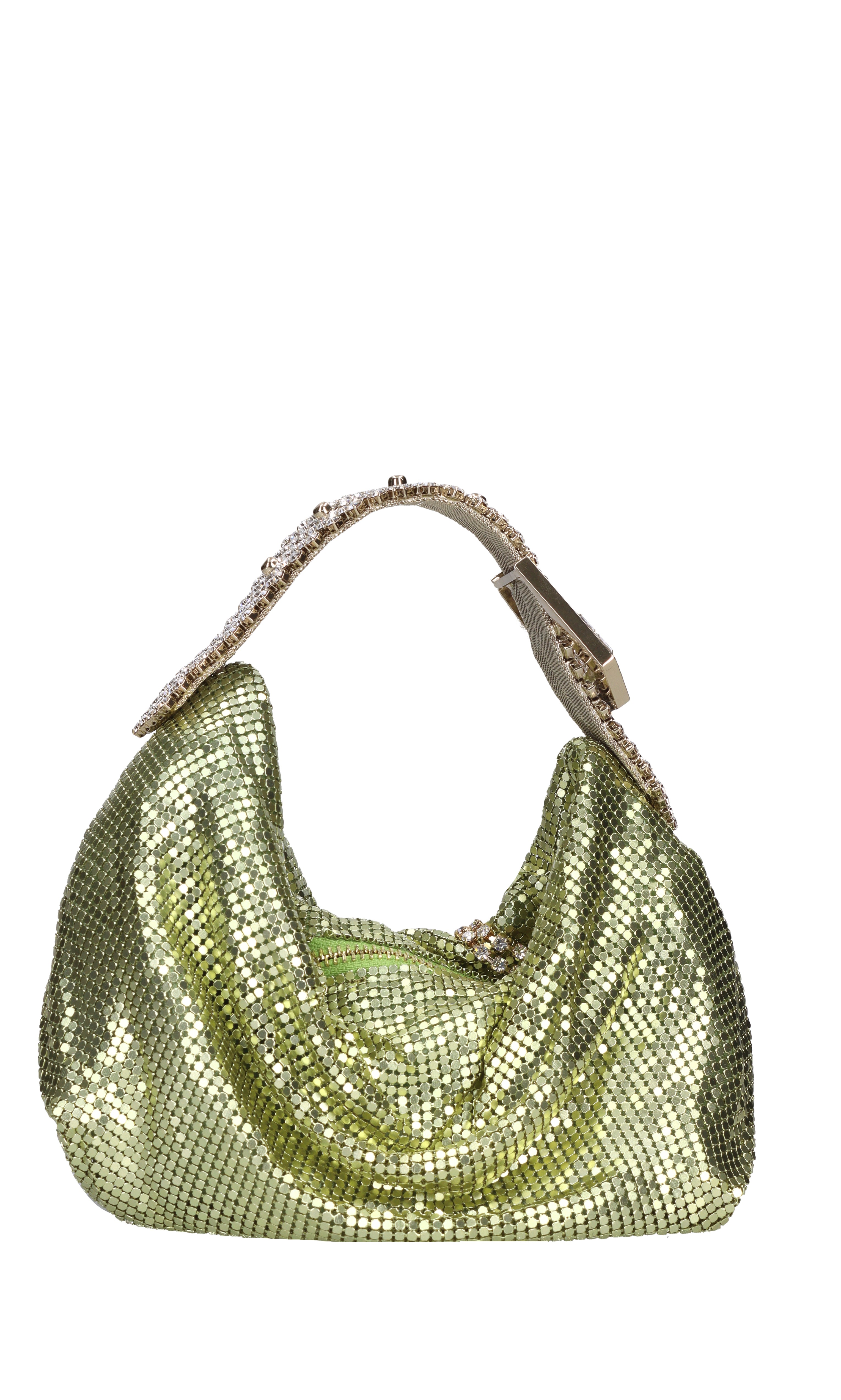Mini modelo bolso jill en malla metálica. 1 Comparto. Cierre de cremallera. Correa de hombro con diamantes extraíbles. Sobre transparente.