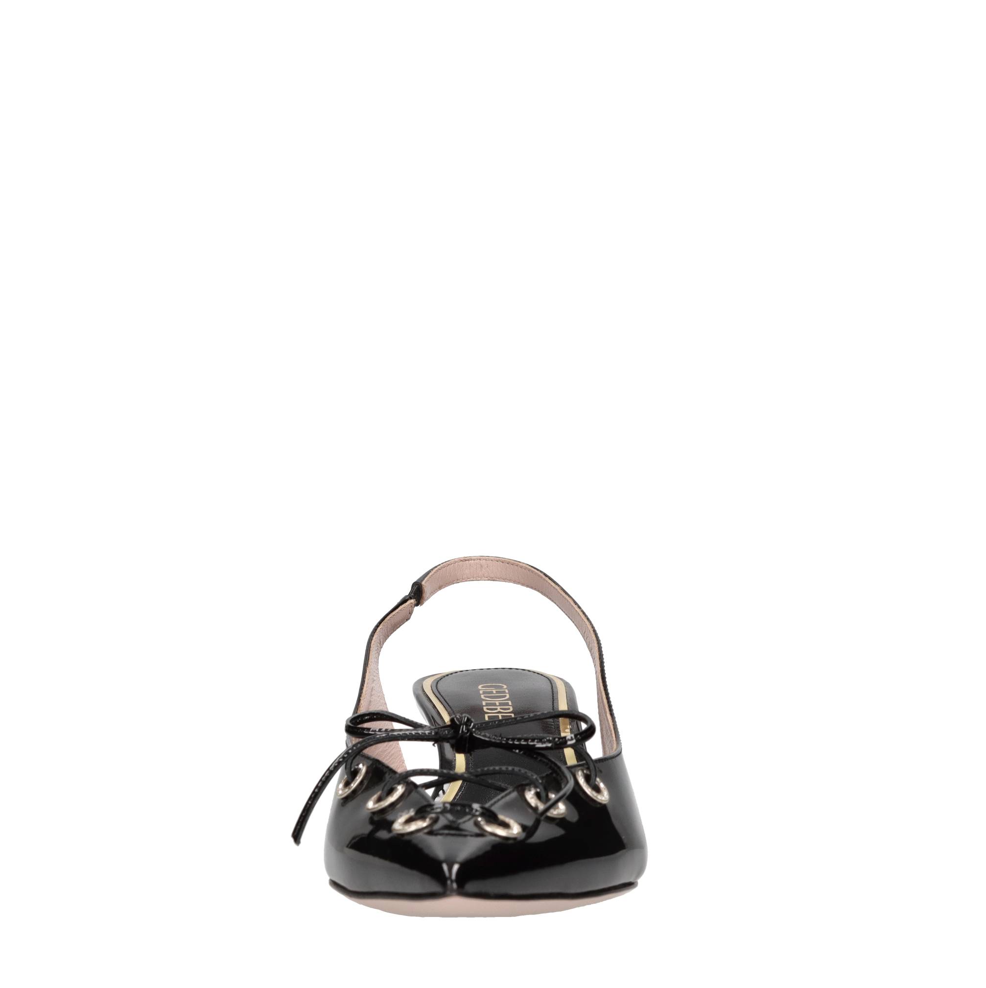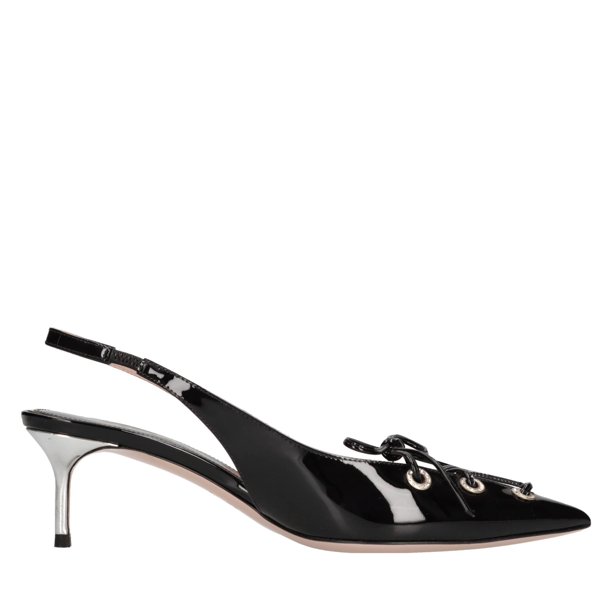 Décolleté slingback Suzie en barniz. Efecto de corset y decoración de rhinestone. Suela exterior de cuero. Parte superior interna en cuero y tela. Muestras. Señales imperceptibles en tacones, no visibles cuando se usa.