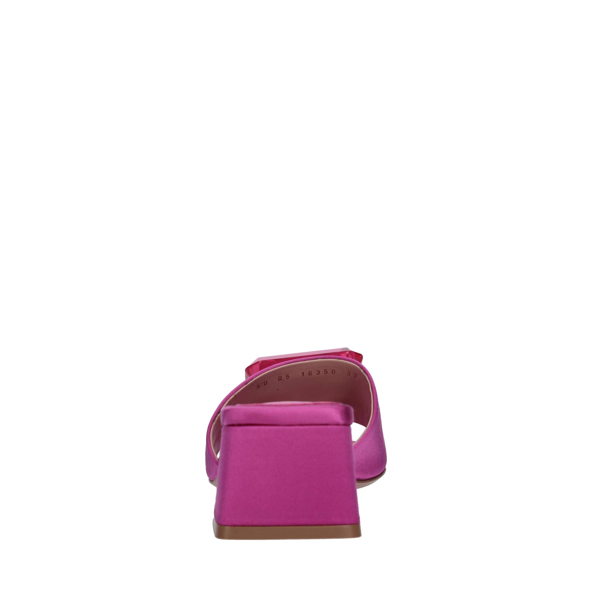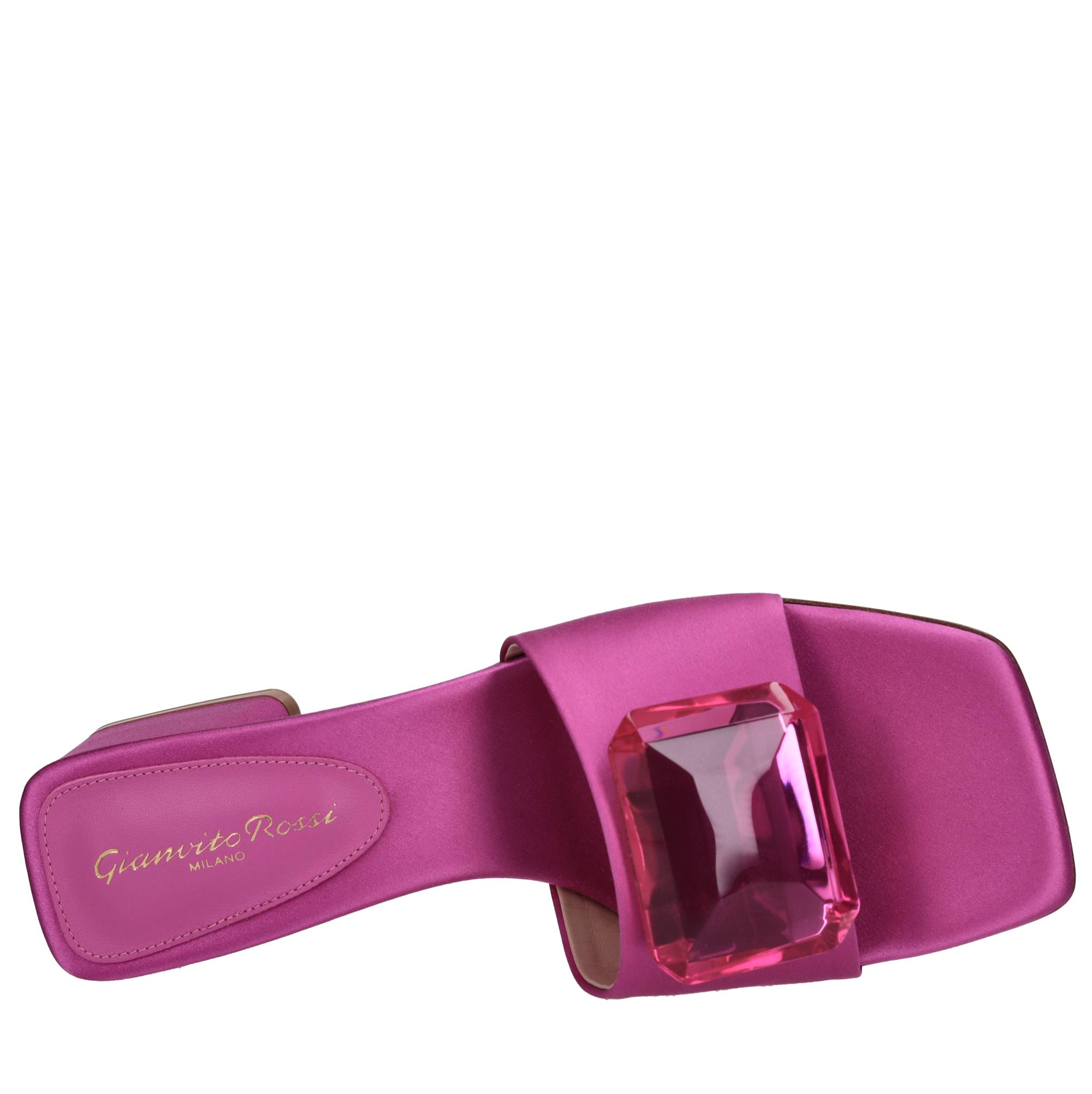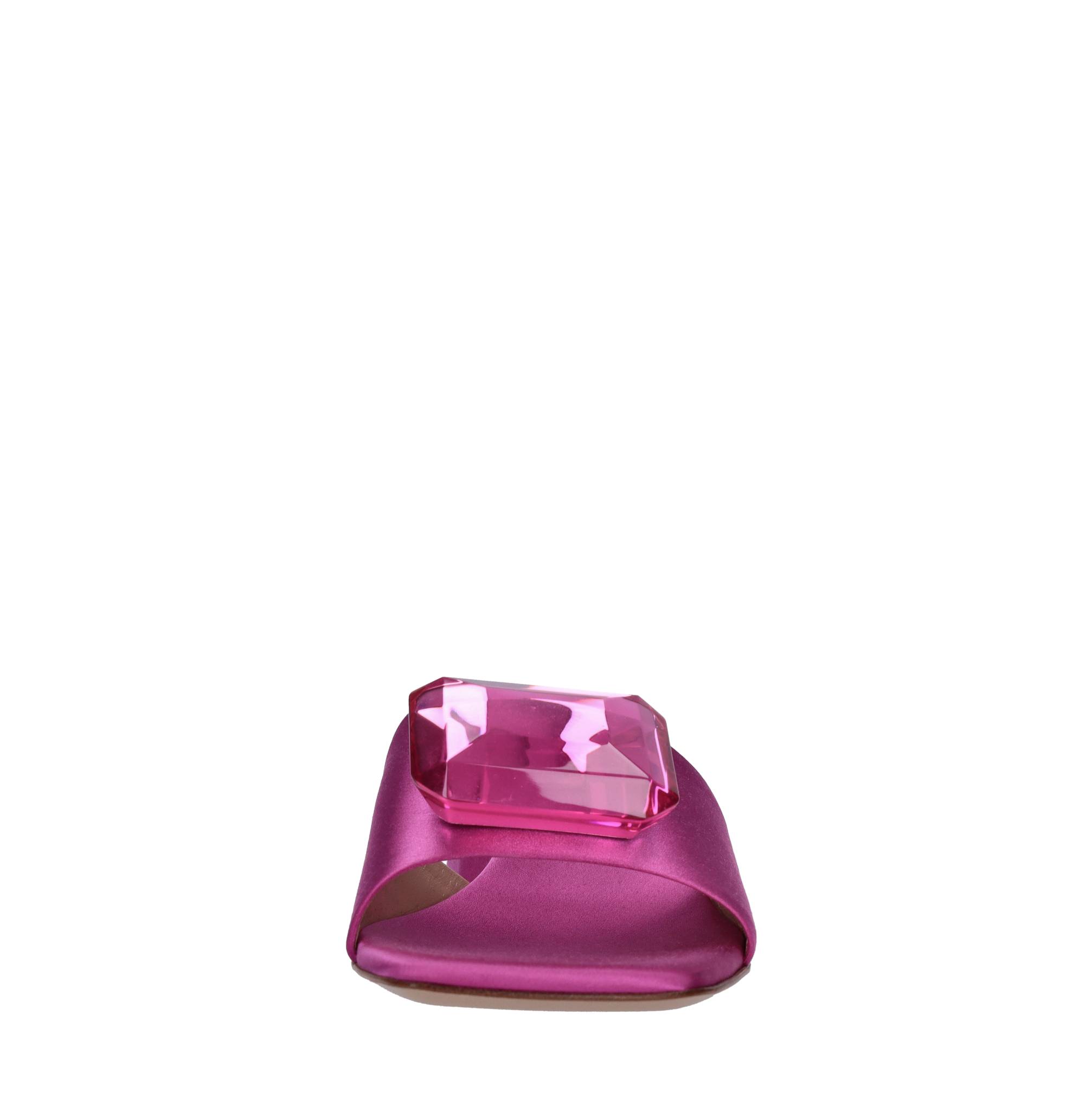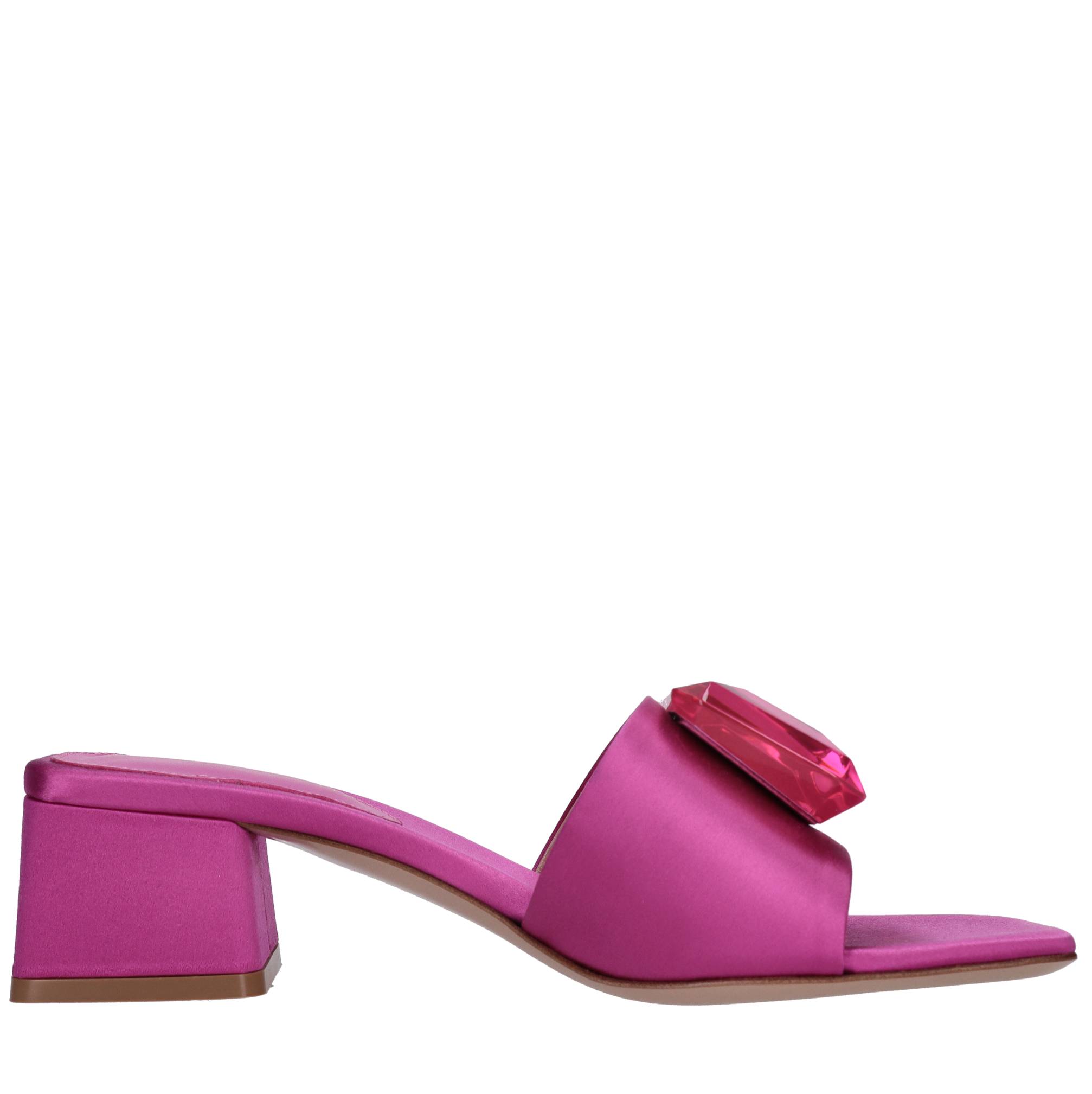 Mules en satinado. Suela exterior de cuero. Parte superior interna en satinado y cuero. Aplicación plexi de piedra.