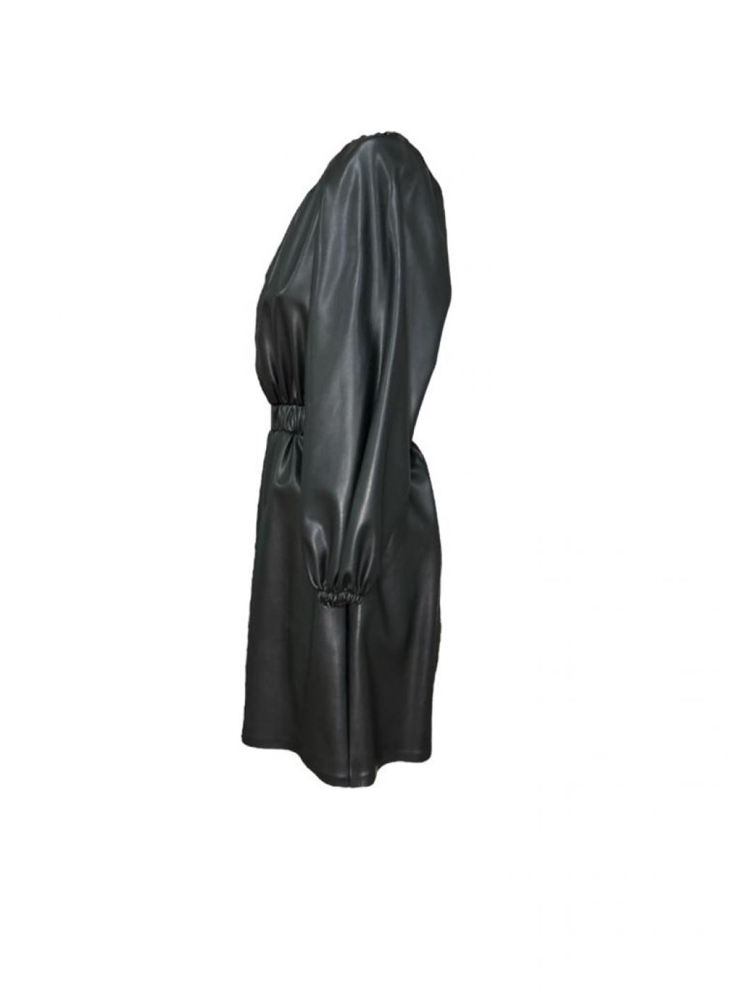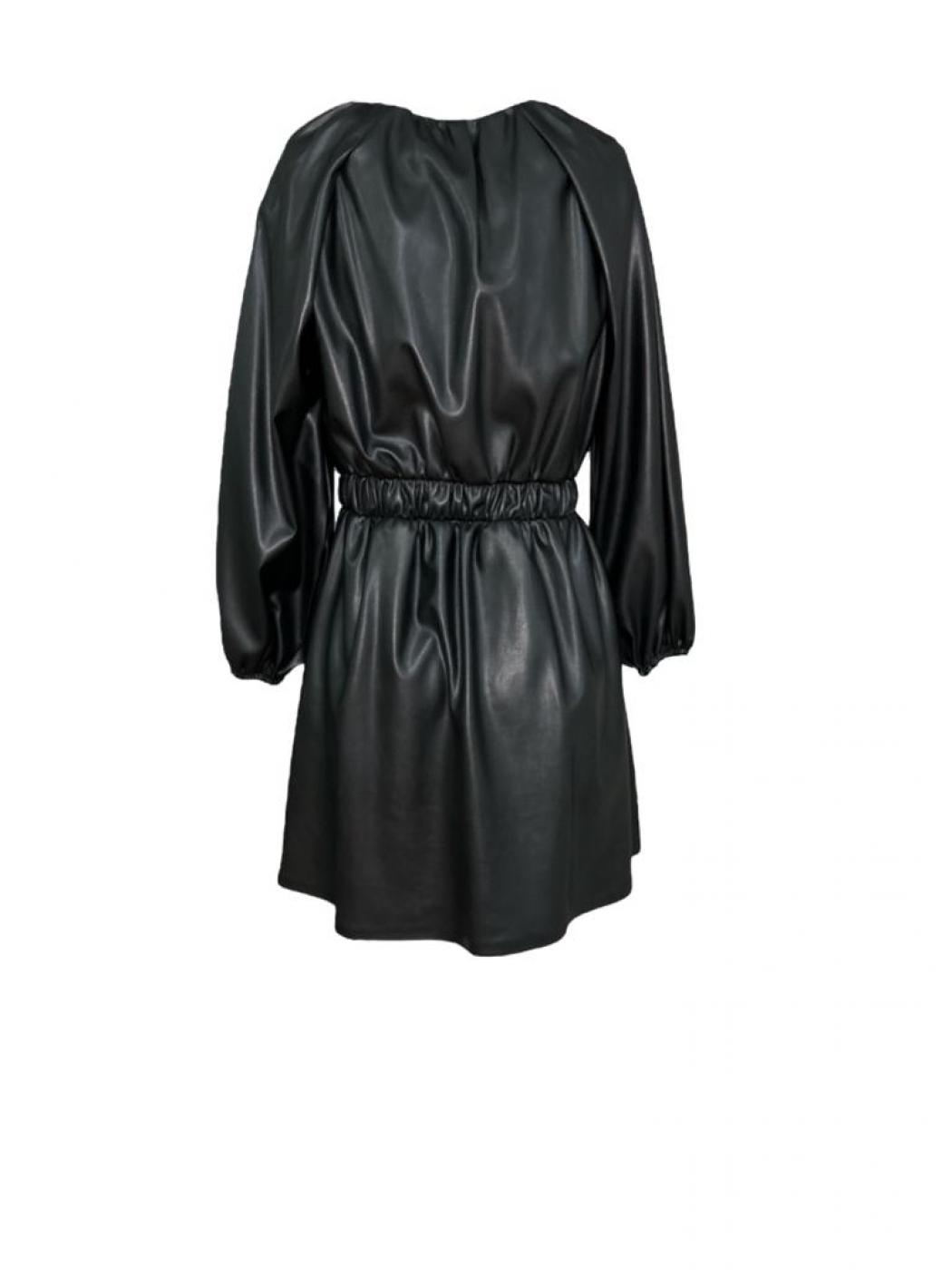 Vestido de manga larga en tela de cuero negro. Cuello redondo con cintura elástica, falda a flar para completar un aspecto grasiento.