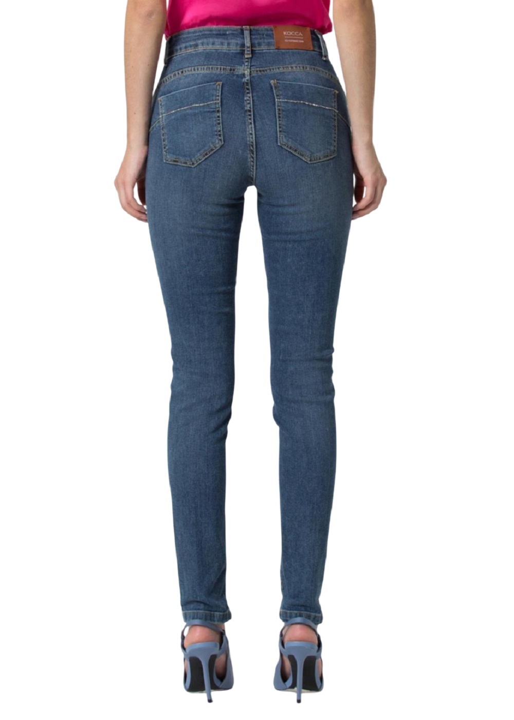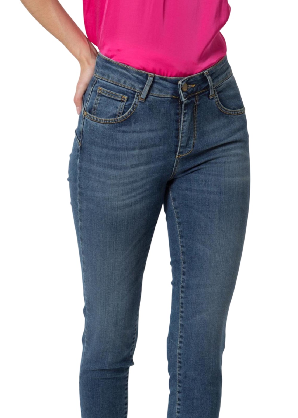 Vaqueros femeninos, algodón elástico, con ajuste adherente. Modelo de cinco bolsillos con costuras contrastantes, bucles de cinturón, efecto ligeramente decolorado y bigote en la parte delantera