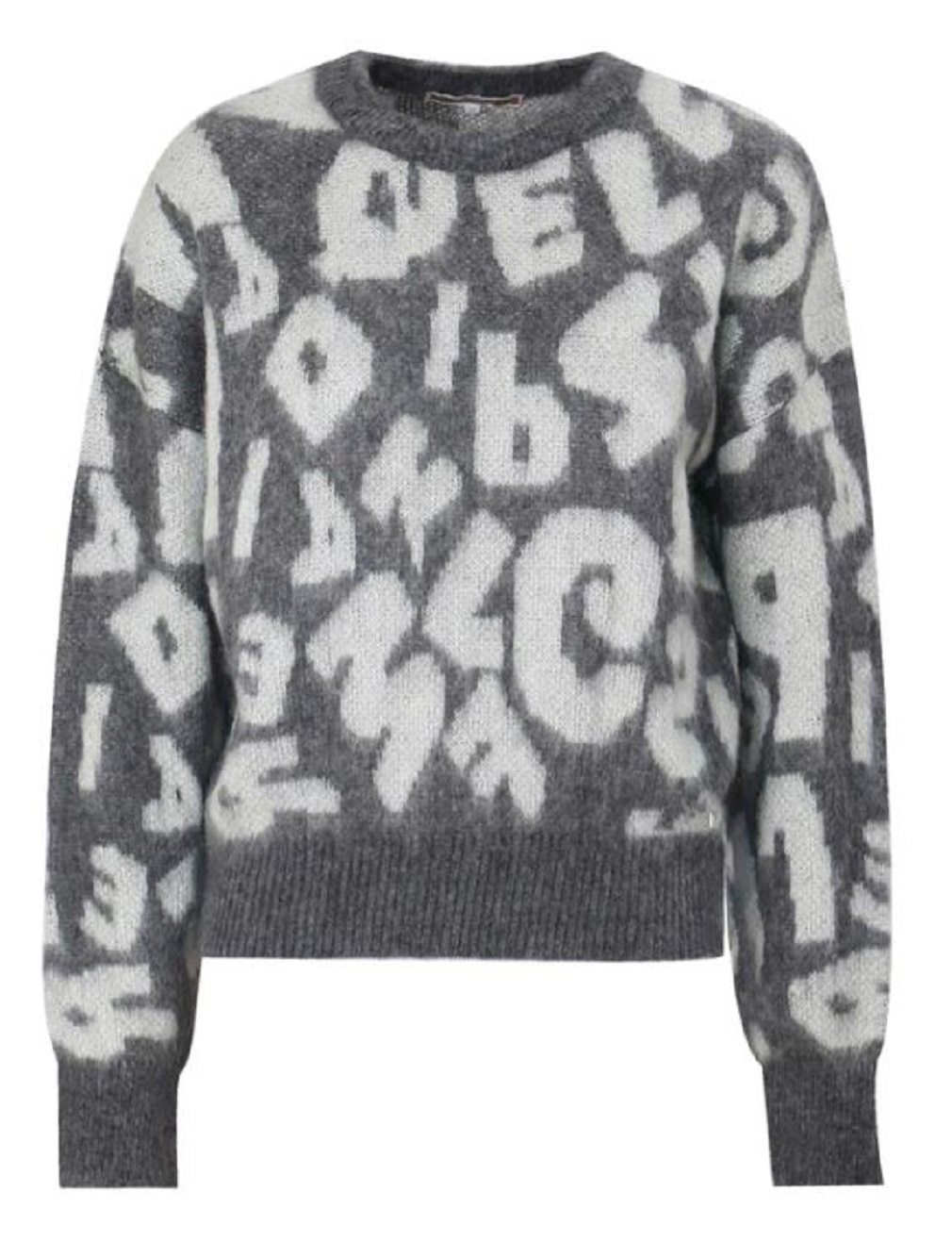 Jersey de mujer de manga larga, hombros caídos y cuello redondo. Delicado estampado de letras en color crema sobre fondo gris, bajo, puños y cuello redondo en contraste. Perfecta para el invierno, se adapta a todo tipo de vaqueros. COMPOSICIÓN 38% ACRÍLICO 32% POLIAMIDA 30% MOHAR