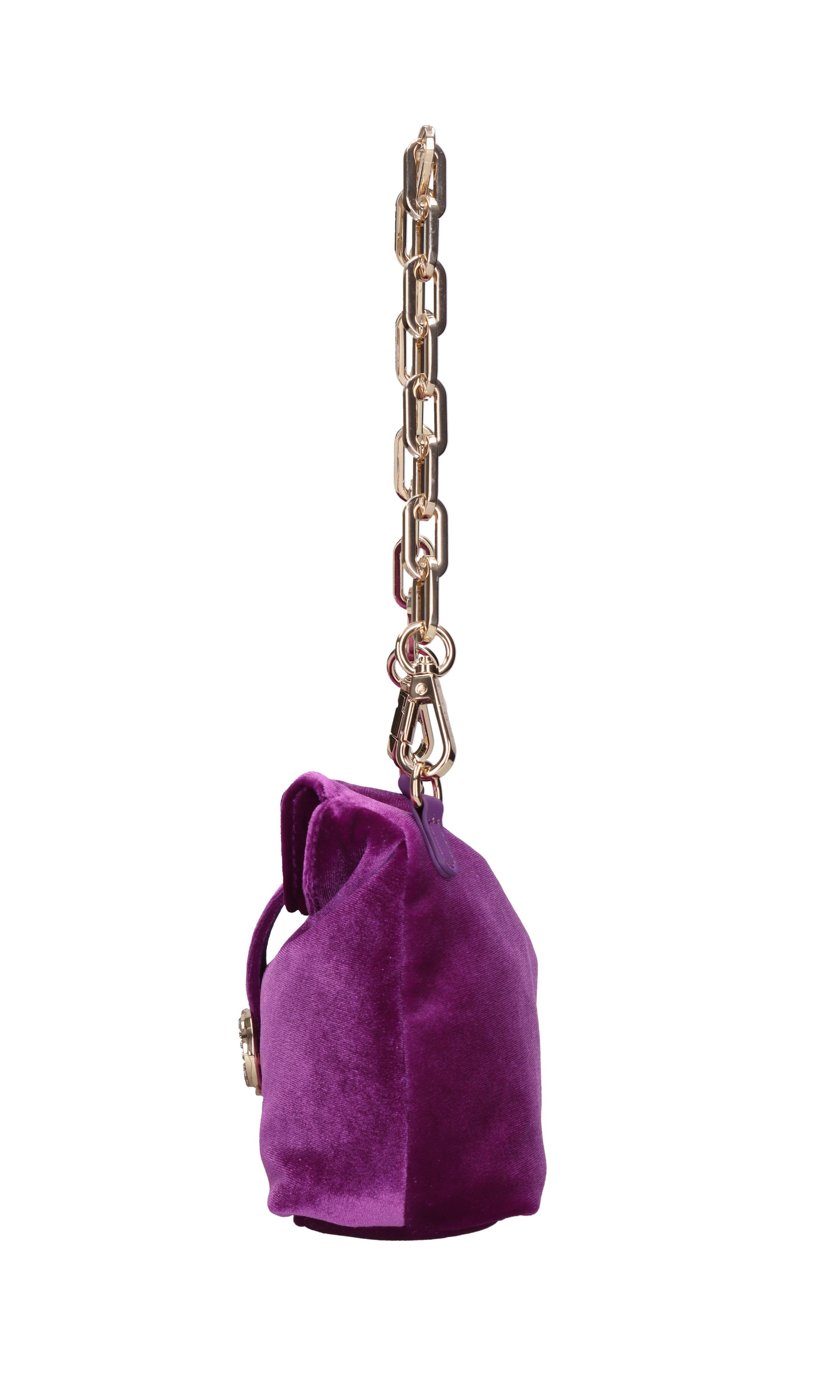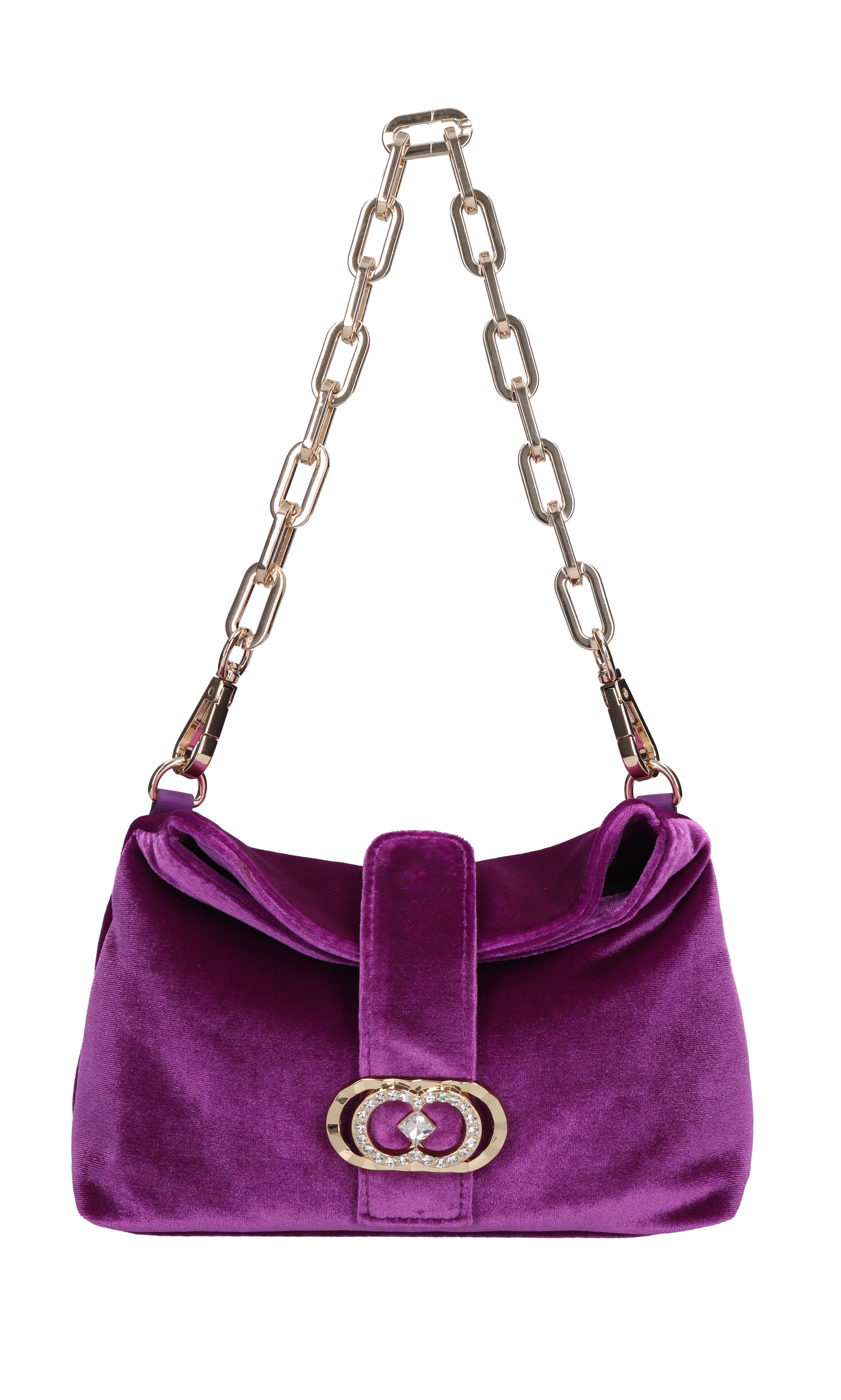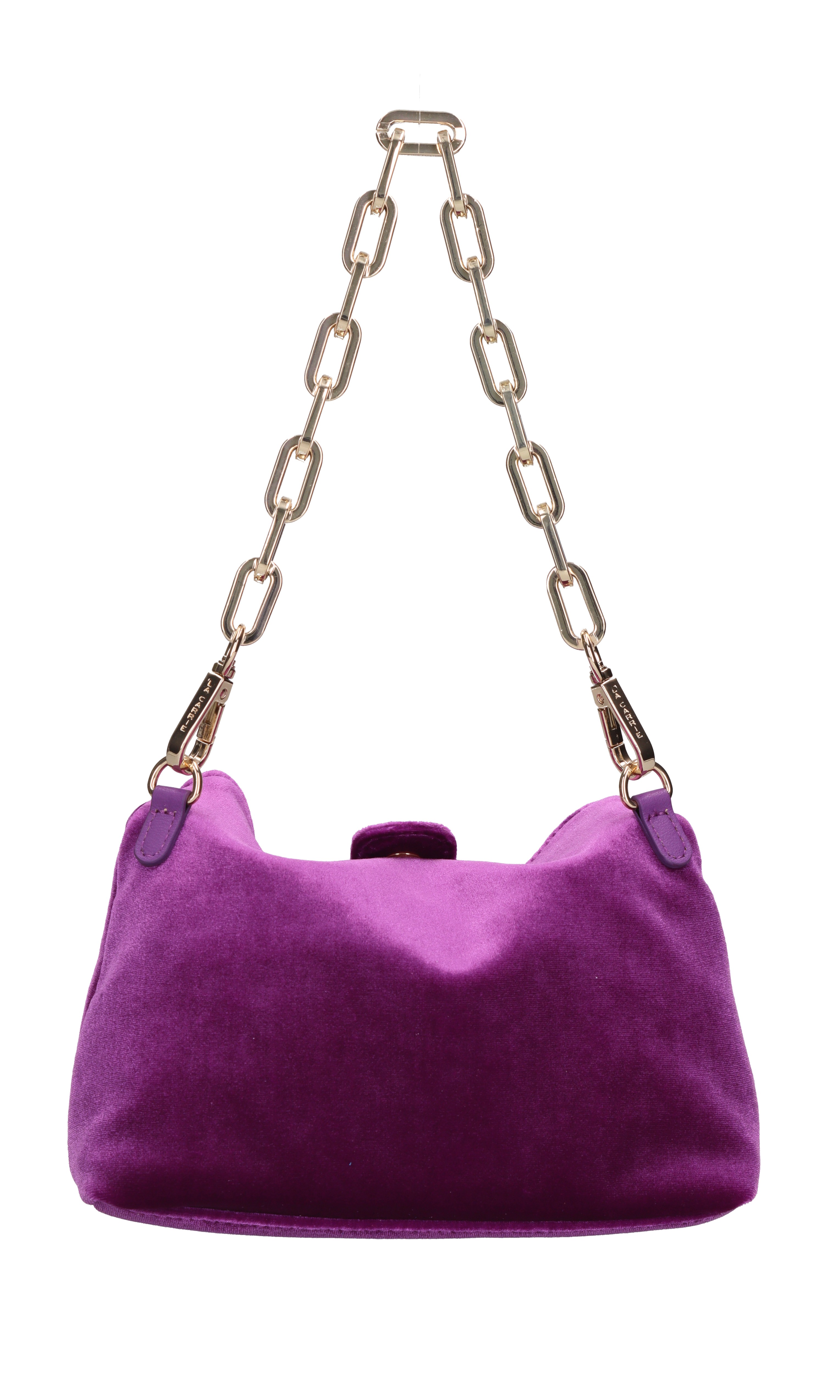 Bolsa de terciopelo de la edición nocturna. Un compartimento. Hebilla Jewel. Cierre con solapa y botón magnético. Mango de cadena de oro. Correa de hombro de cadena dorada extraíble.