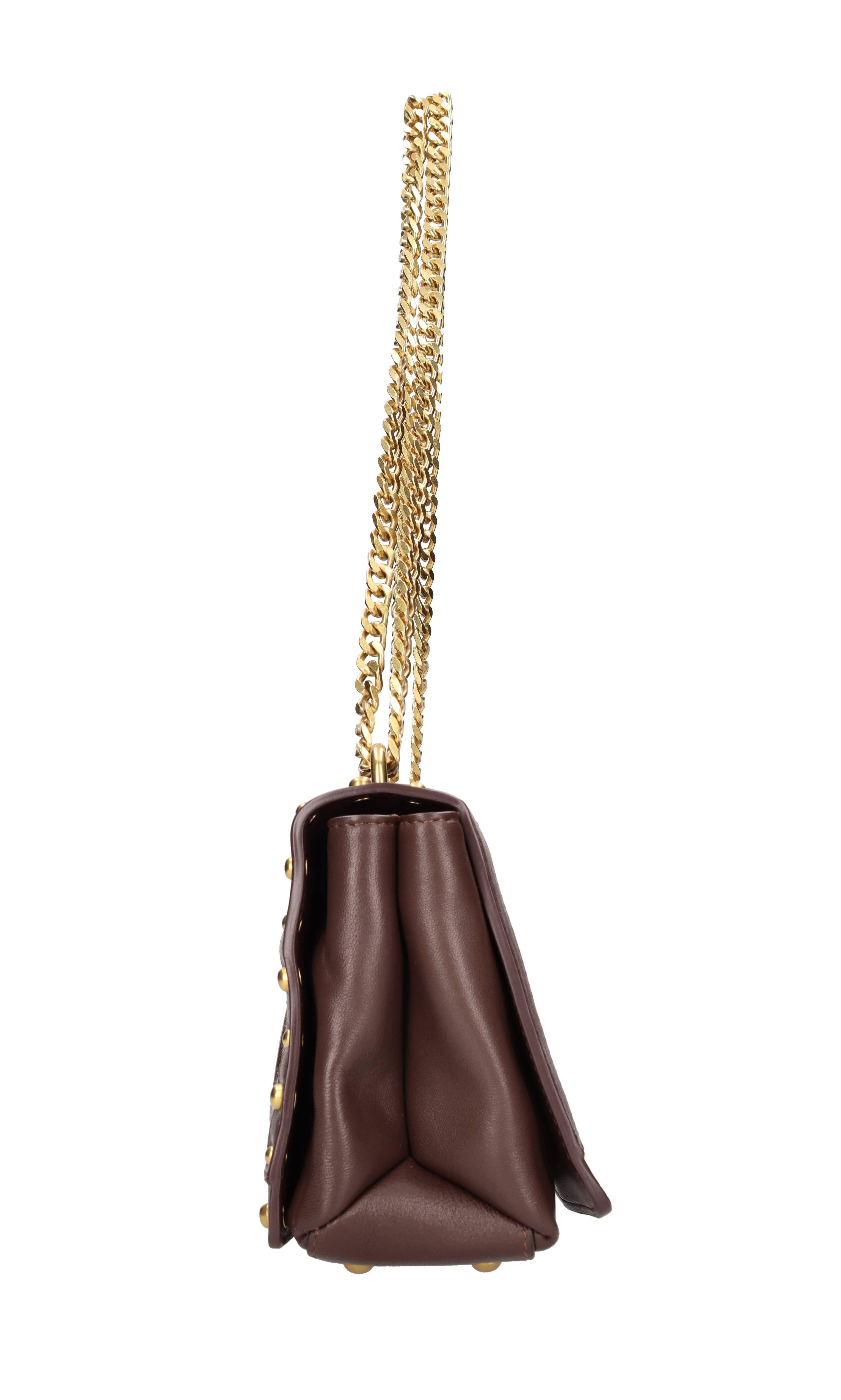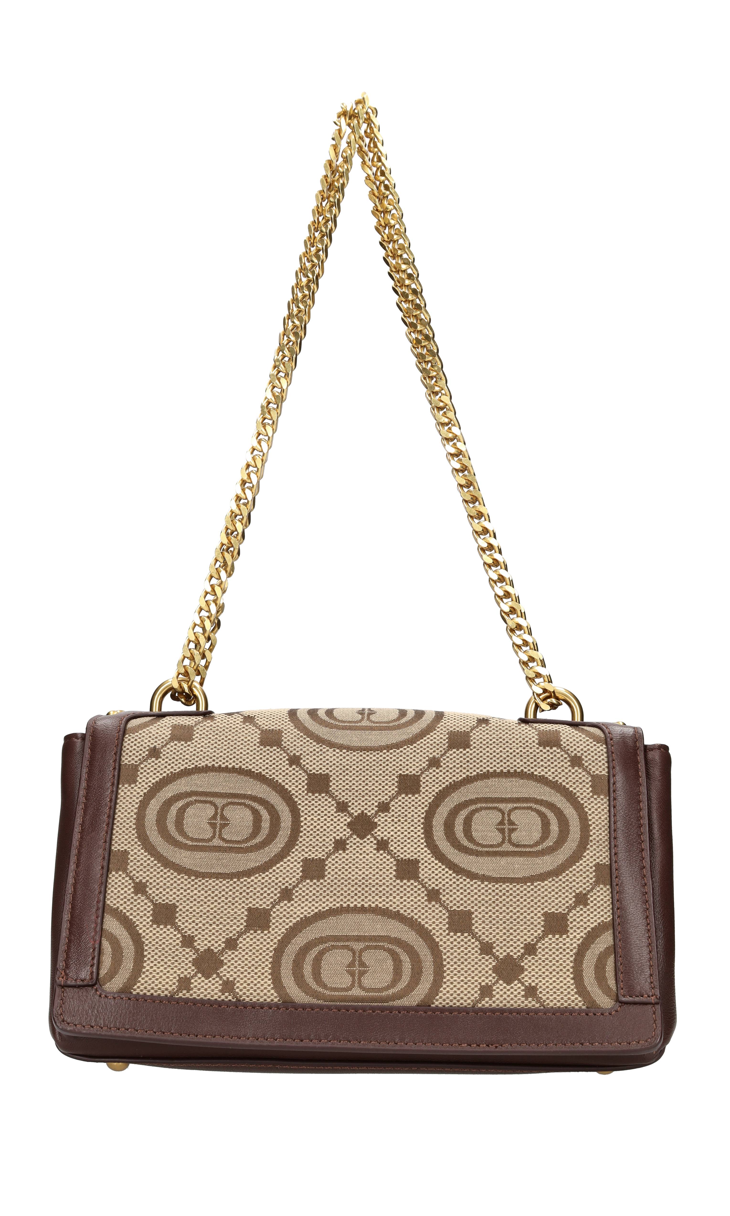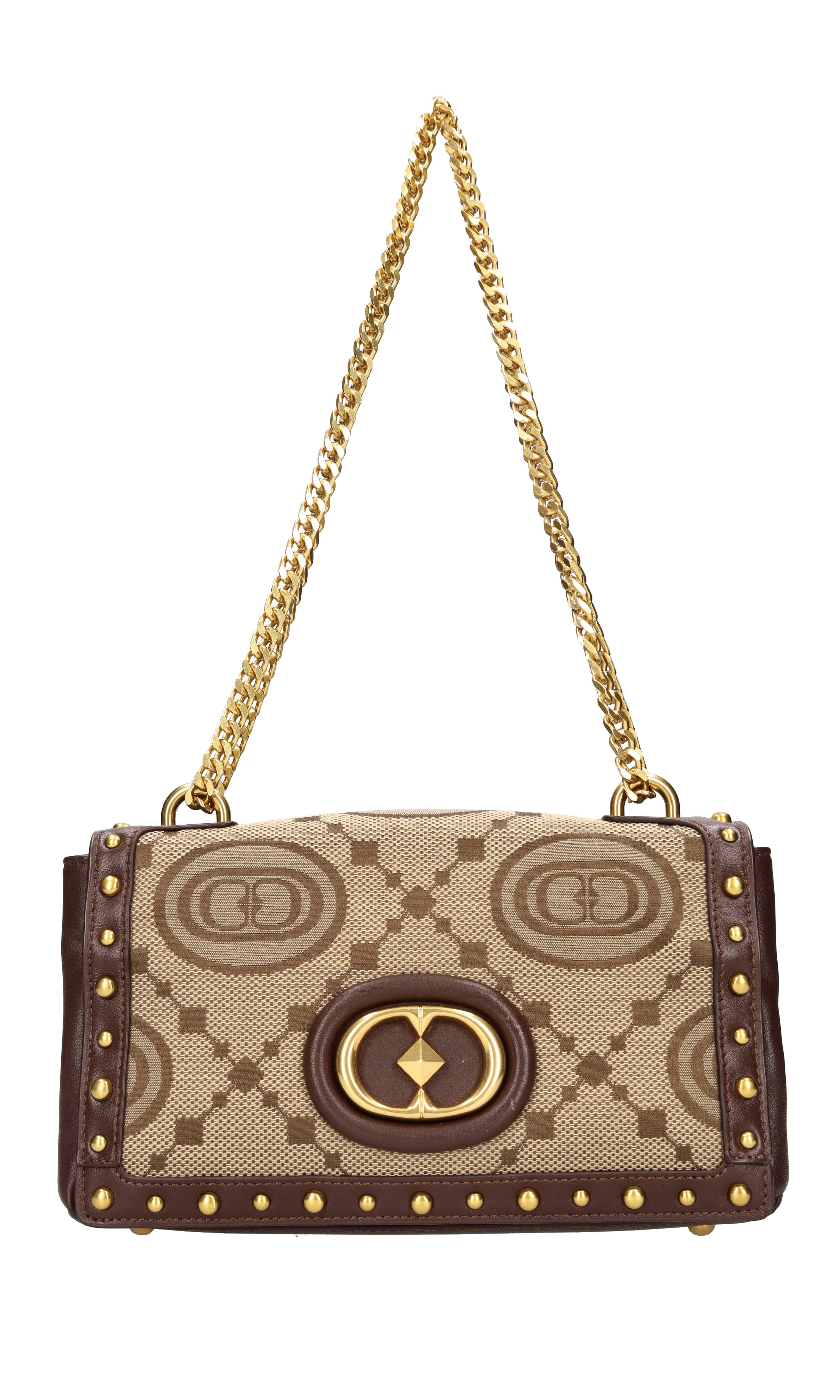 Bolso de cuero y tela. 1 compartimiento. Cierre con solapa y gancho. Correa de cadena.