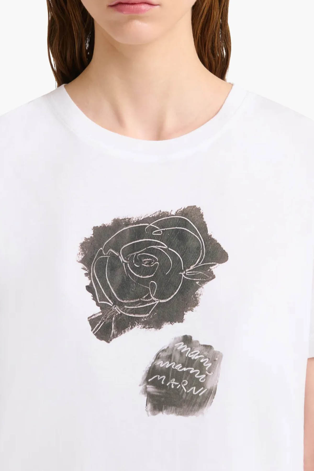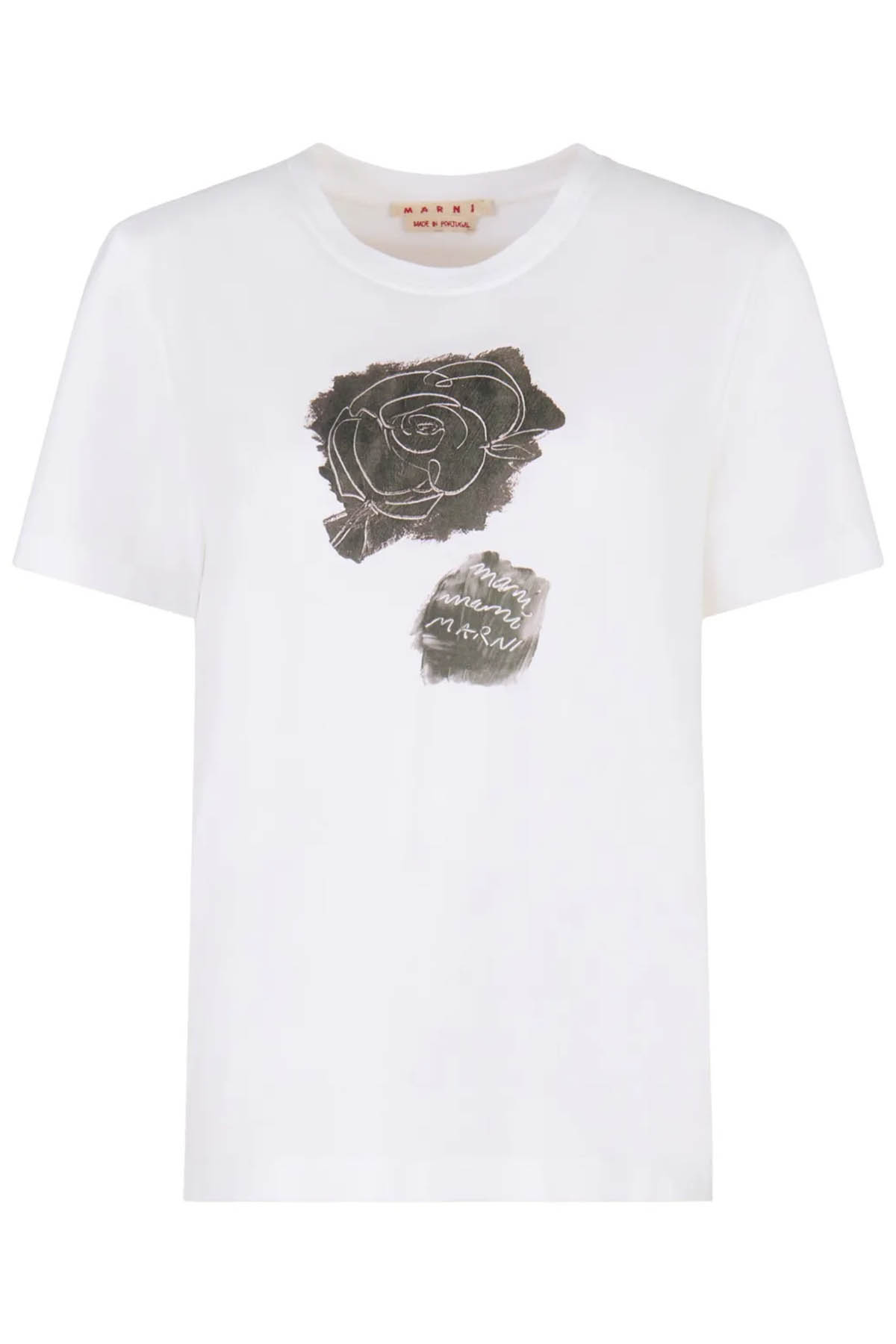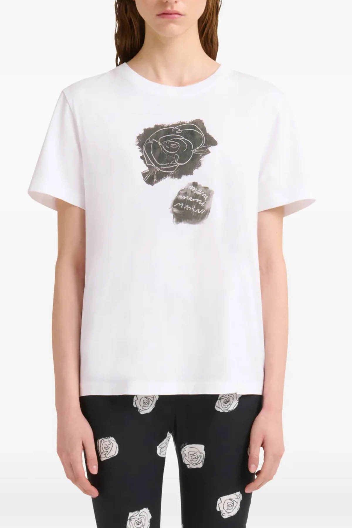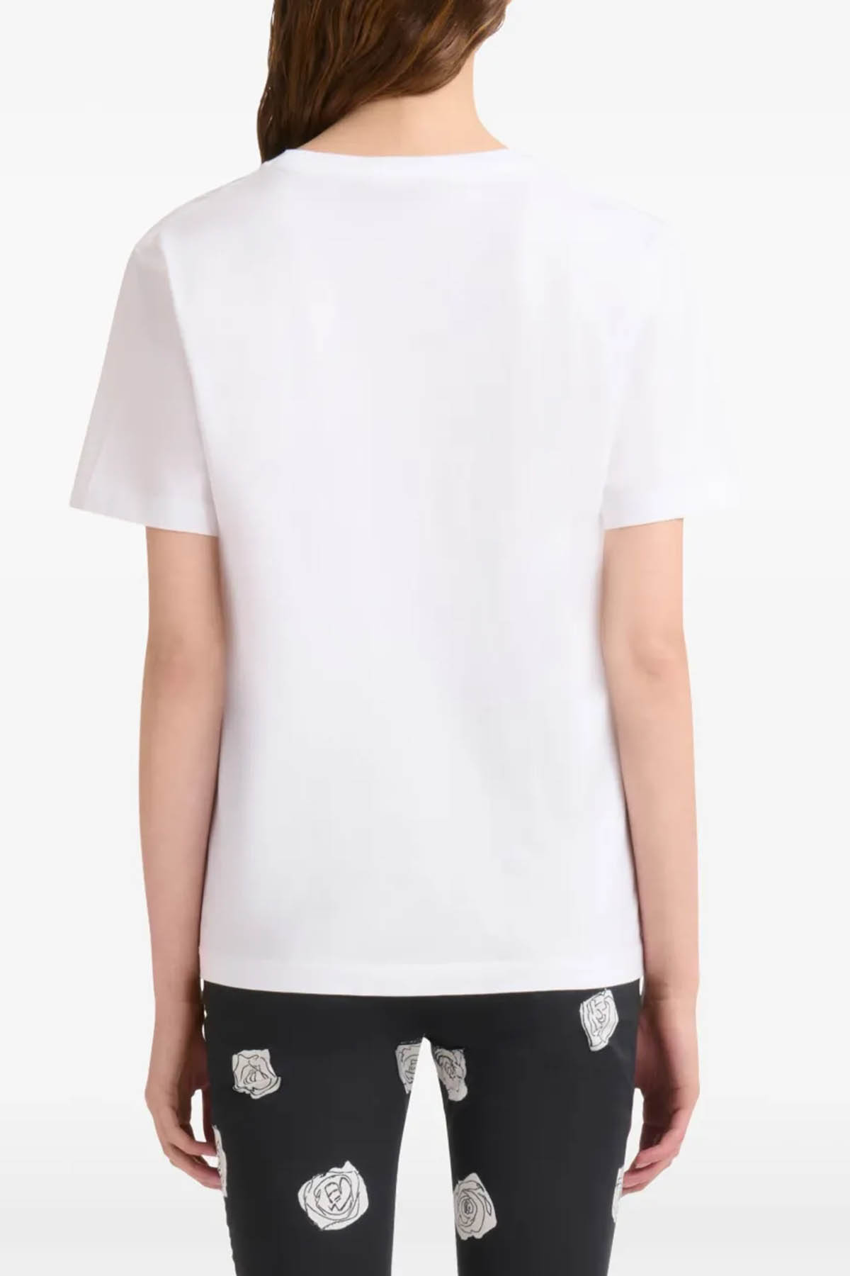 Patrón de cuello redondo, manga corta, borde recto, impresión frontal. Composición 100% Made in Italy