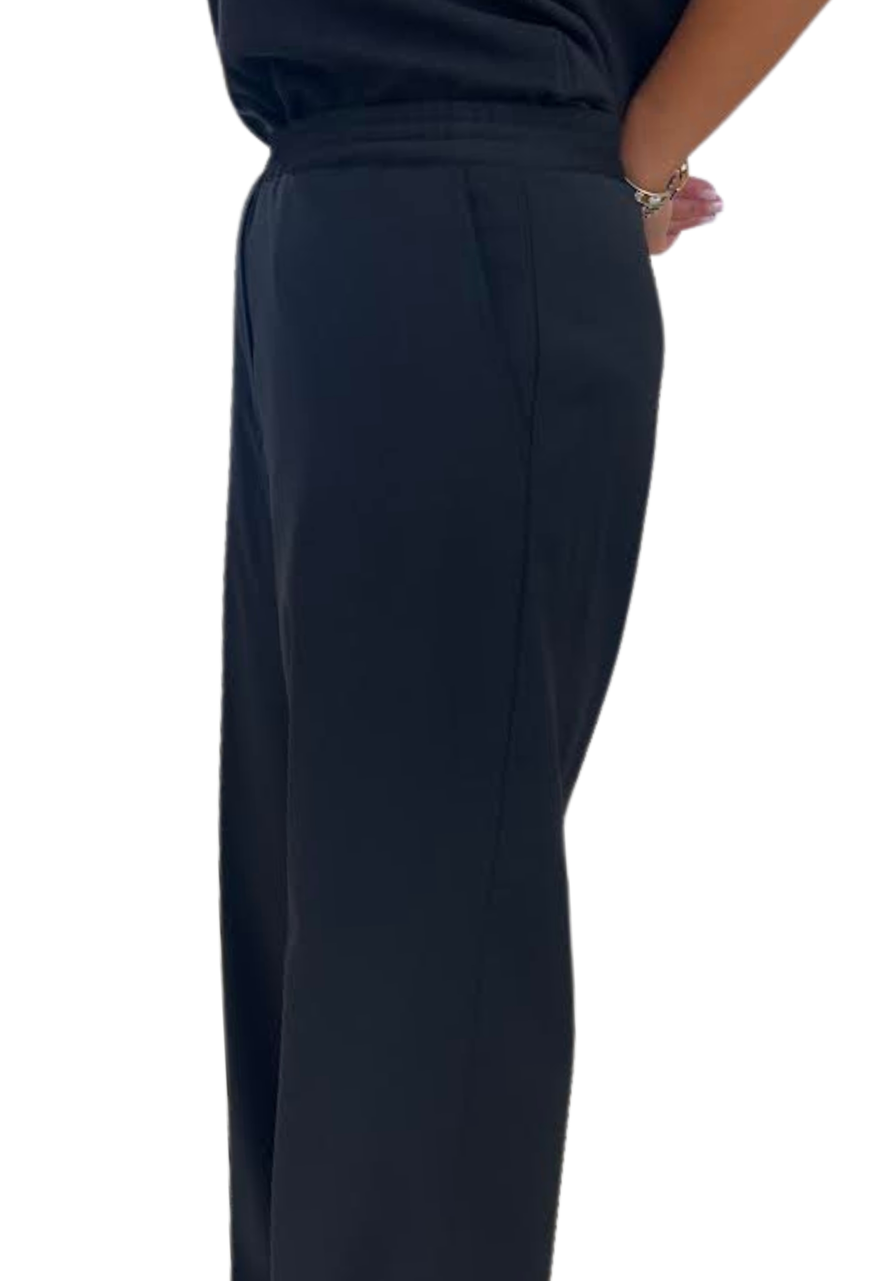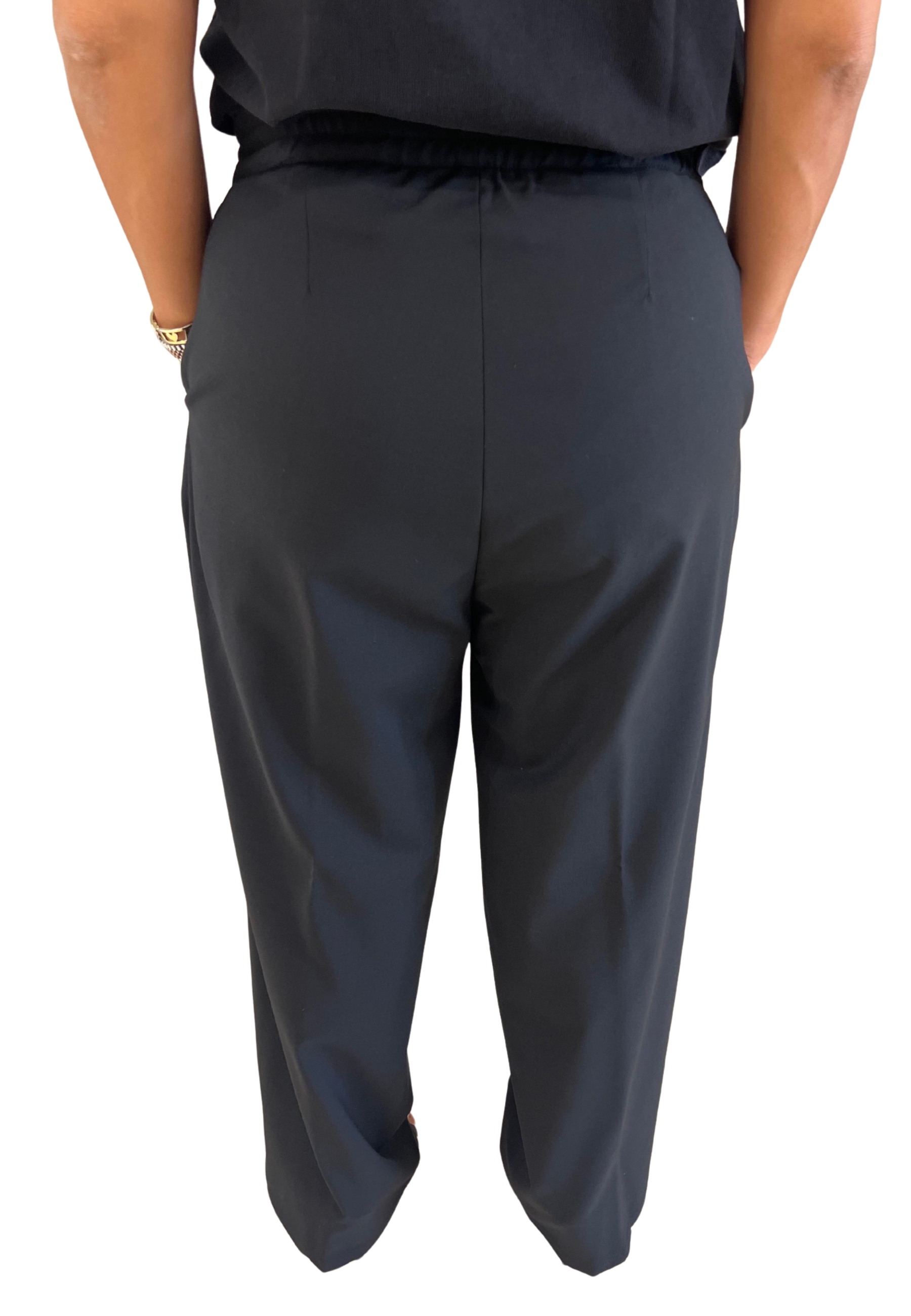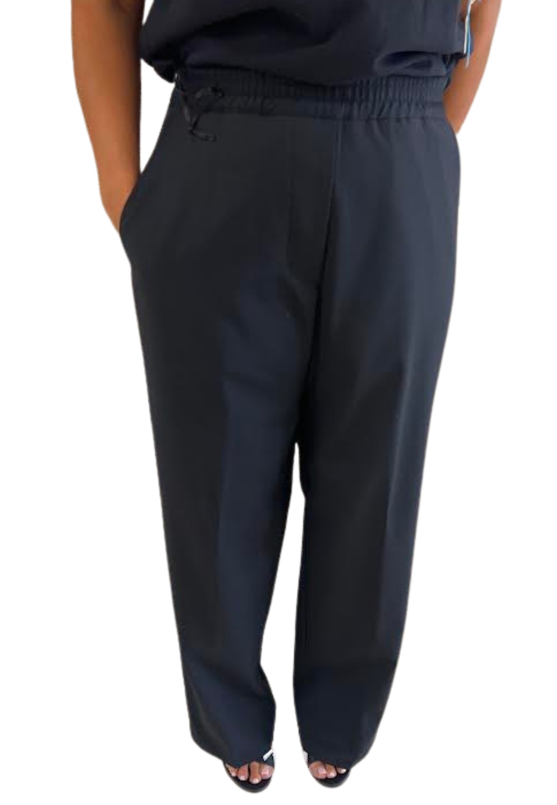 Pantalón negro con corte recto y cómodo, con cintura elástica y cordón ajustable. Equipado con bolsillos laterales, combina estilo y practicidad. El tejido ligero y fluido lo hace ideal para un aspecto casual pero bien cuidado.