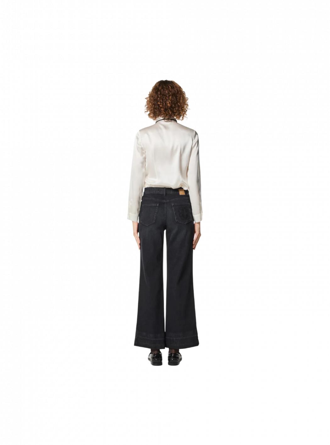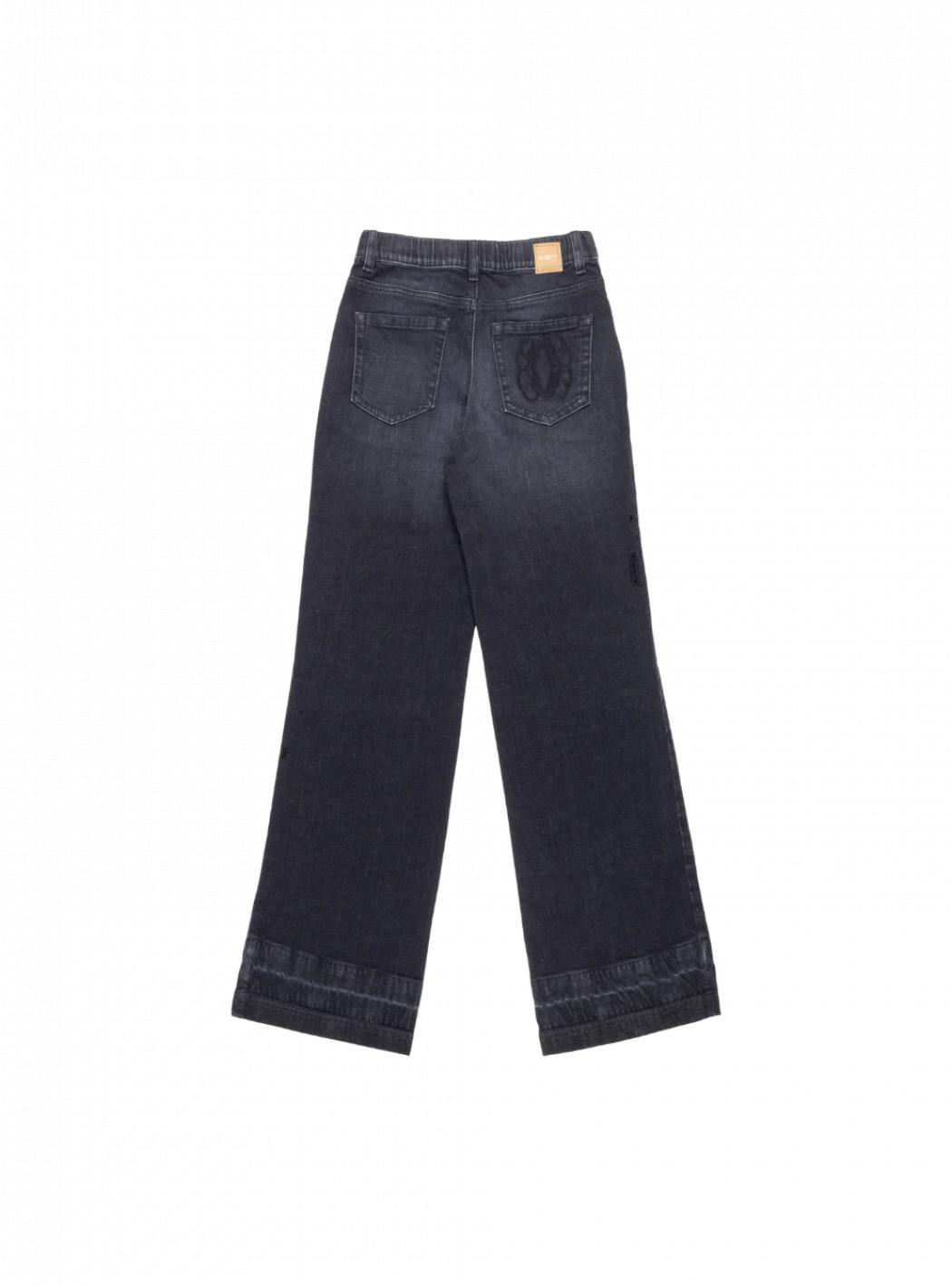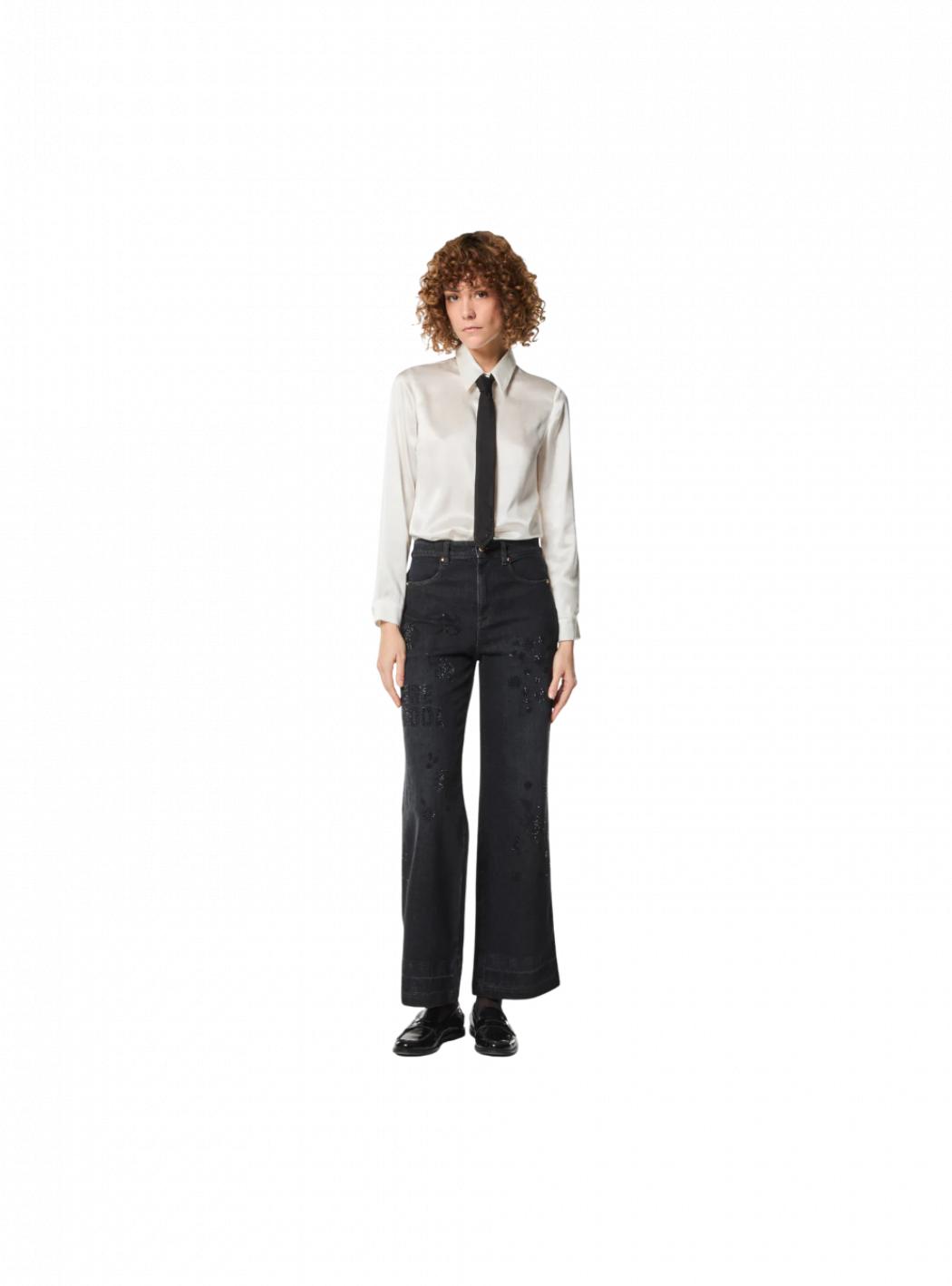 Pantalón de patas rectas con confort negro denim con diamantes de imitación aplicados en la parte delantera. El tejido elástico garantiza un confort y un ajuste perfectos. Los rhinestones añaden un toque brillante y glamoroso, haciendo la prenda ideal para un look elegante y contemporáneo.