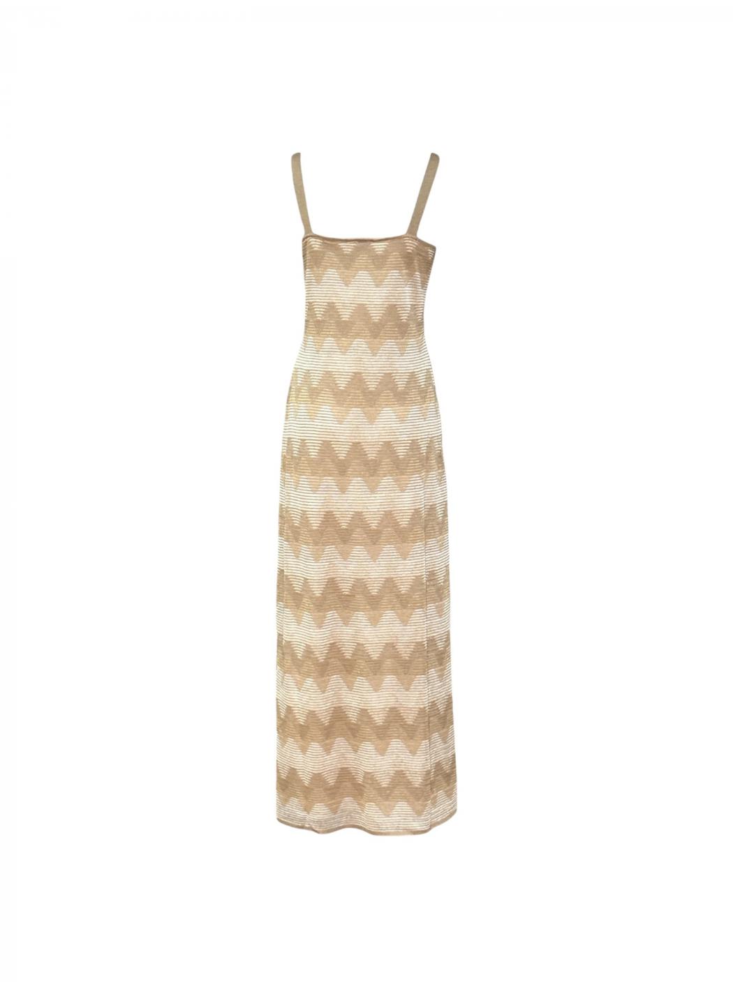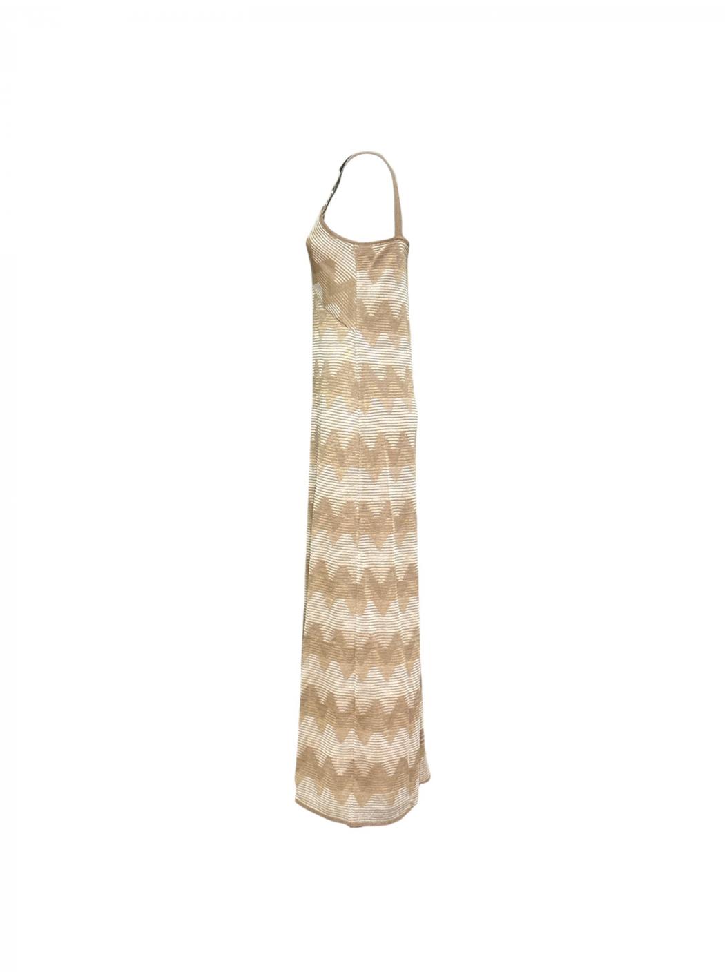Vestido de punto largo con anillos de metal en las correas de hombro y escote V, caracterizado por un efecto de onda multicolor que crea un juego de tono dinámico y moderno. Perfecto para aquellos que buscan un aspecto original y refinado, una elegante prenda que combina comodidad y estilo contemporáneo.