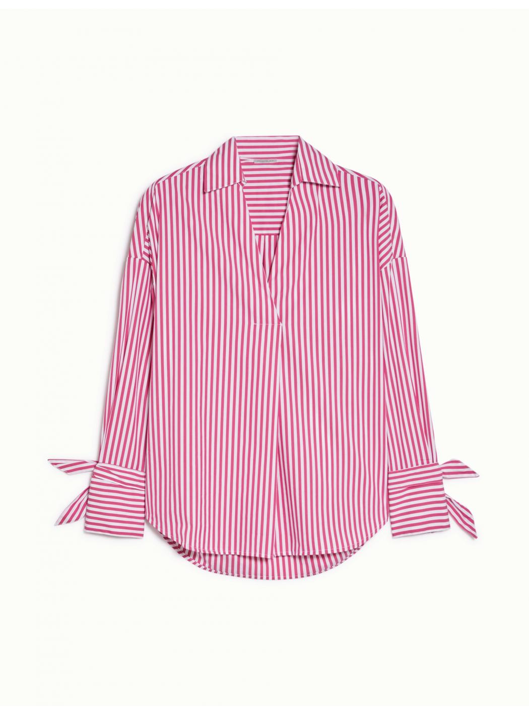 Golpe de gran tamaño en las púas rayadas. Tiene un corte recto con borde redondeado y alargado en la espalda. Camisa cuello, V escote y pliegue central en la parte delantera, carré y cañón en la espalda. Las muñecas altas con cordones desmontables y las aberturas laterales en la parte inferior.