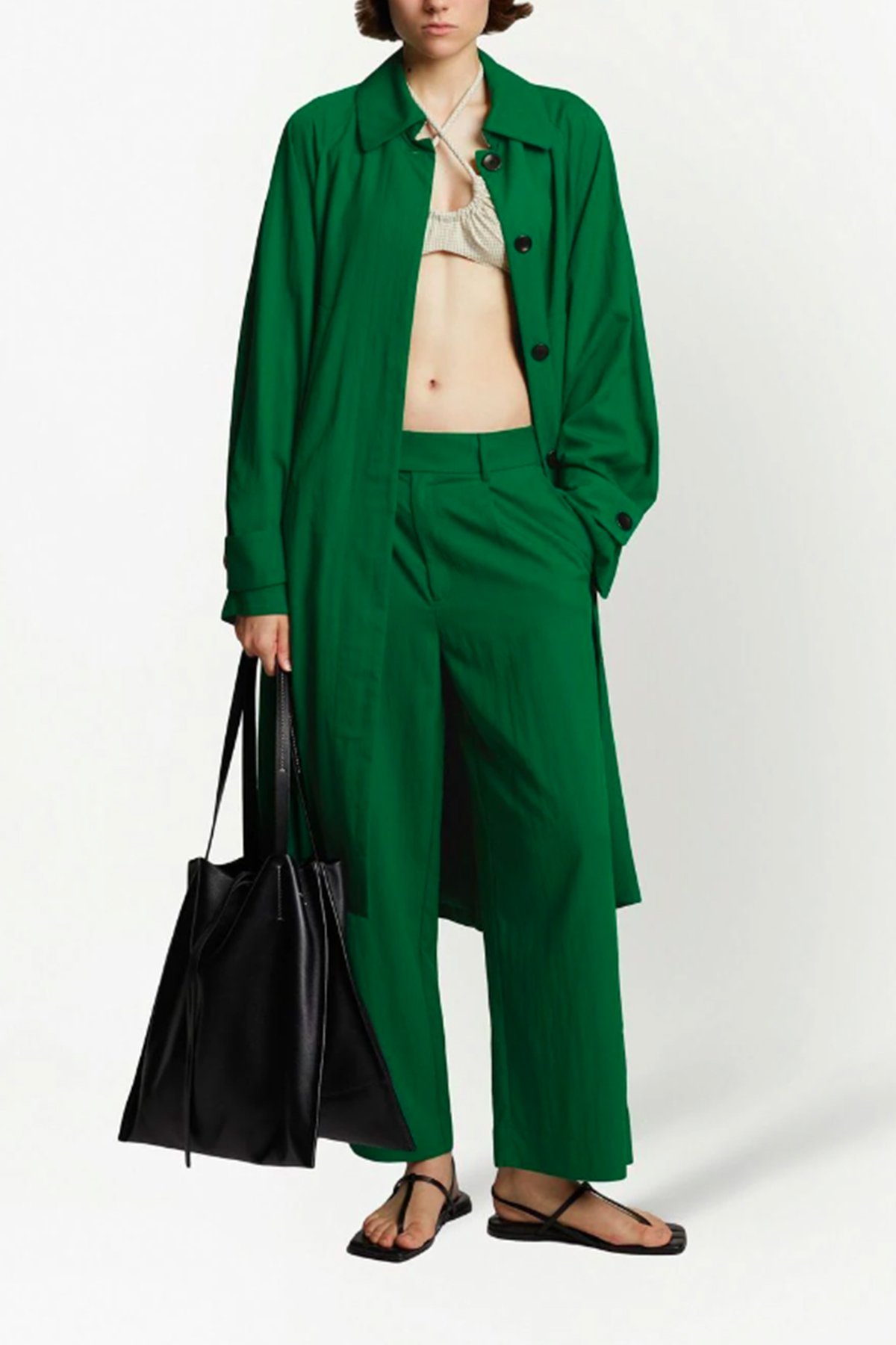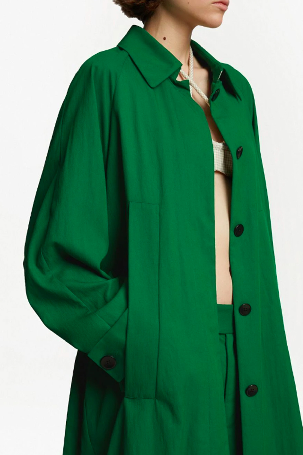 Con cinturón en la cintura, cuello clásico, cierre oculto con botones delanteros, mangas largas, puños con botones y dos bolsillos ribeteados laterales, corte bajo en los hombros y diseño de largo medio.