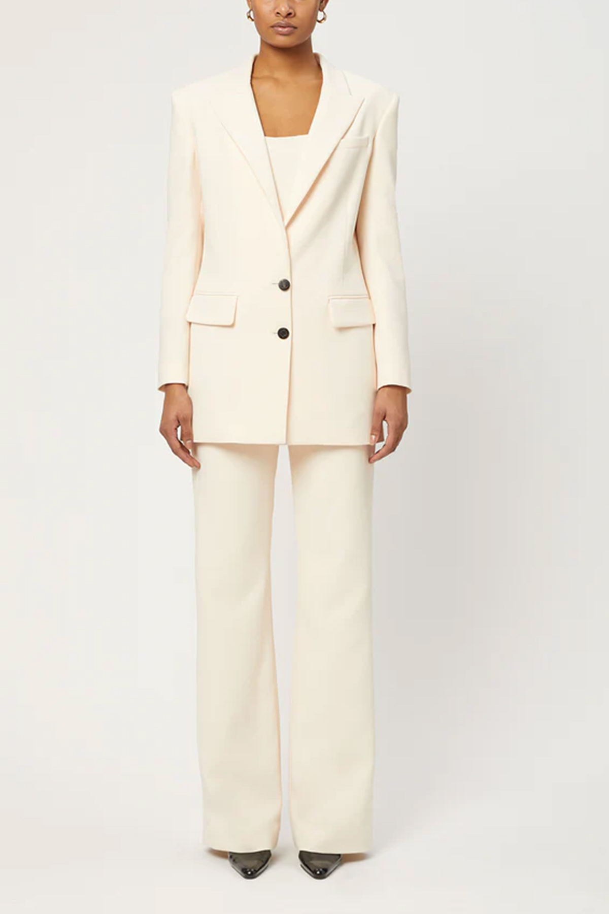 Diseño de botonadura sencilla, manga larga, cuello de pico, bolsillos laterales con solapa, tapeta delantera con botones en contraste. Composición 100%PL- Crepé Hecho en Italia