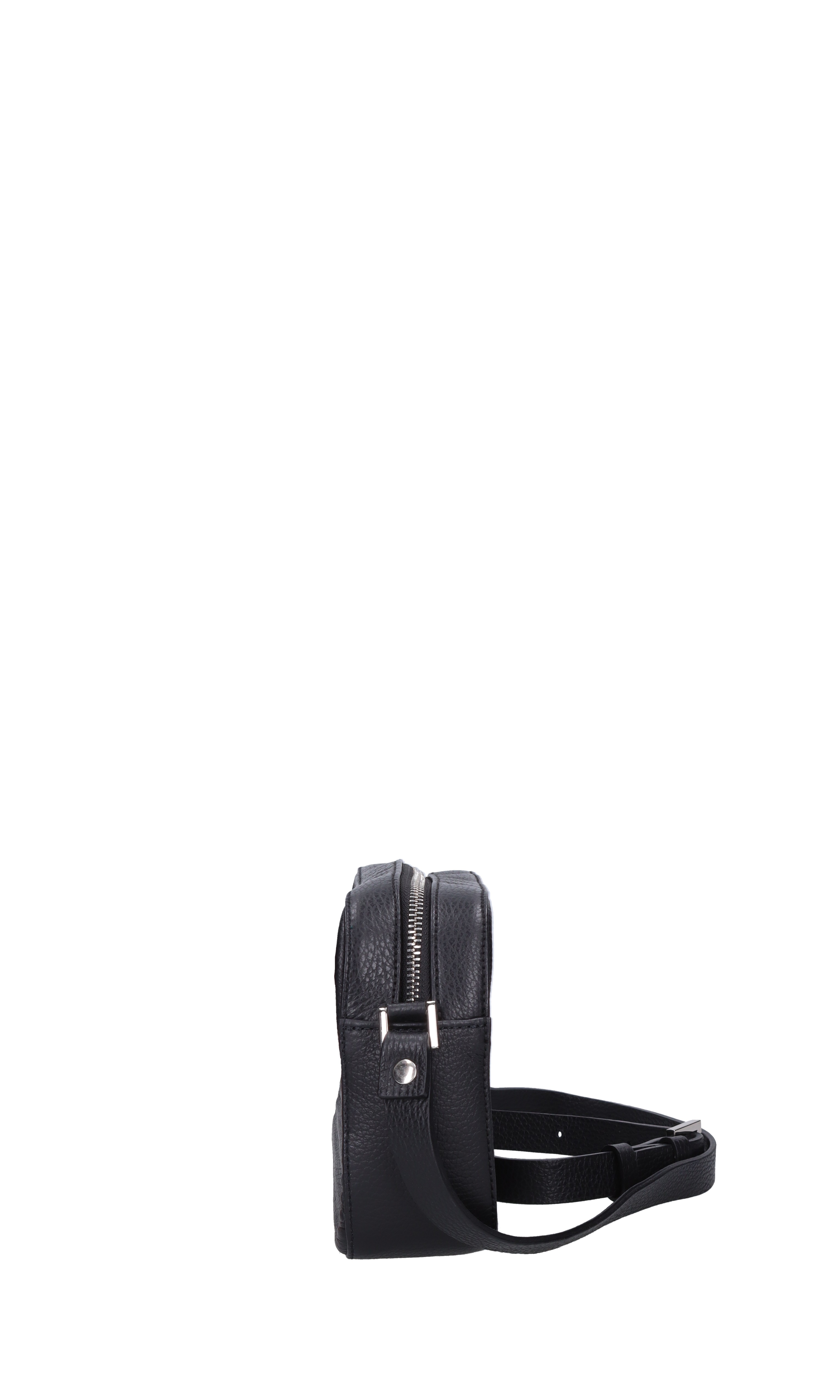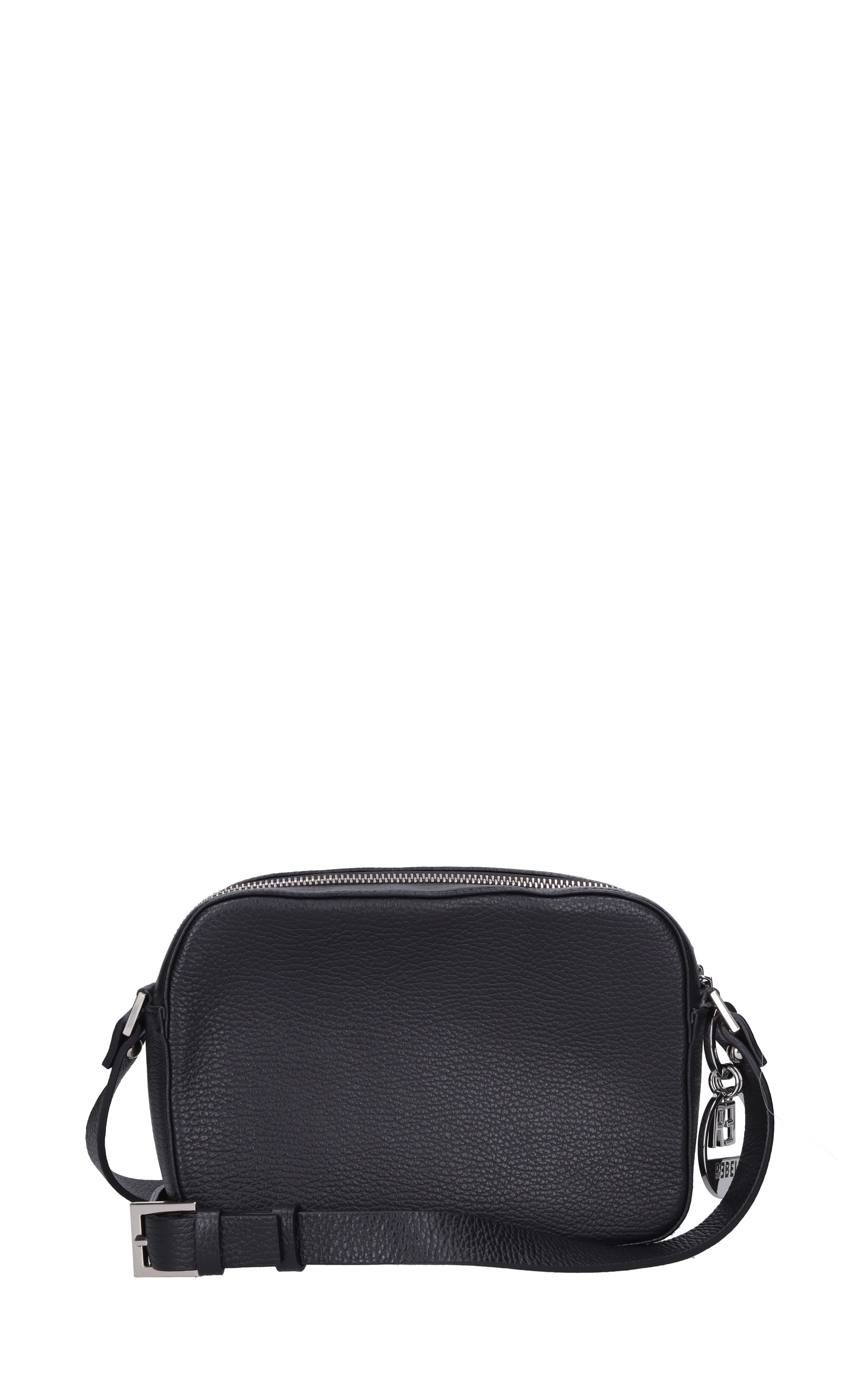 Bolso de cuero. 1 compartimento. Cierre con cremallera. 1 amuleto removible. Bandolera ajustable y extraíble.
