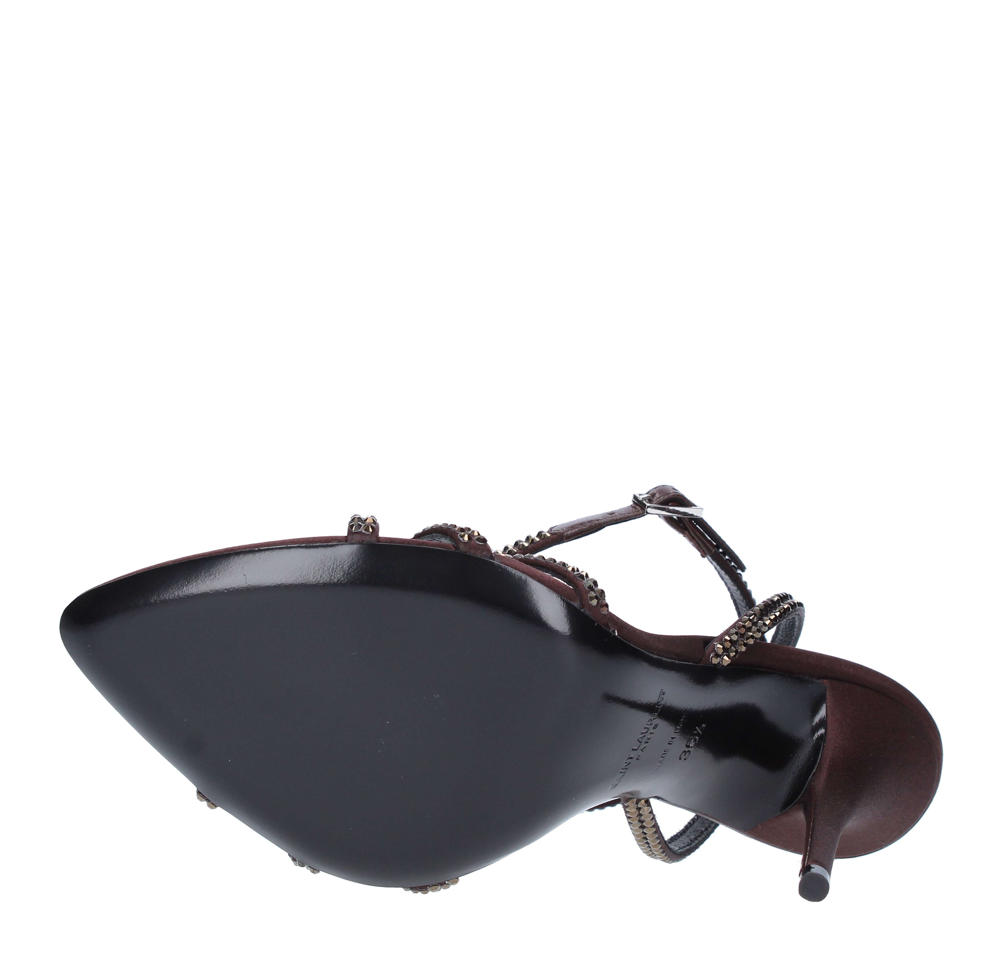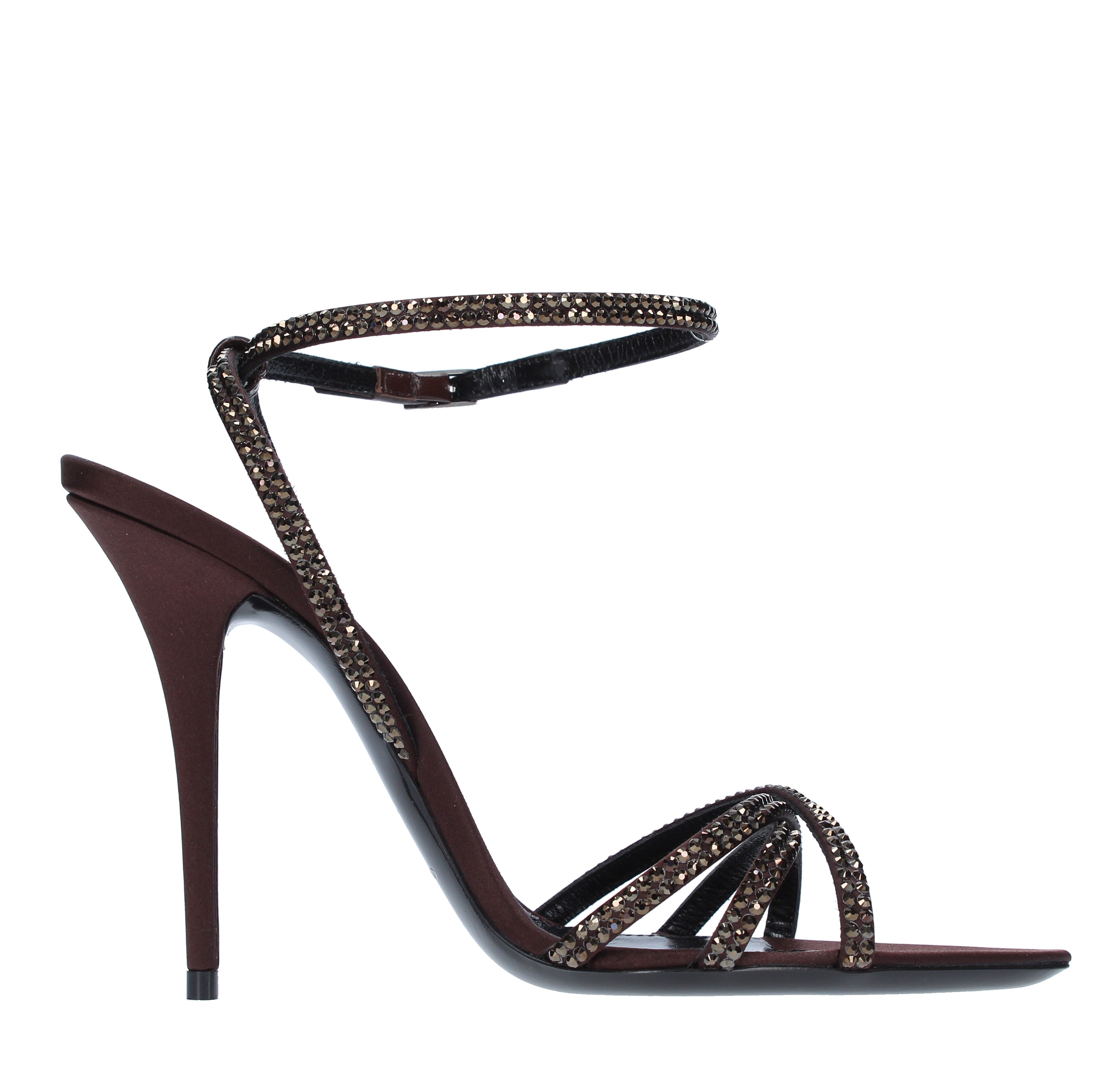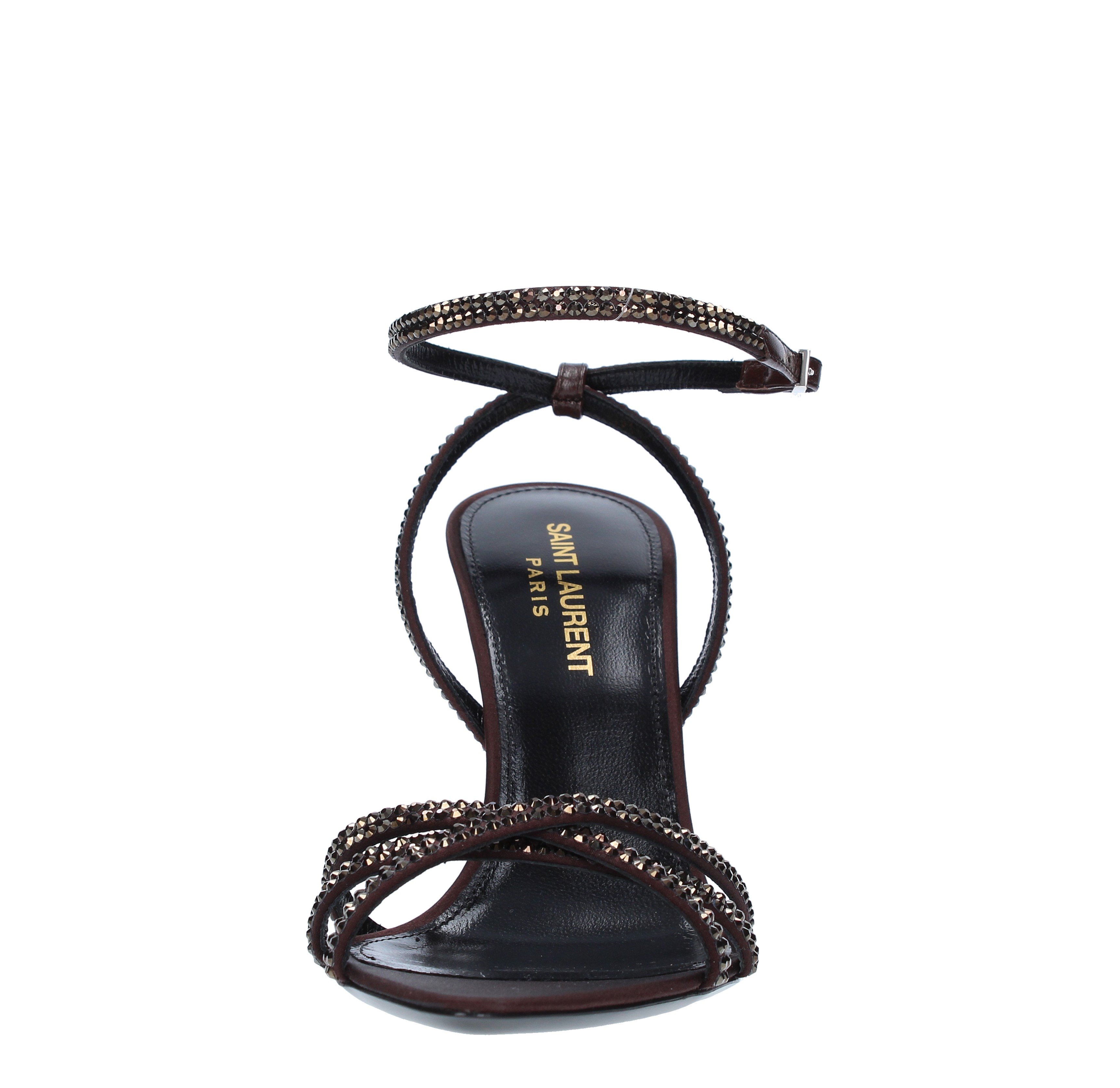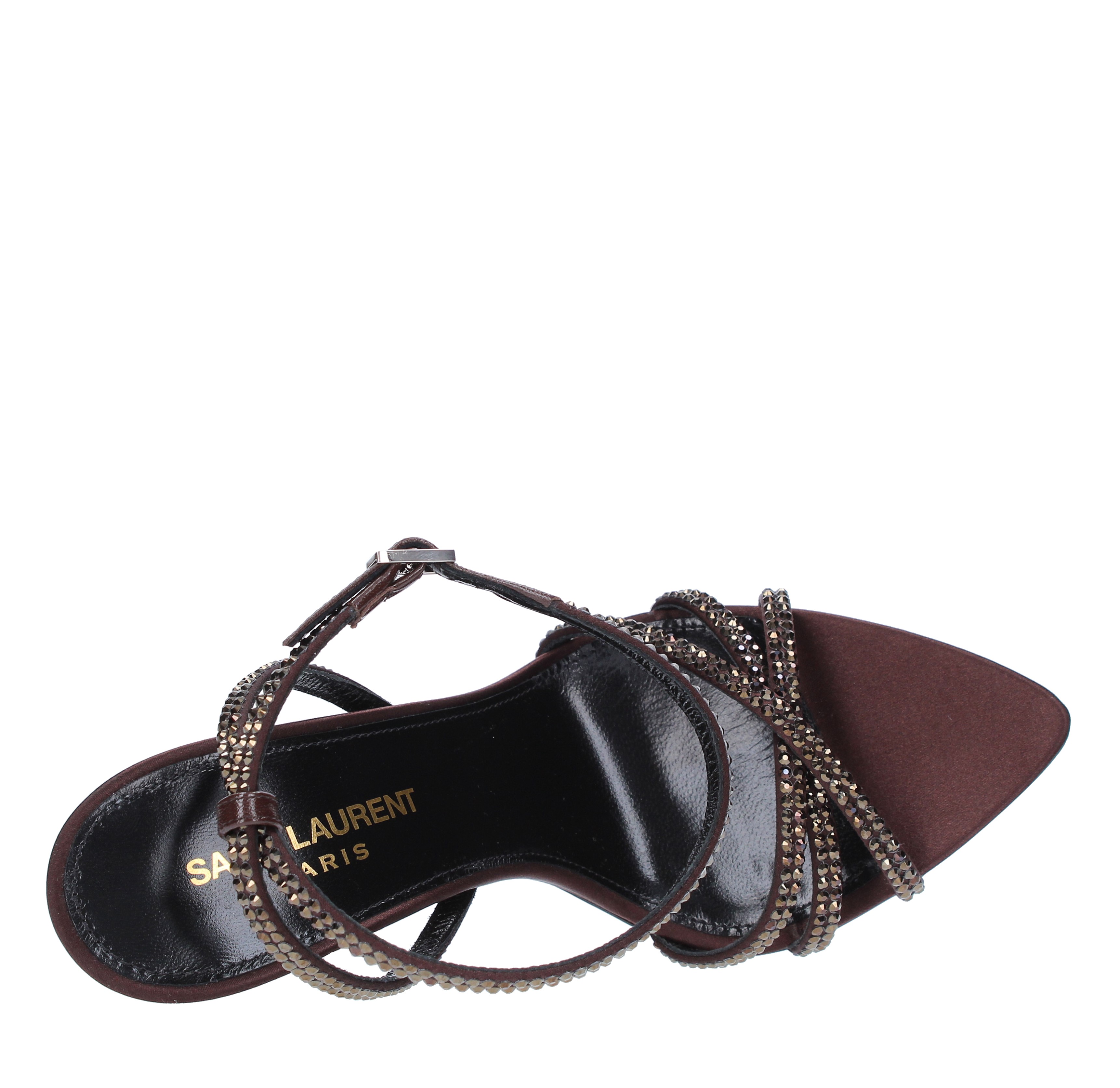 Sandalias SAINT LAURENT de satén y strass. Correa con hebilla. Suela exterior de cuero. Exterior de piel.