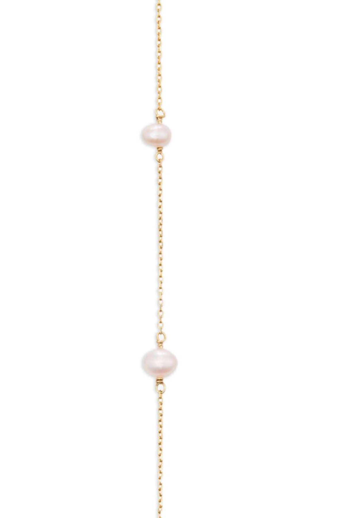 Modelo en color dorado, baño de oro de 18kt, detalle de perlas, diseño largo, detalle de cadena. También se puede llevar más corto gracias al doble giro. Composición Latón chapado en oro de 18kt.