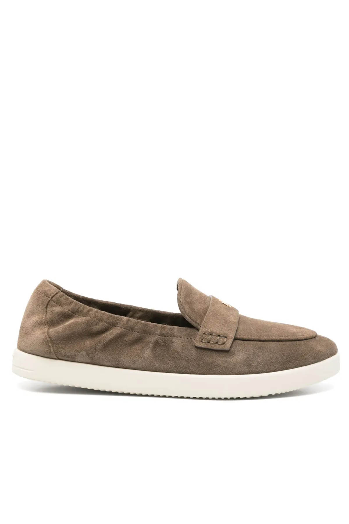 Modelo en suede, pequeño logotipo frente al oro, plantador acolchado en cuero, forro de nappa, suela de goma. Composition suede calf 100%