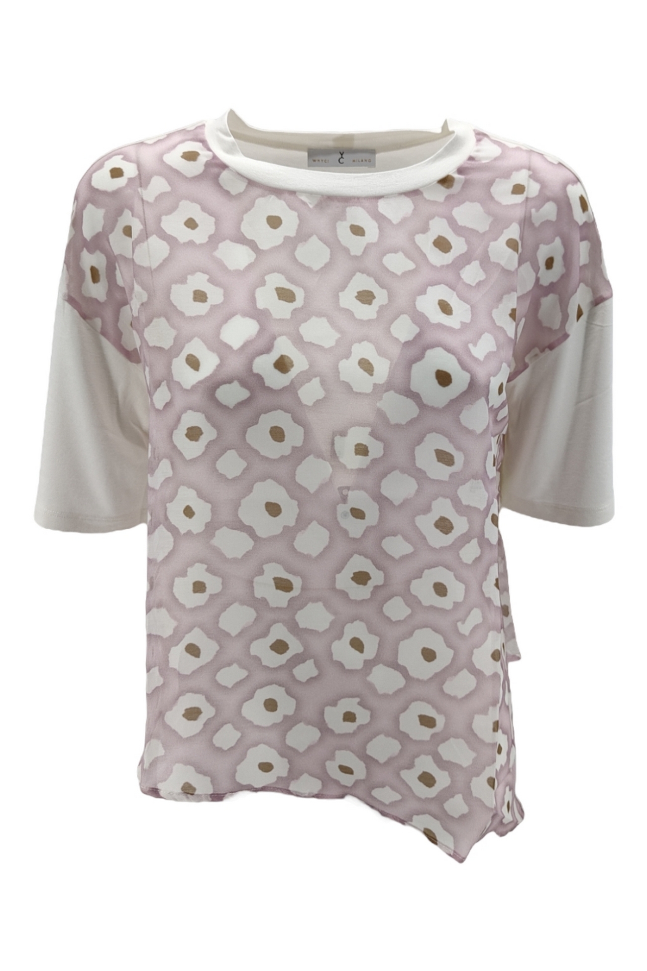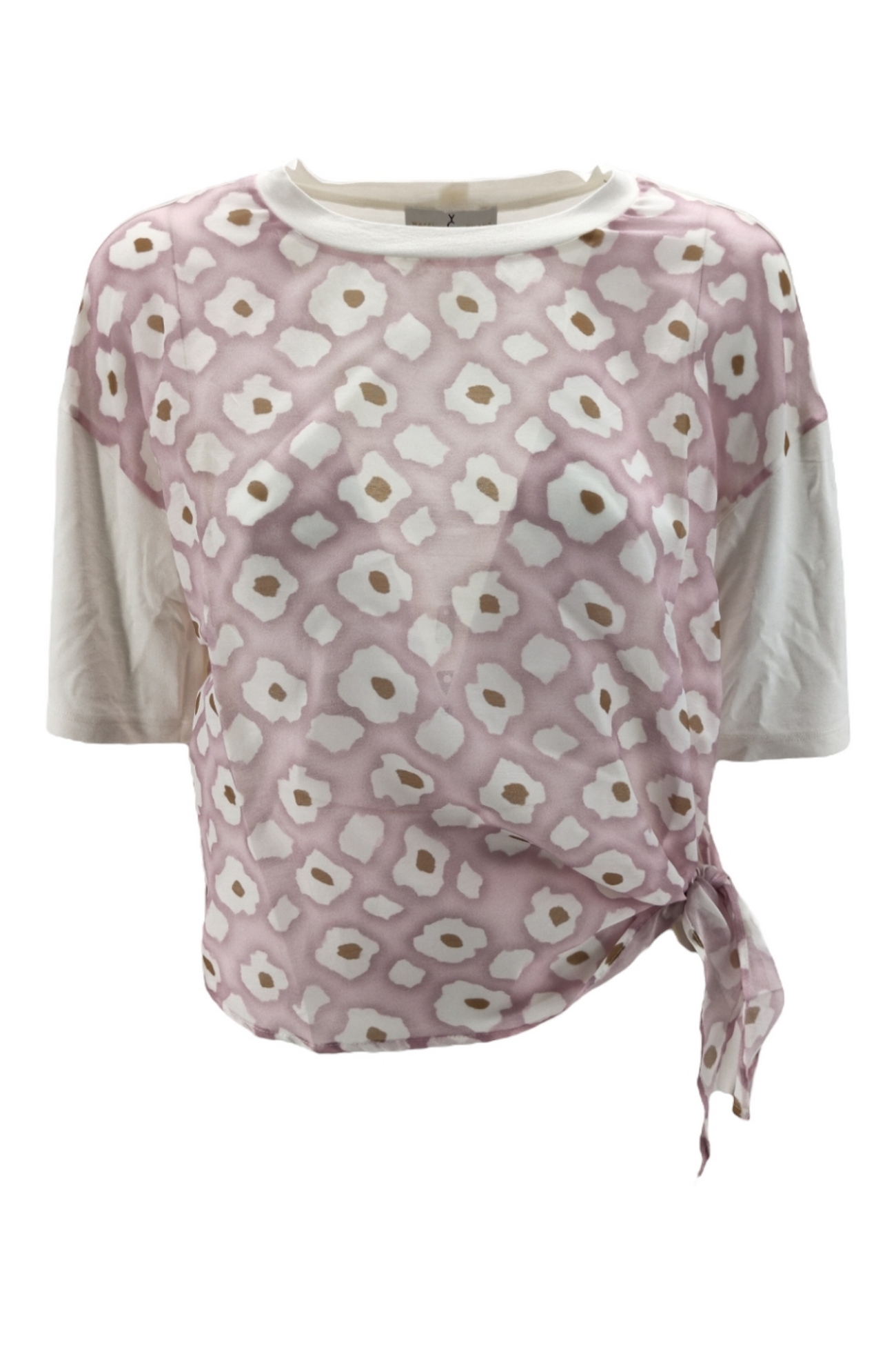 Camiseta Girocollo Fantasia fiori Davanti chiffon Nodo en la parte delantera Composición: 94% viscosa, 6% elastano Segunda tela: 70% algodón, 30% seda