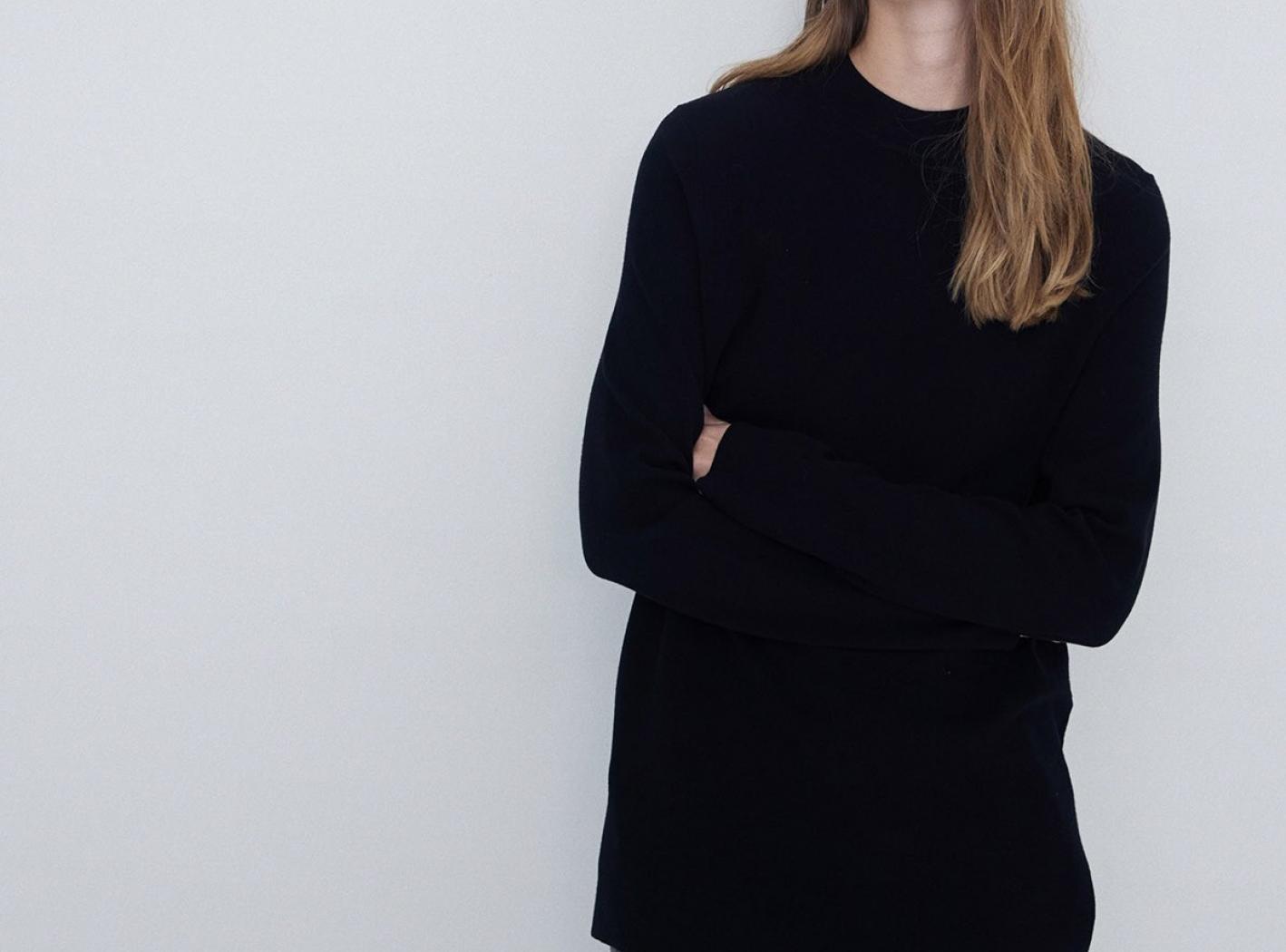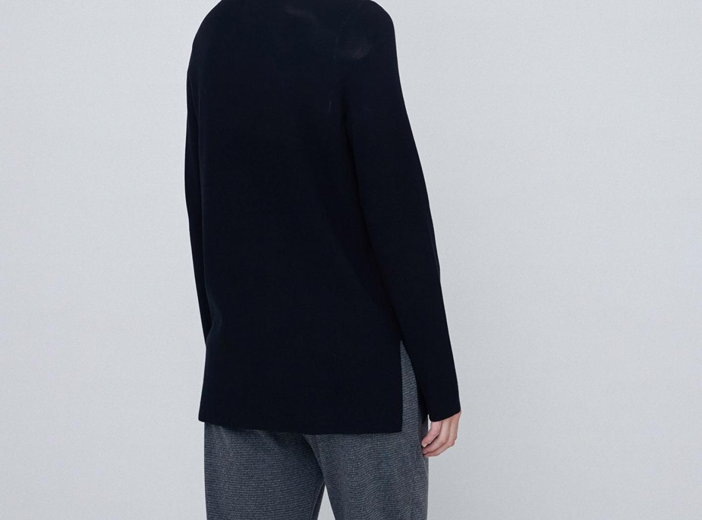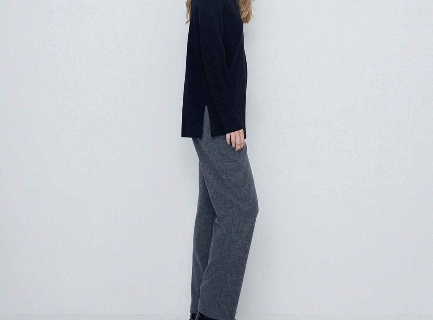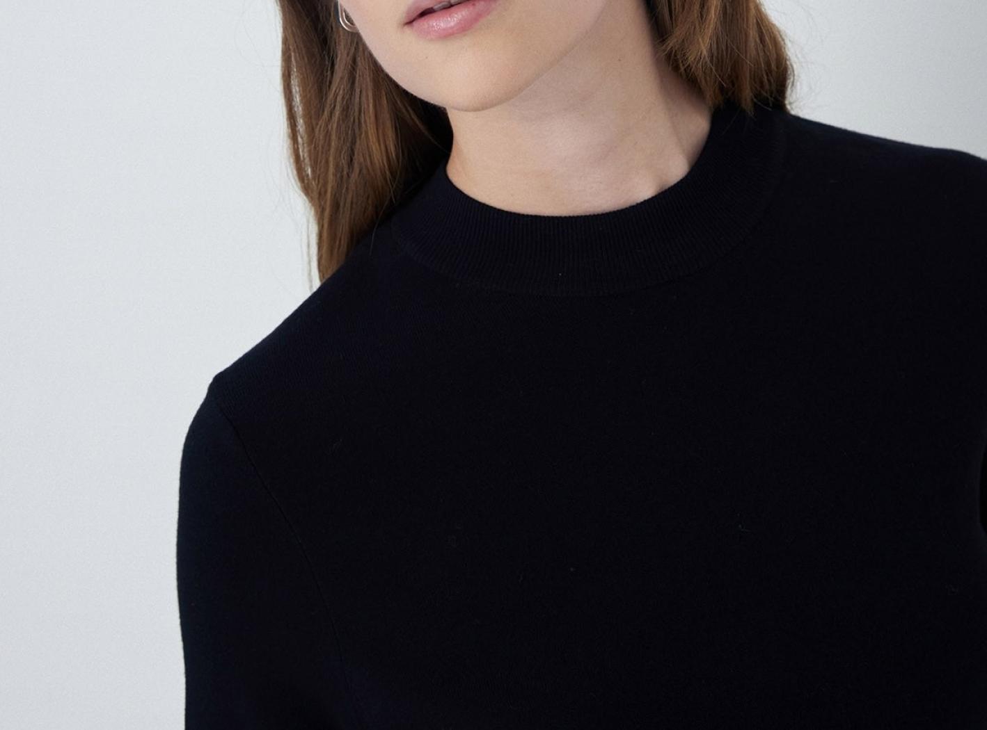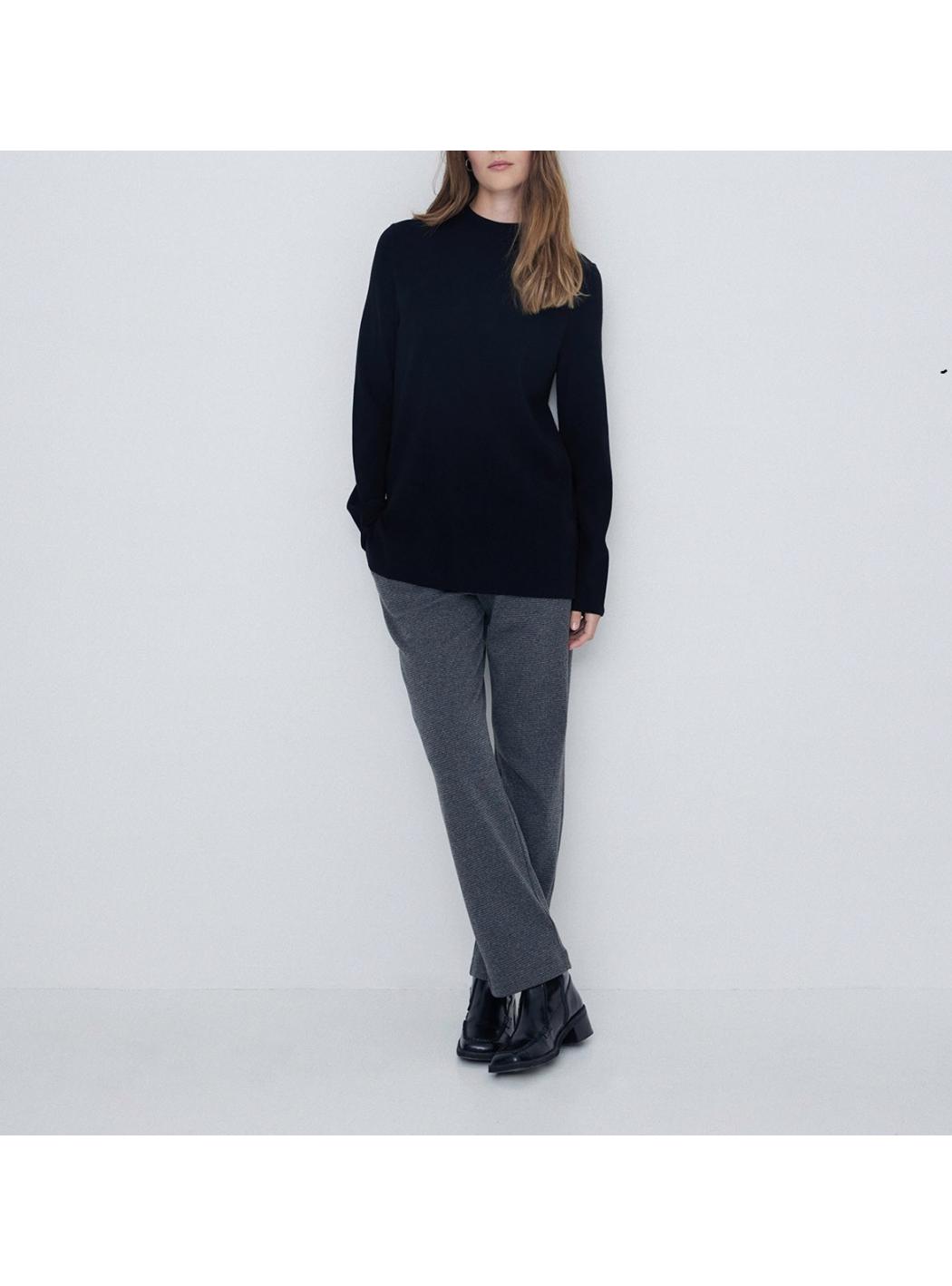 Suéter derecho con escote redondo y manga larga. Composición: 82% viscosa, 18% poliéster. Modelo de altura 175 cm, tamaño S.