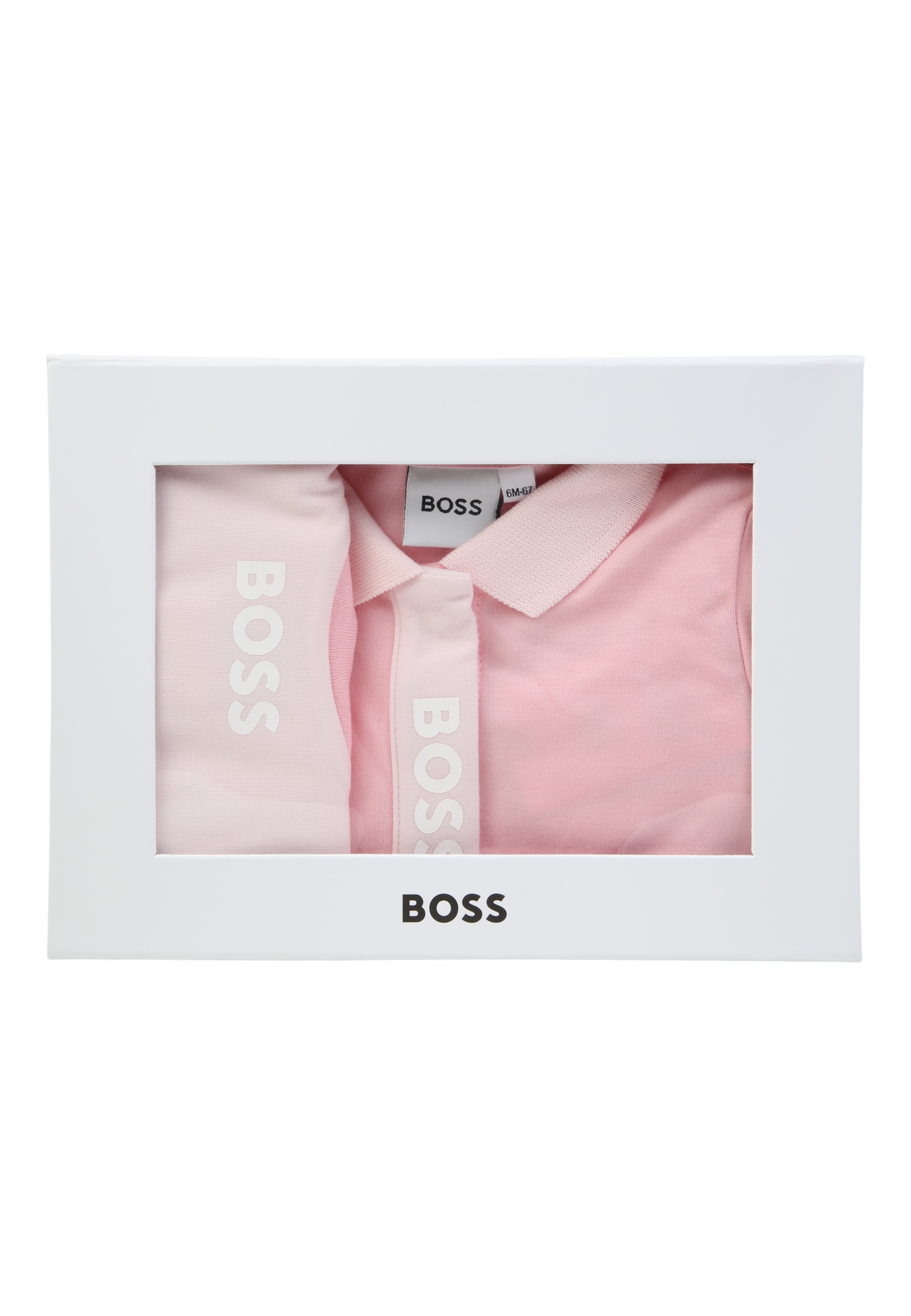 Cet ensemble BOSS est un must pour les nouveaux parents. Il dispose d'un pyjama avec un collier dans un style polo fermé avec un bouton de pression sur le devant et un bavaglino décoré avec un bord côtelé contrasté. Fait de coton biologique, l'ensemble est vendu en boîte cadeau.