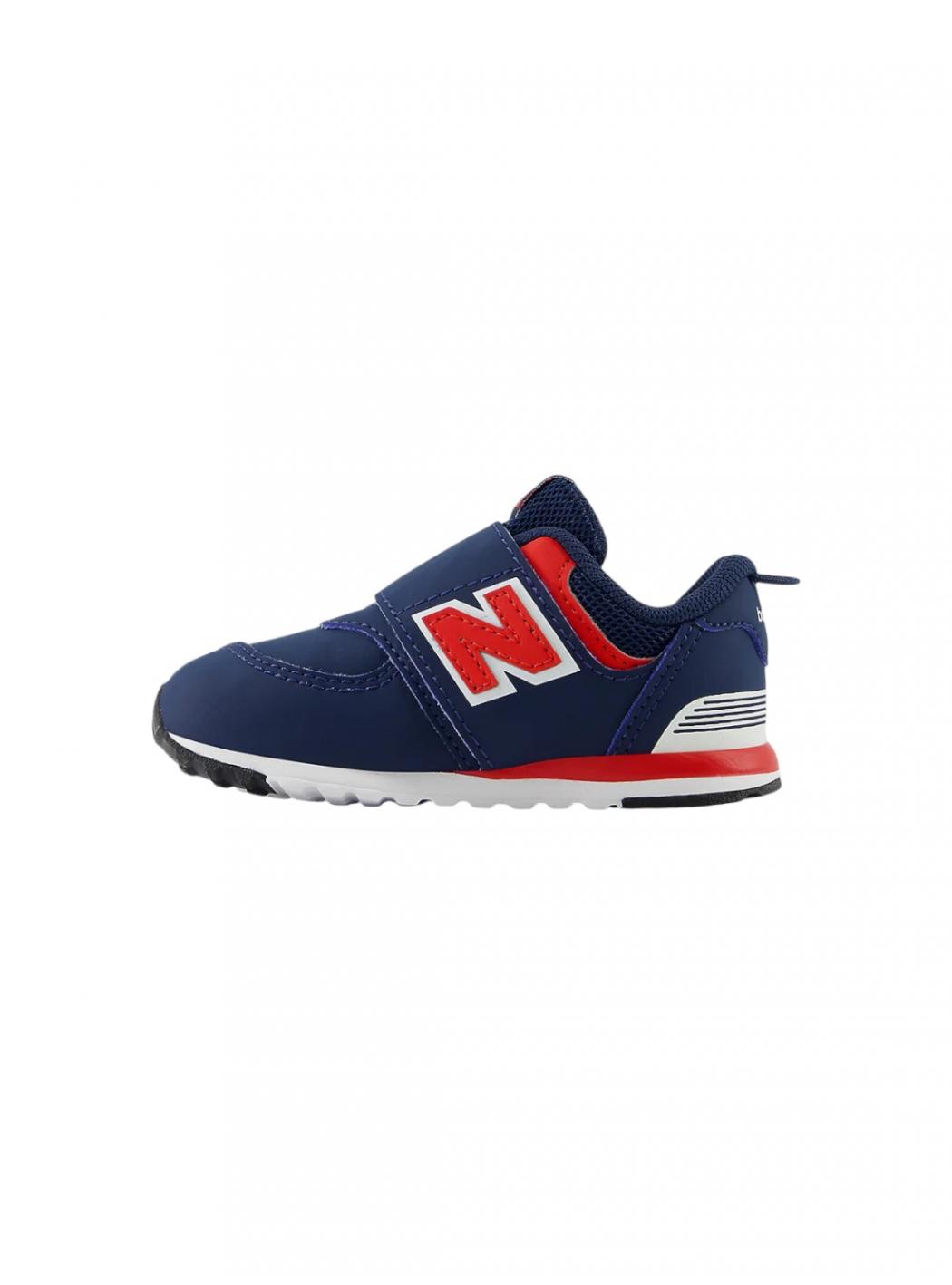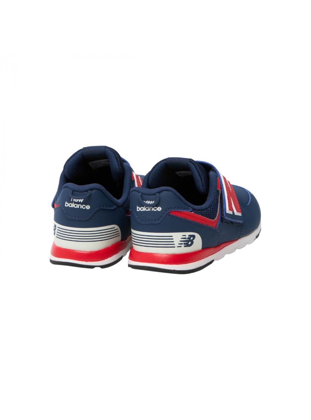 Sneakers 574 bleu avec semelle en caoutchouc, fermeture latérale déchirante, détails rouges sur les côtés et sur la semelle. Elles sont décorées avec un logo sur les côtés.