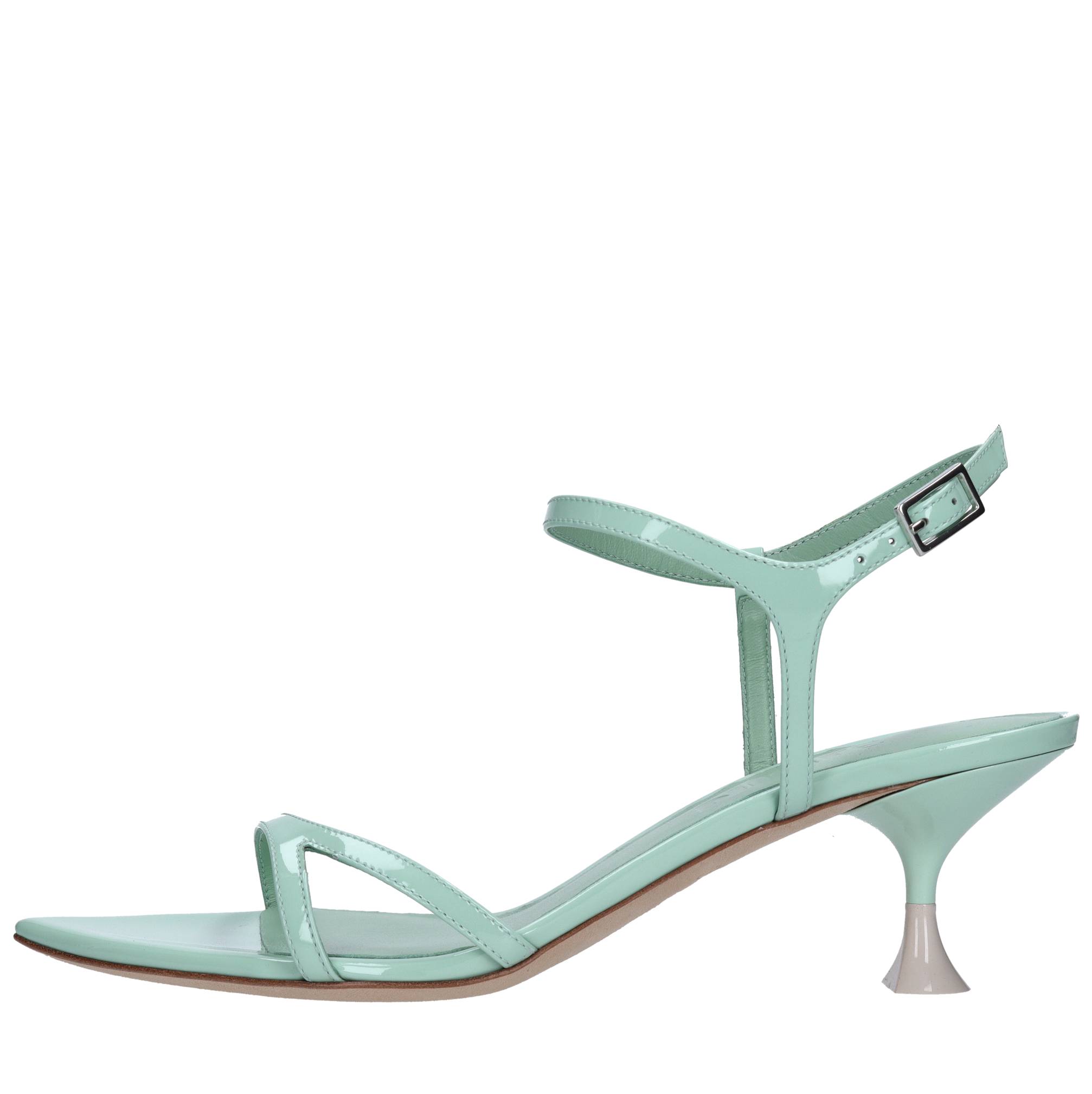 Sandales de corail en cuir brillant. Le dessus en cuir. Semelle extérieure en cuir. Talon sculptural bicolore.