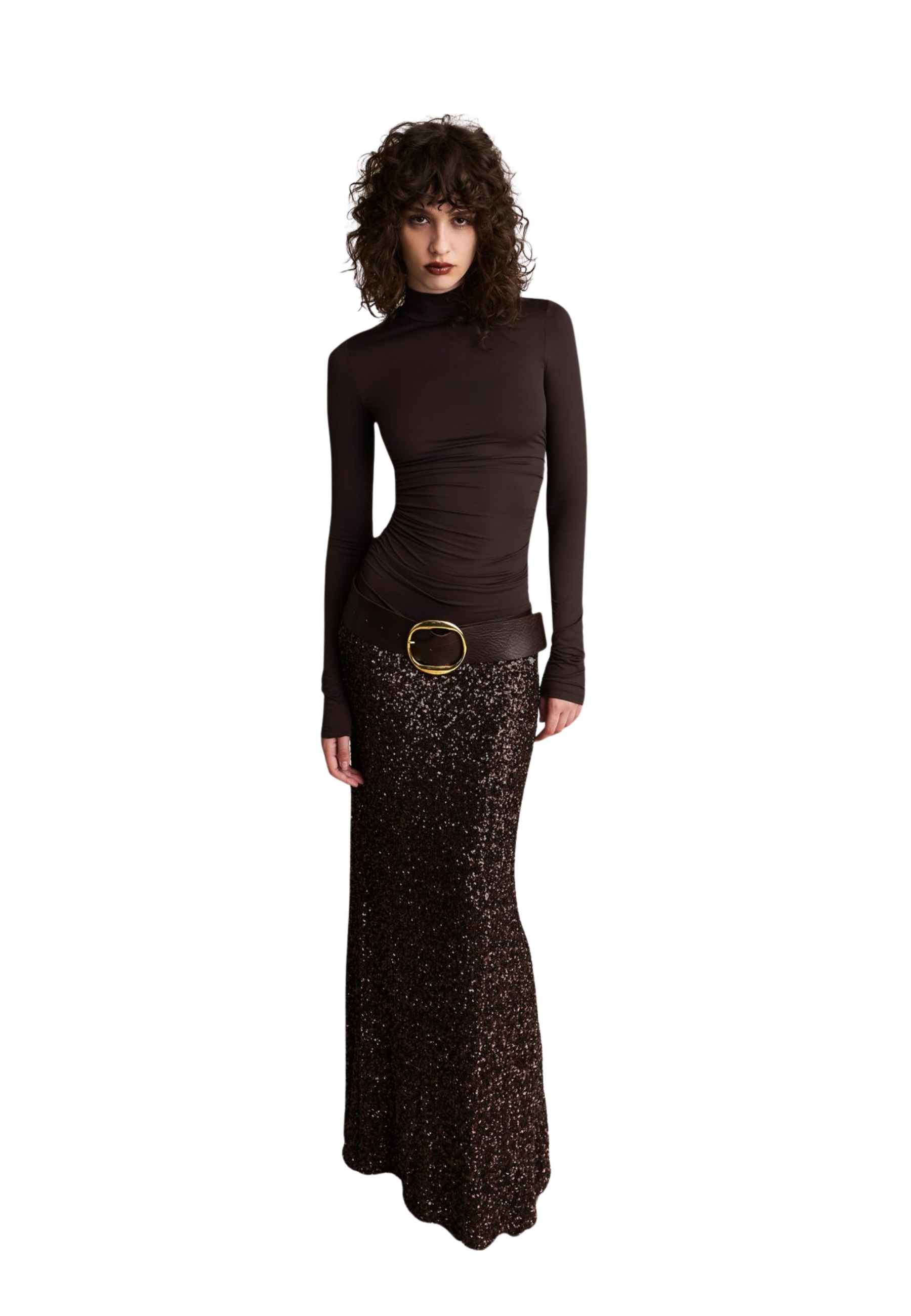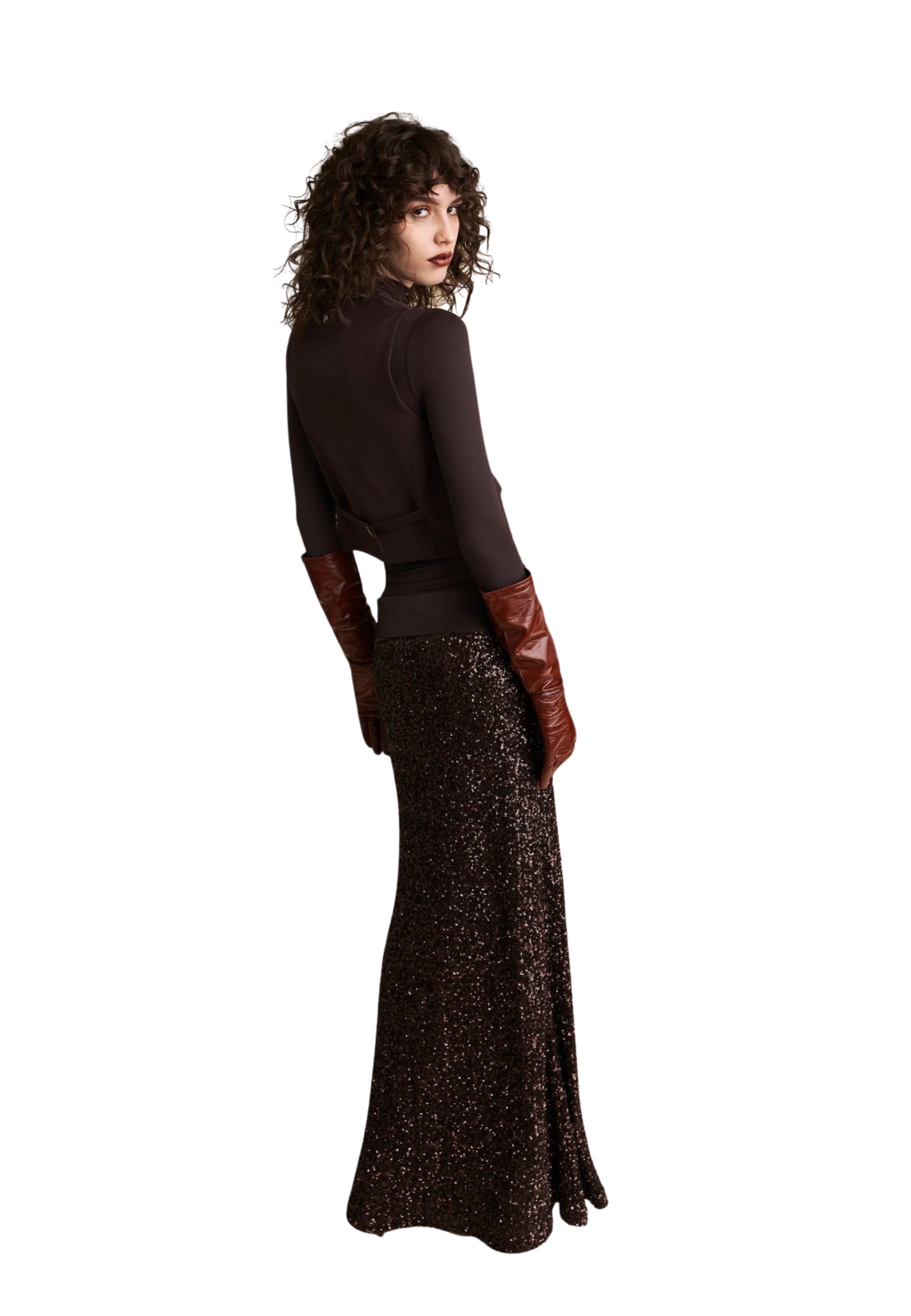 La jupe Luxy éclaire la scène avec une pluie continue de paillettes, qui capture la lumière à chaque étape. La coupe suit la ligne des hanches et s'ouvre légèrement sur le fond, créant un mouvement lisse et sophistiqué.