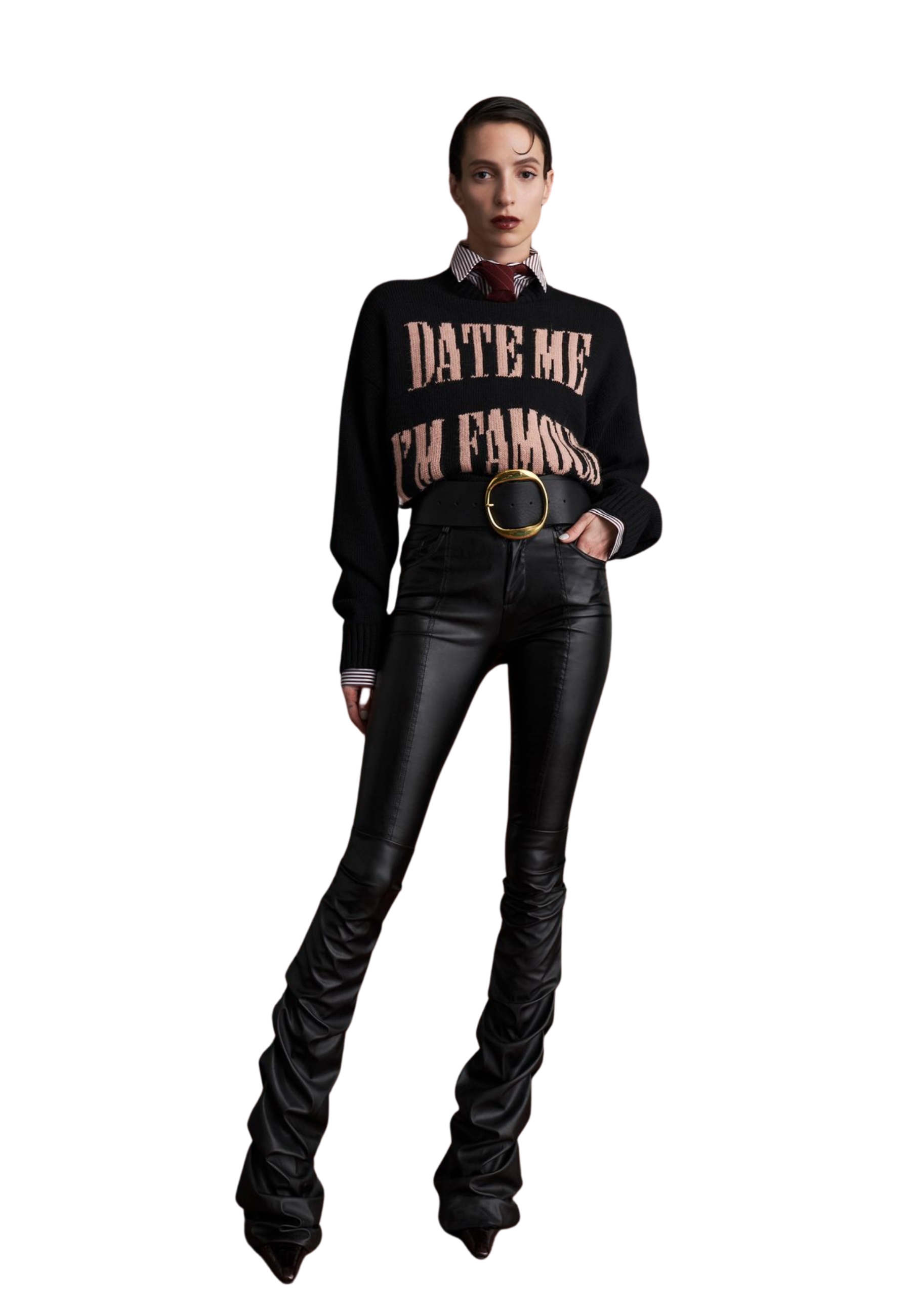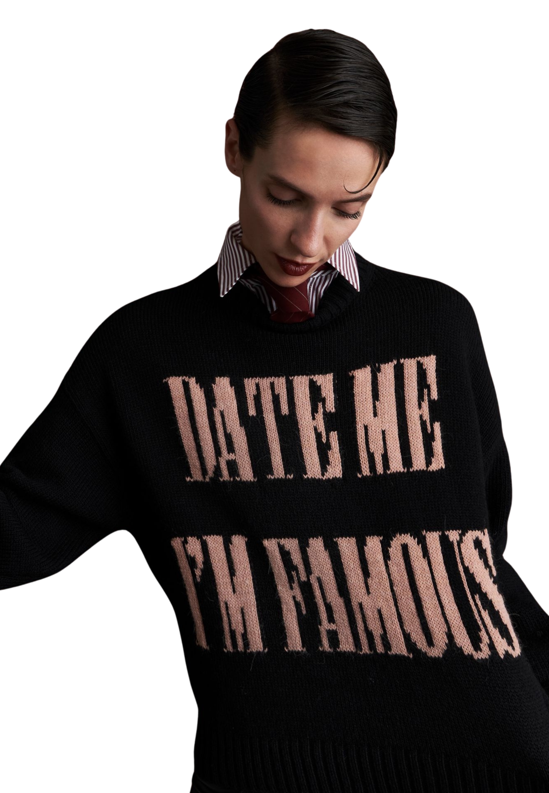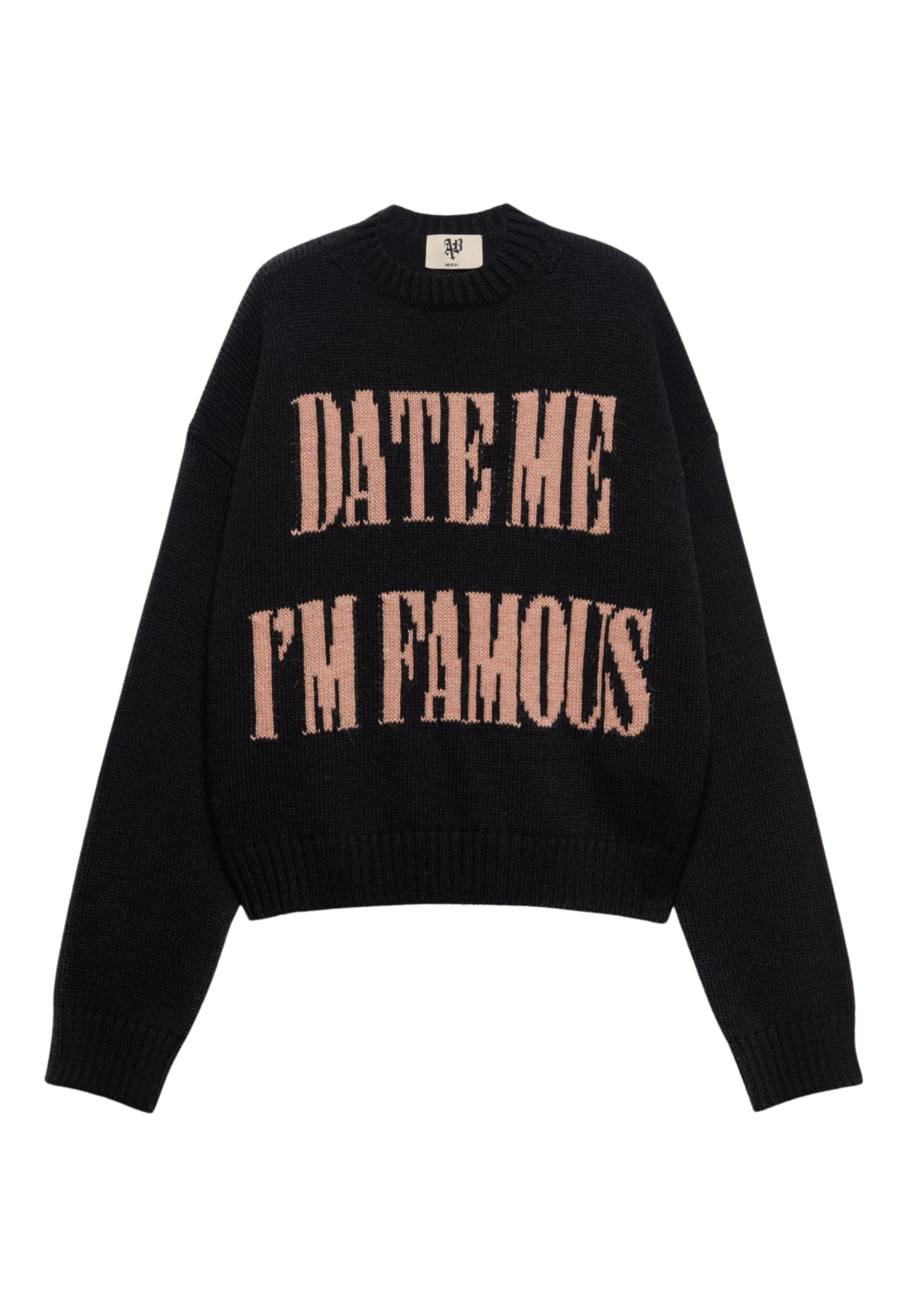 Le Chandail Kolor lance son message de caractère cubiste avec le lettrage jacquard brodé "Date Me I=m Célèbre". L'ajustement confortable et la palette contrastante cadrent un vêtement qui ne passe pas inaperçu.