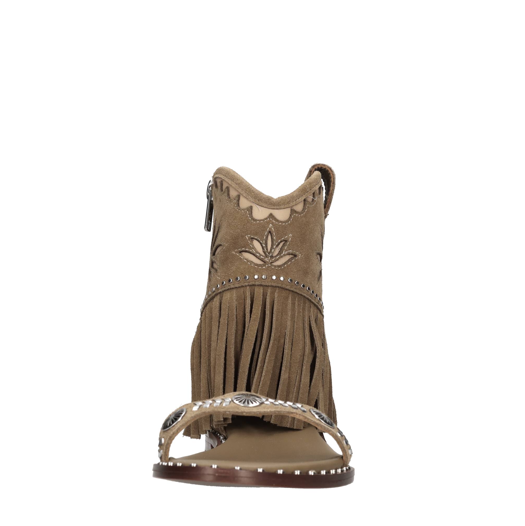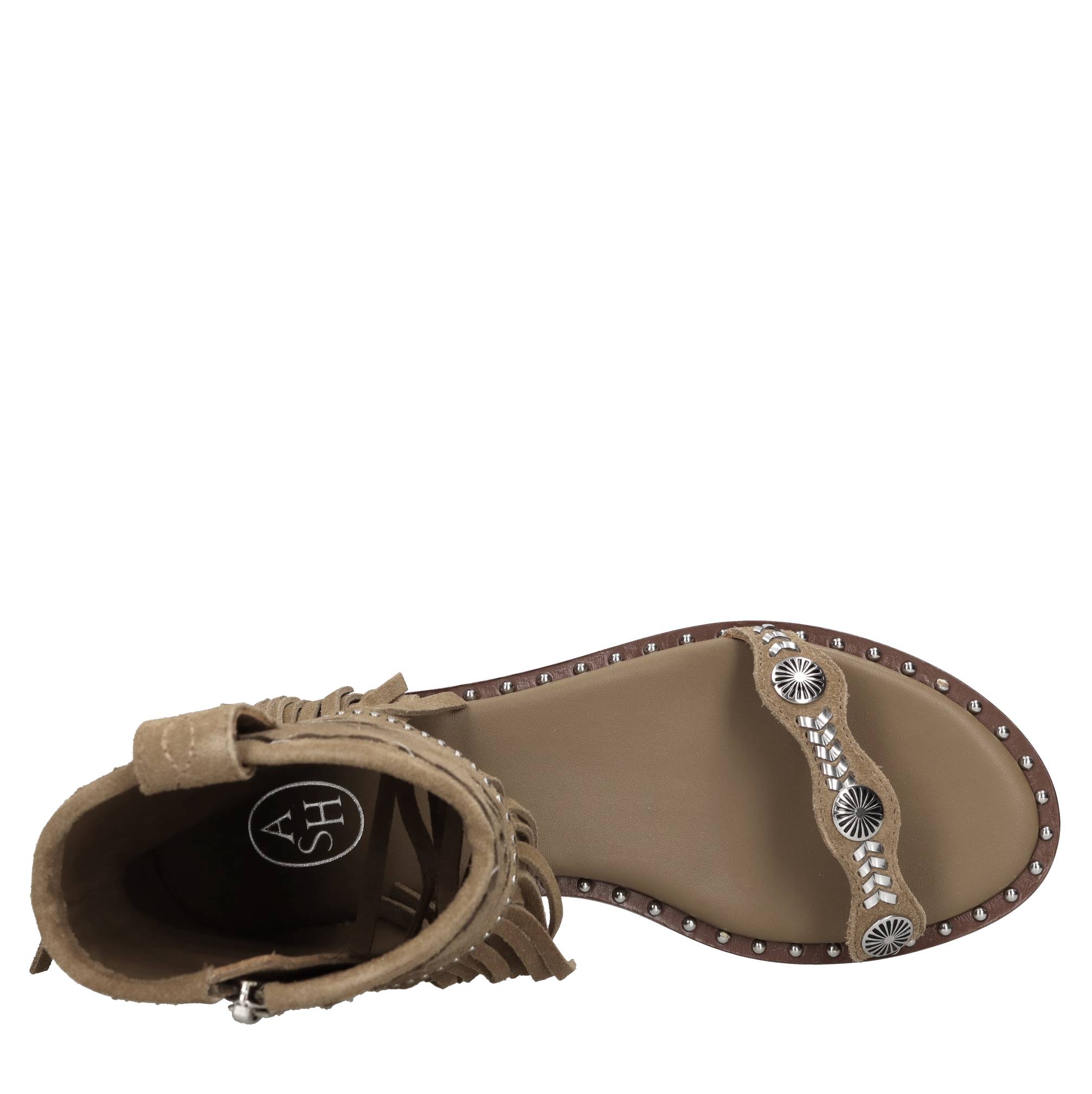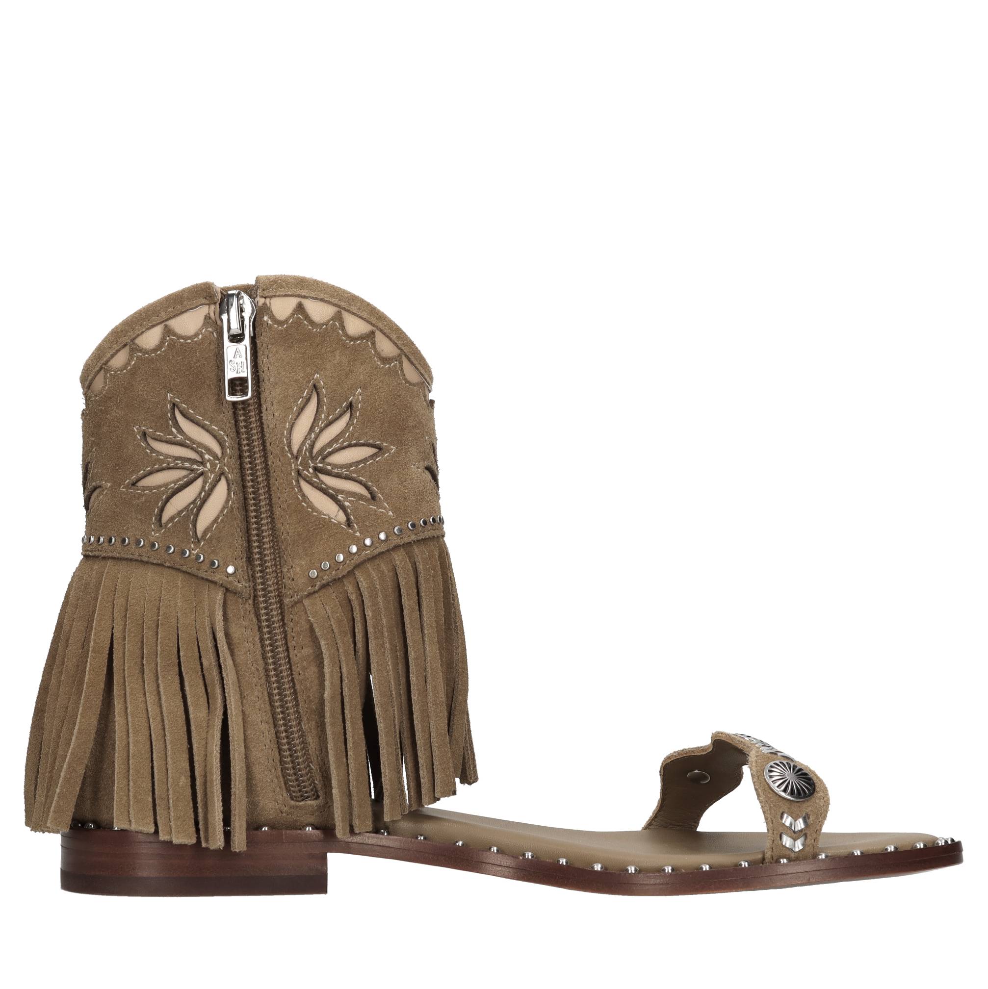 Sandales plates en daim. Applications couleur argent. Semelle extérieure en cuir Logé. Tige en cuir Logée.