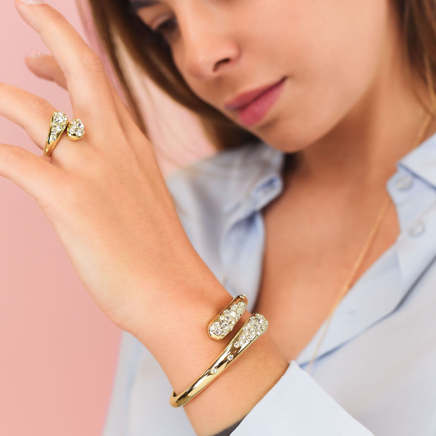 Bracelet rigide plaqué or, modèle contrarié, avec cristaux de décoration centrale.