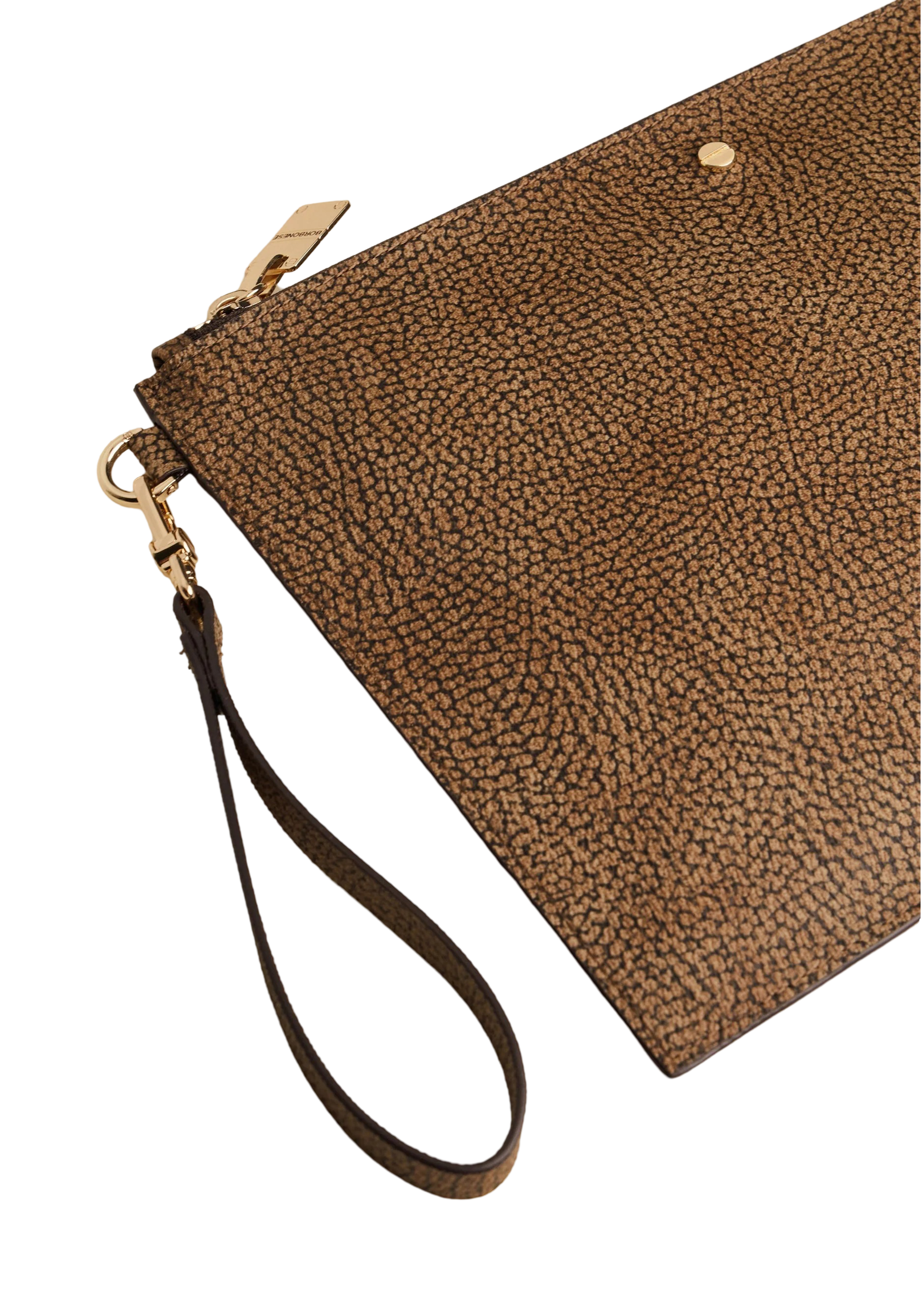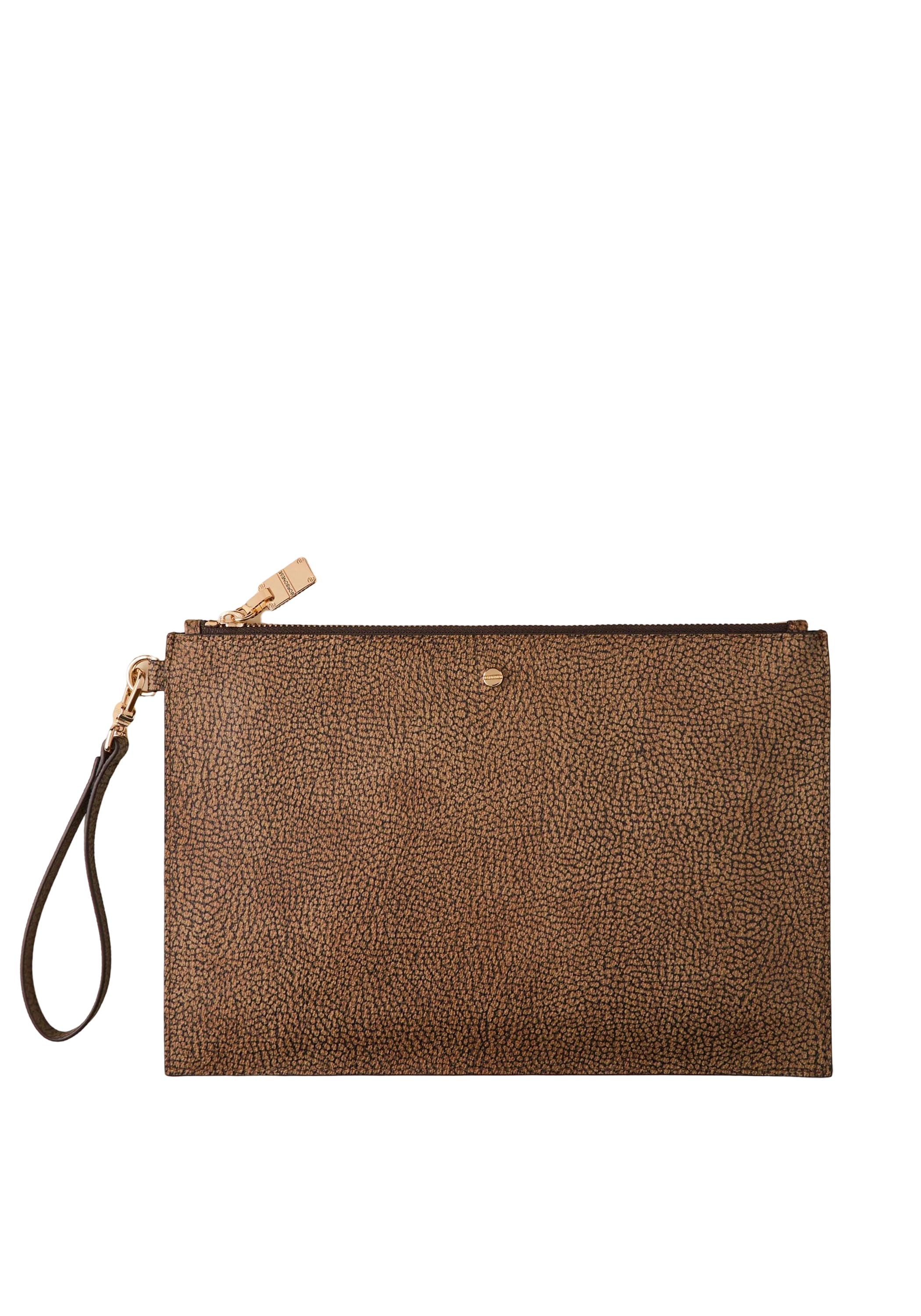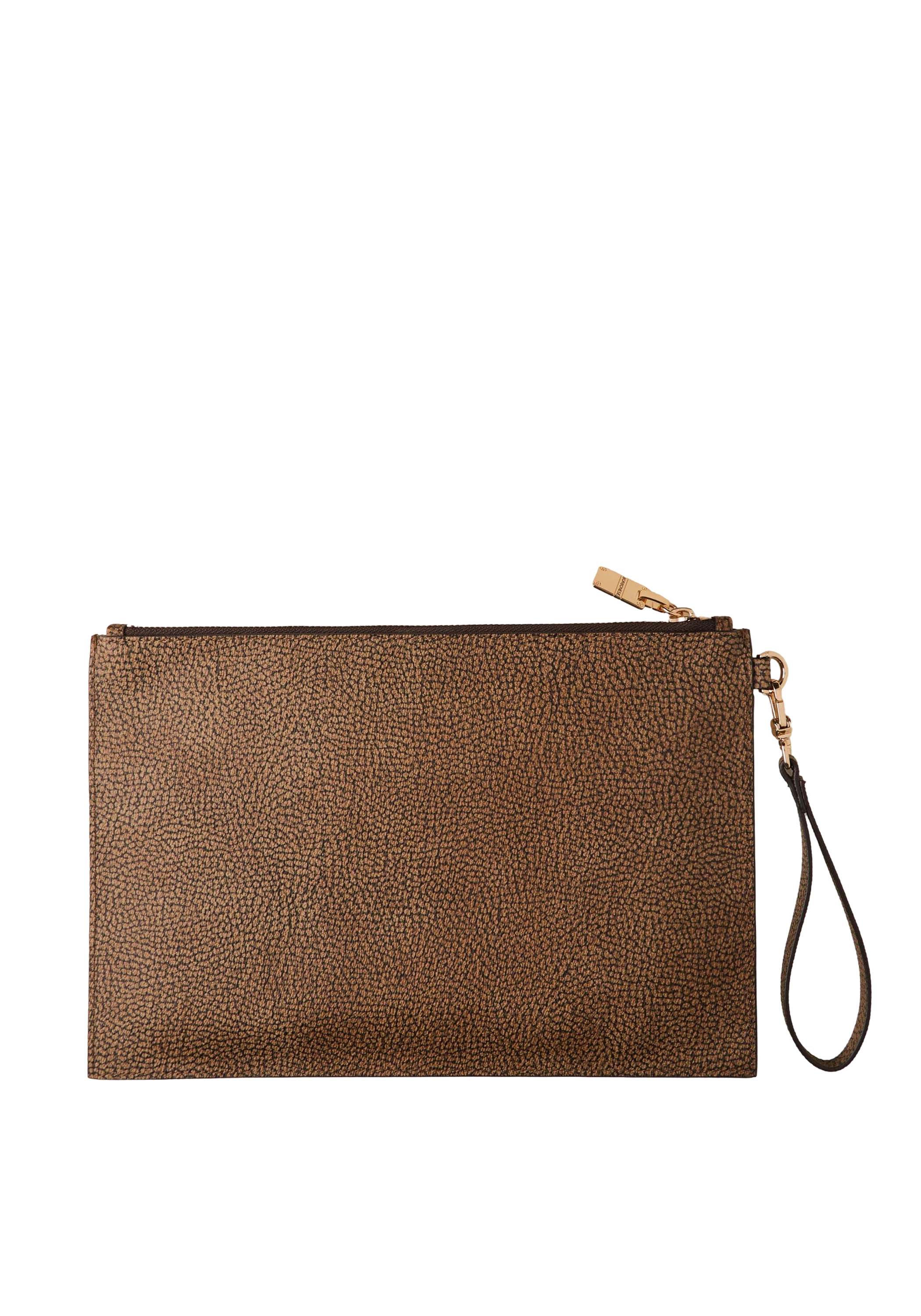 Borbonese a fait un sac en toile enduit op, parfait pour stocker des cartes et des documents. L'article est réglé par une fermeture éclair avec plaque attachée et est équipé d'une poignée. La vis, symbole de la marque, devient un élément décoratif sur le devant de l'embrayage. L'intérieur, équipé d'une poche zippée et de compartiments, est en tissu recyclé. Tous les métaux sont en or clair galvanique.