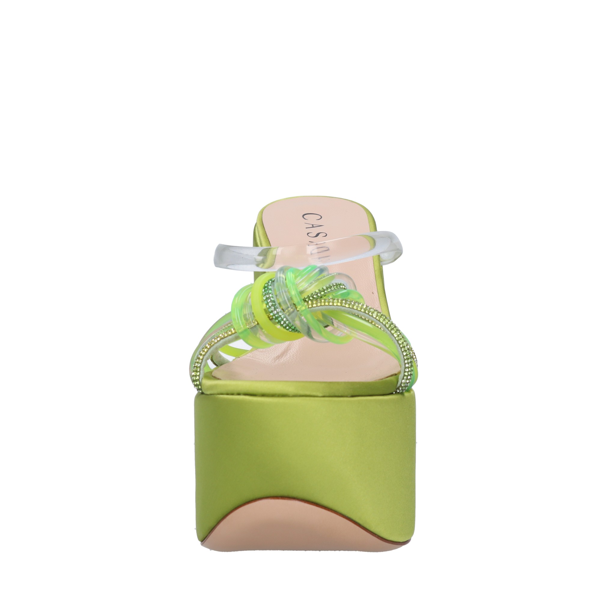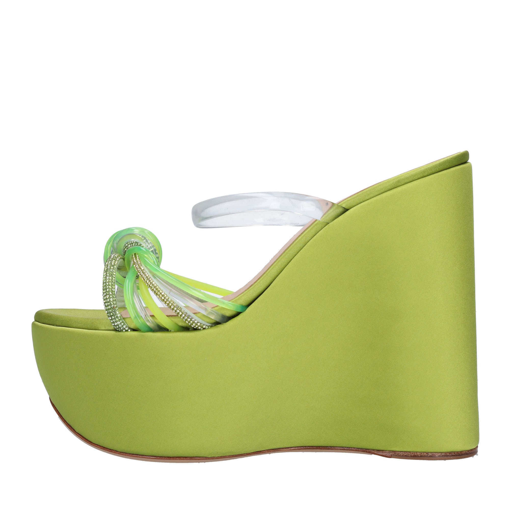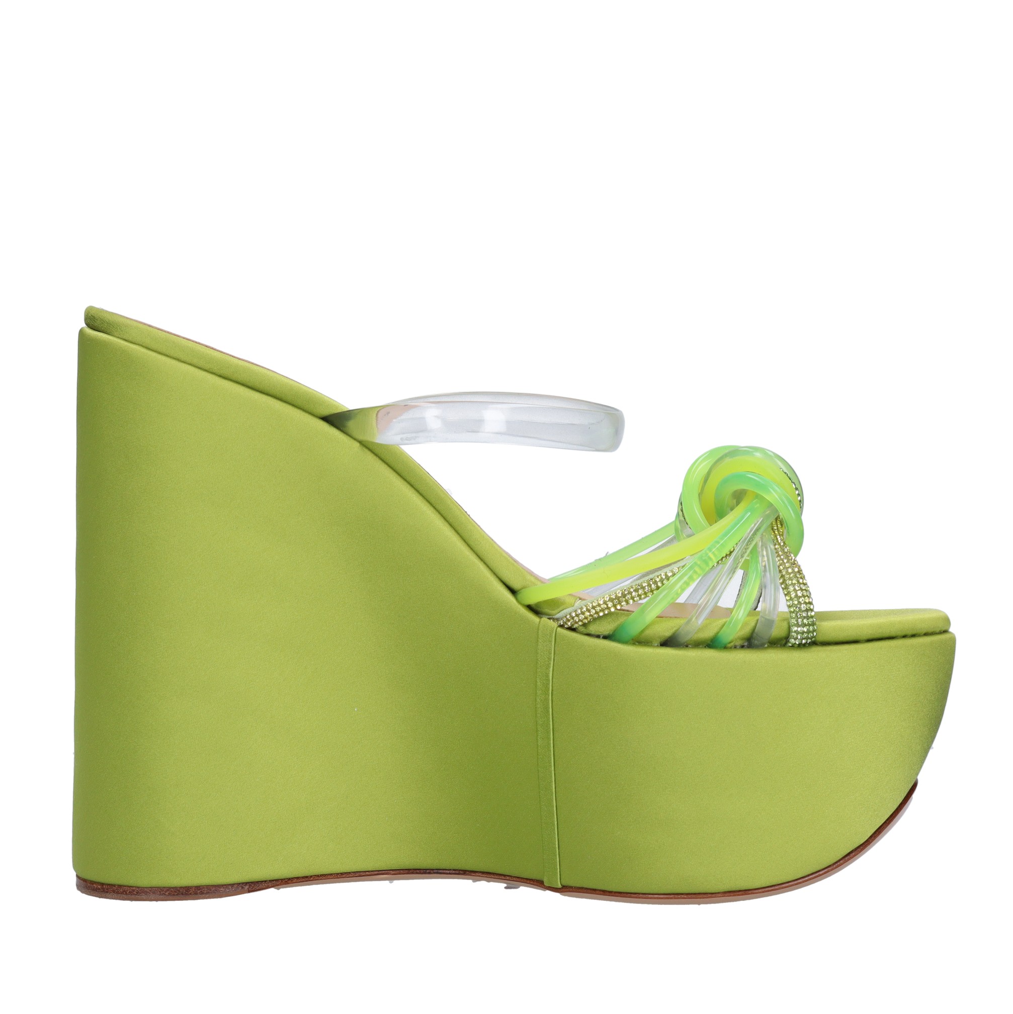 Mules compensées en satin plexi et strass. Plateau : 7 cm. Semelle extérieure en cuir. Dessus intérieur en cuir. Des échantillons. Expédié dans une boîte neutre.