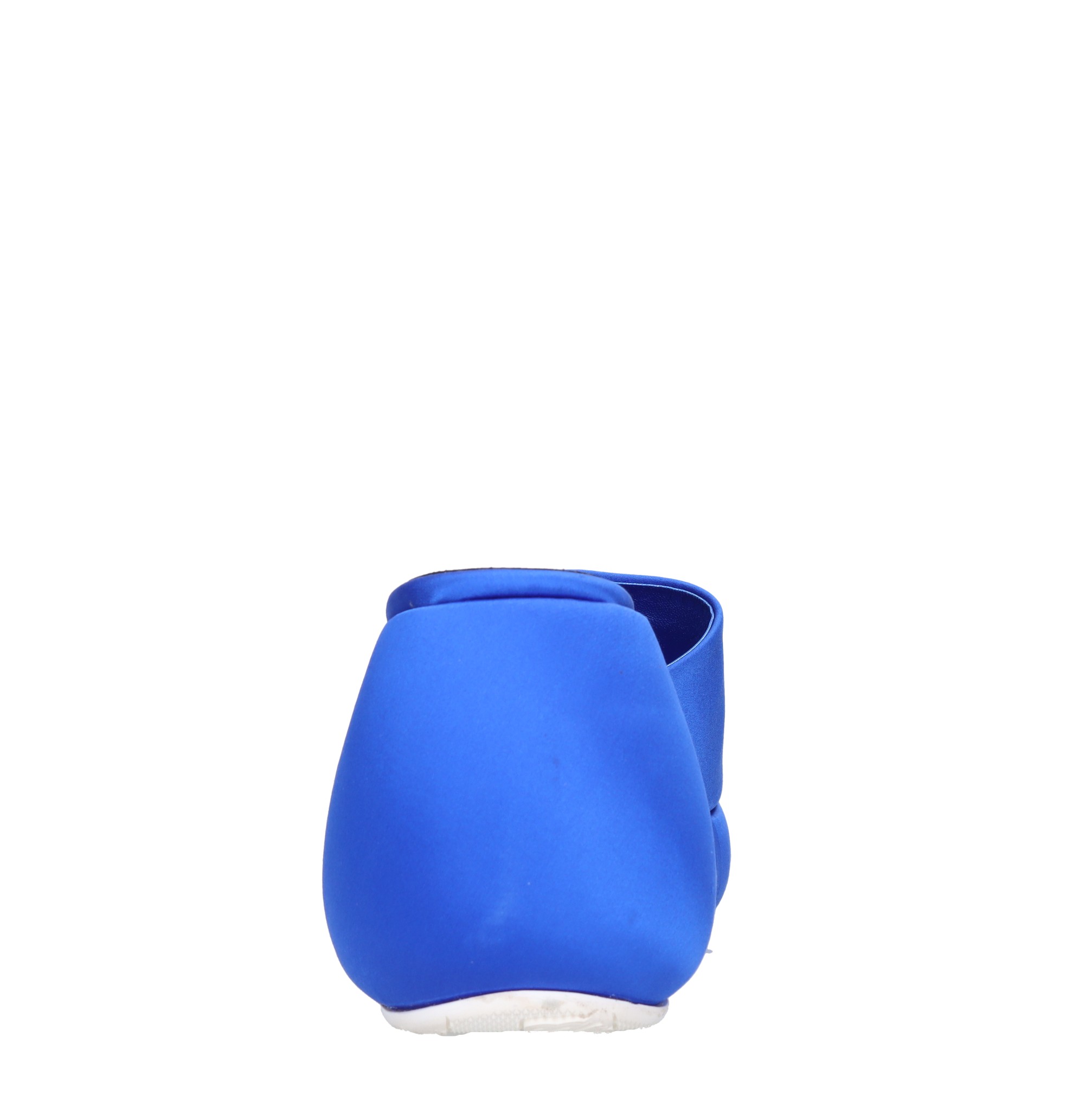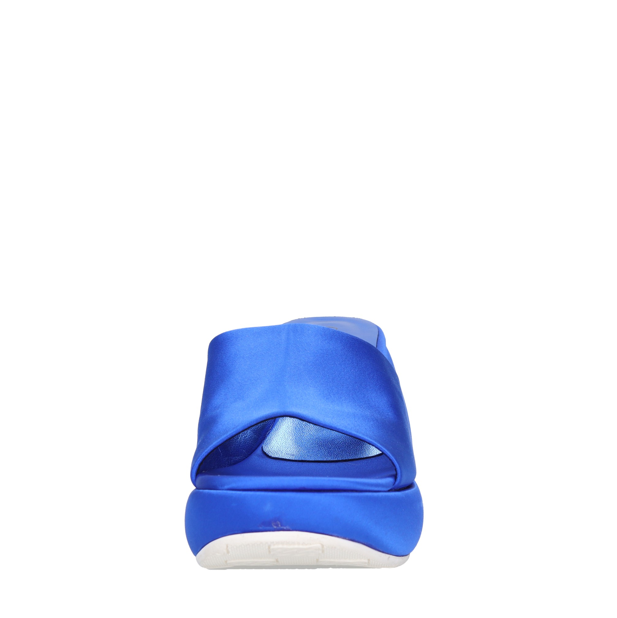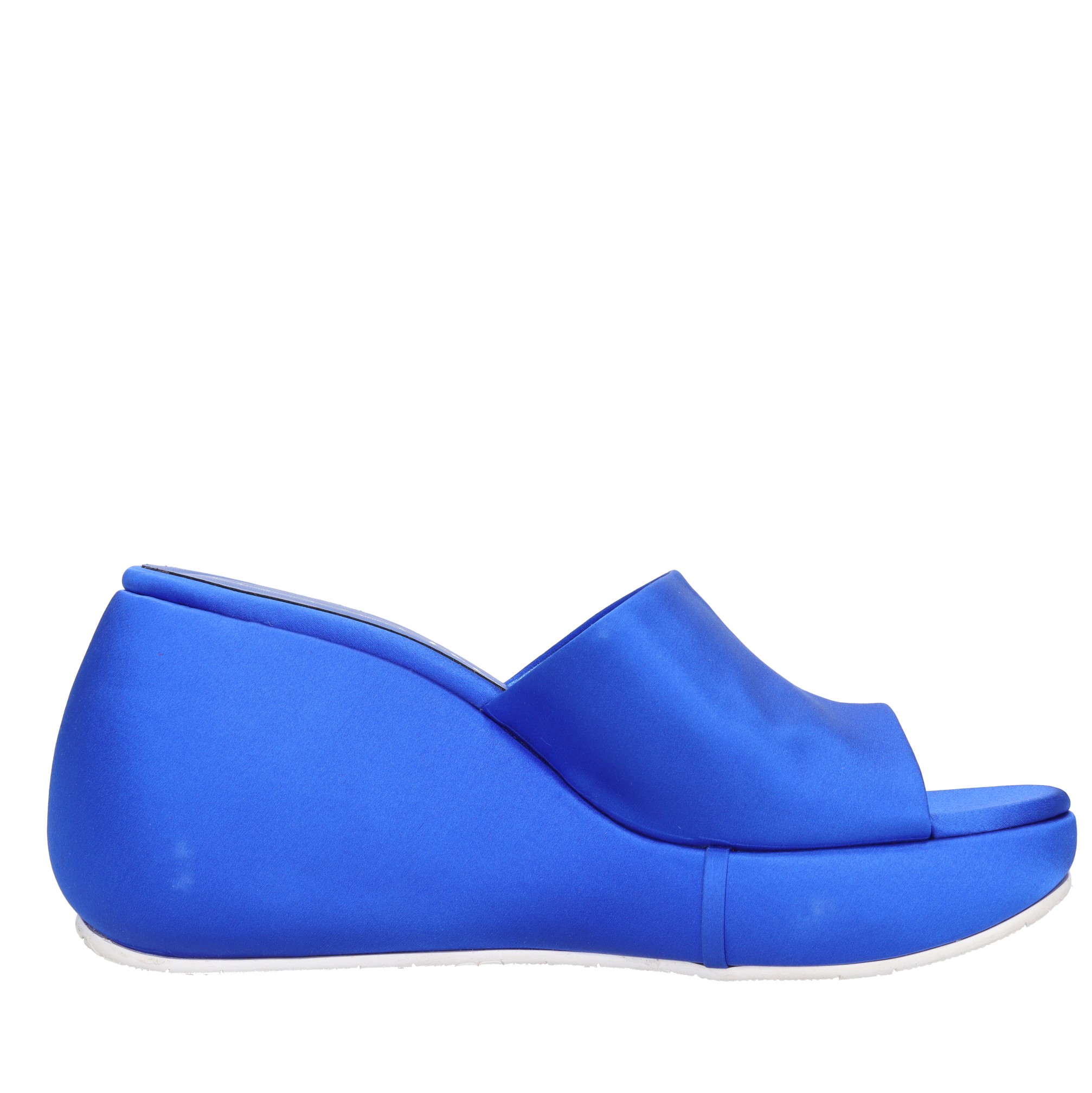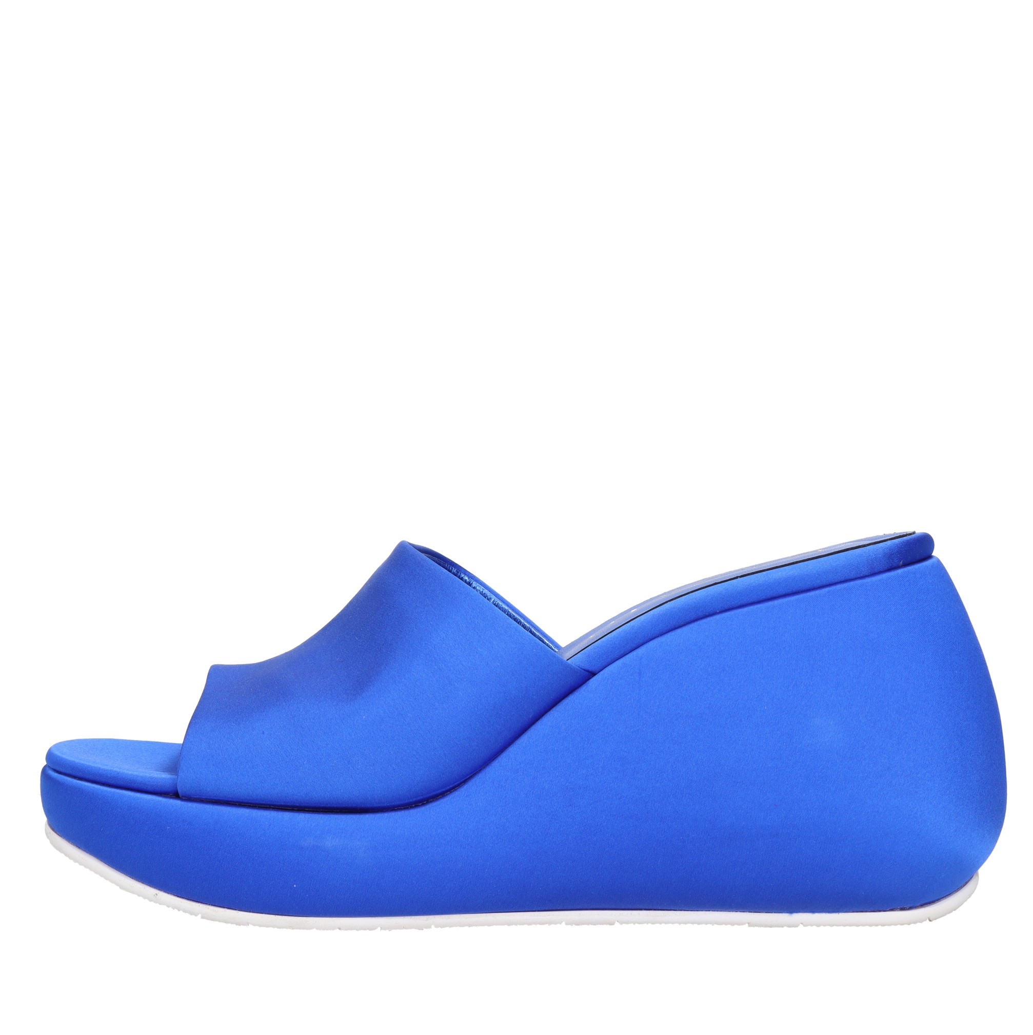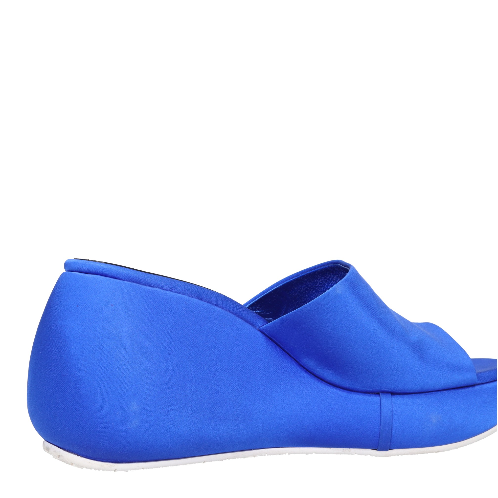 Mules compensées en satin. Plateau : 4 cm. Semelle extérieure en caoutchouc. Tige interne en cuir et satin. Petites imperfections sur le satin (voir photo). Des échantillons. Expédié dans une boîte neutre.