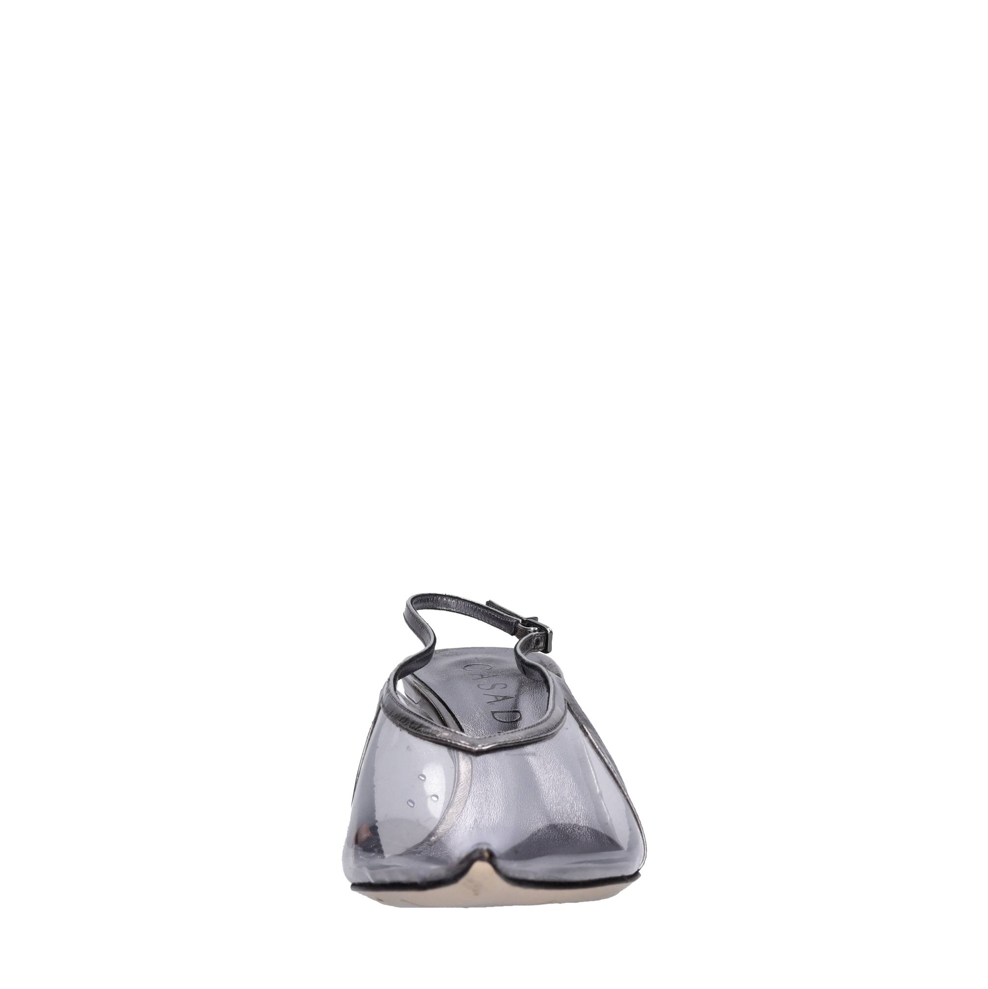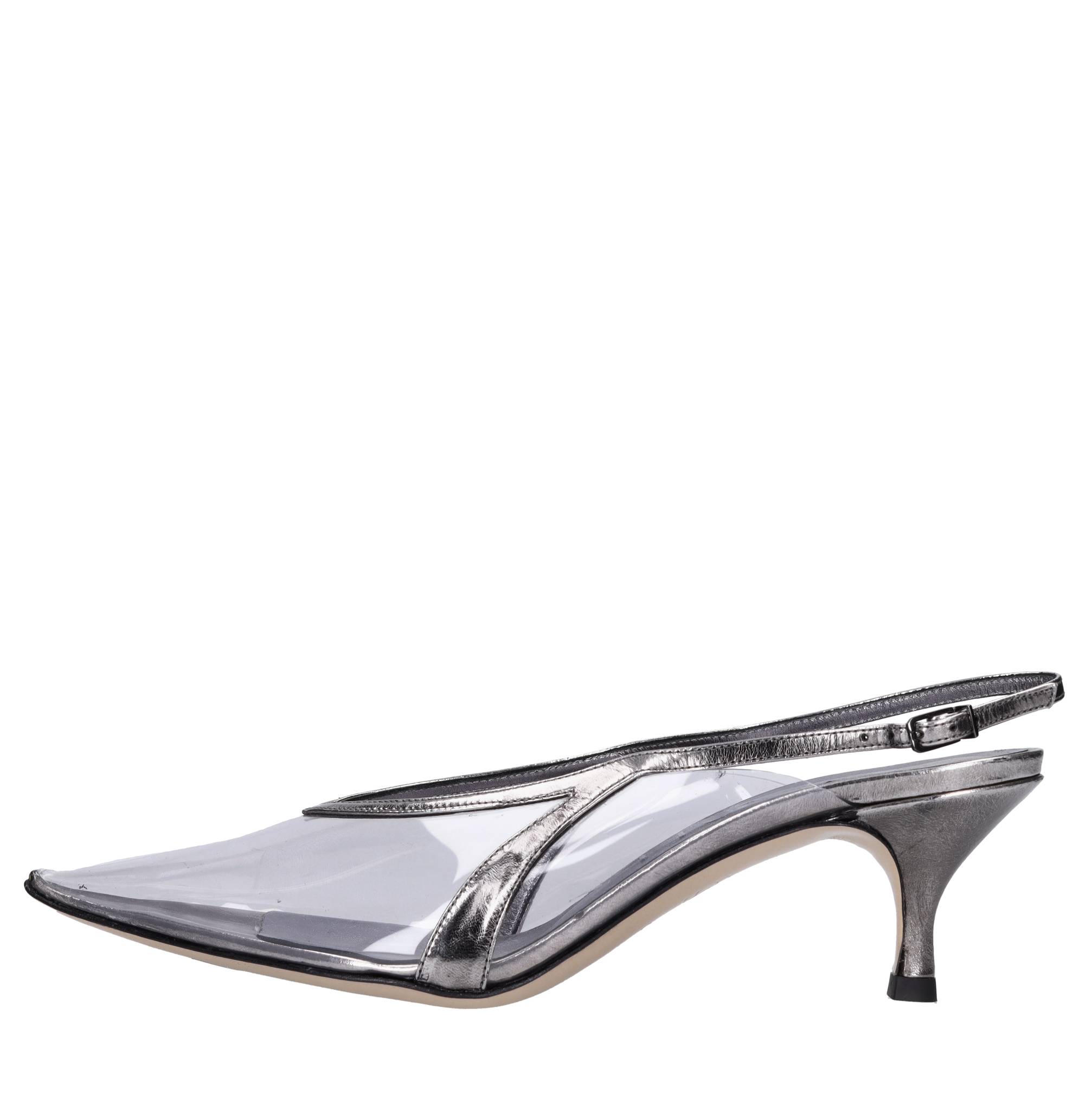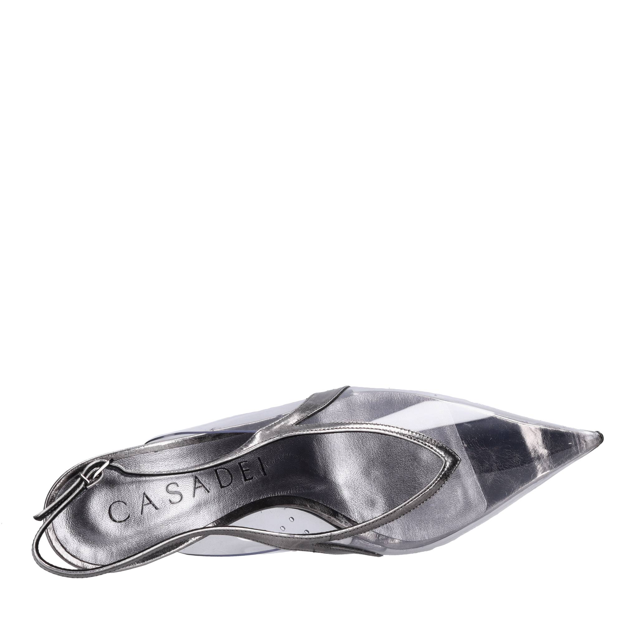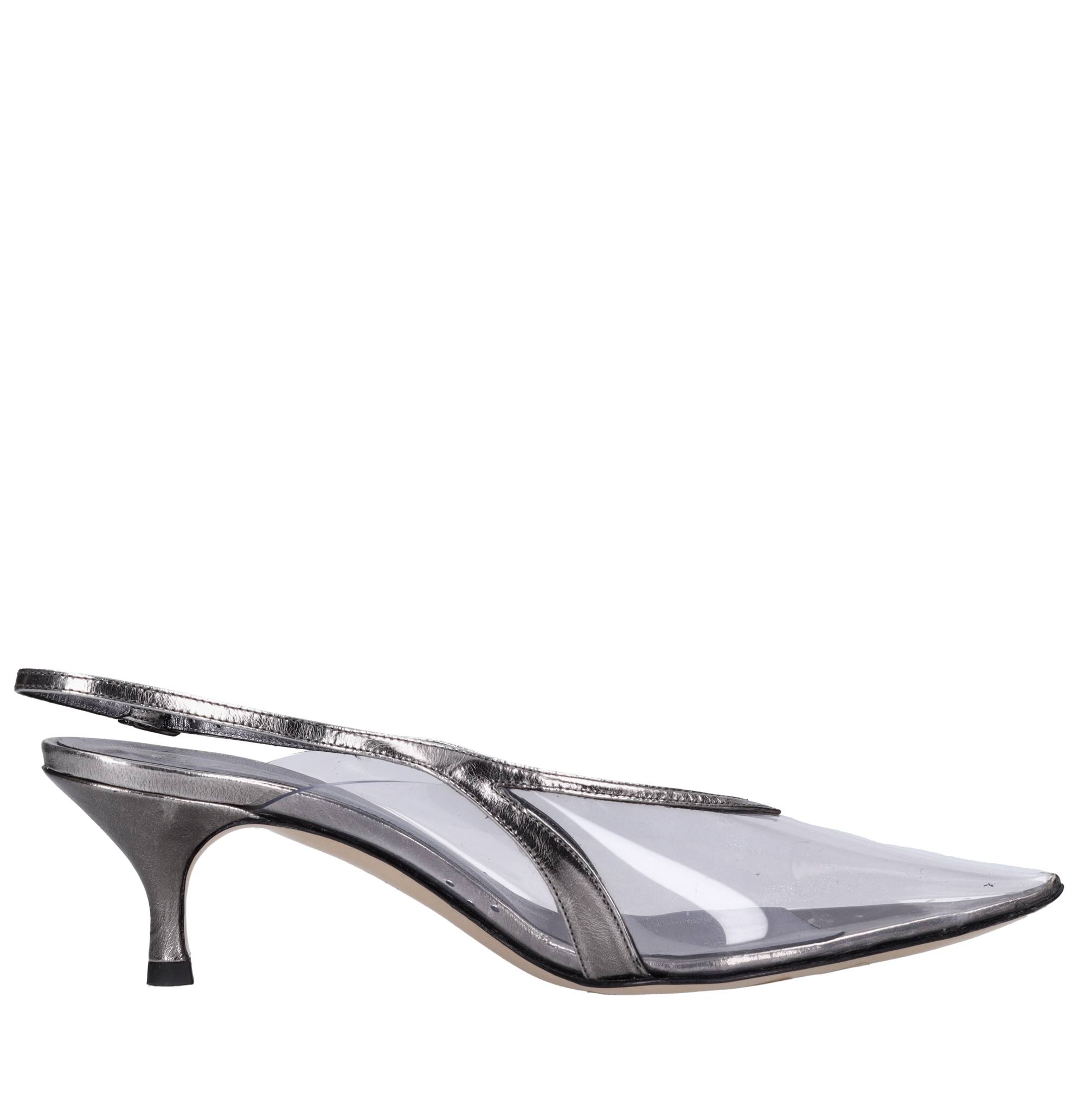 Décollé slingback en plexi et cuir. Mod. Cristal transparent. Semelle extérieure en cuir. Tige intérieure en cuir et plexie. Des échantillons. Petites imperfections sur les talons et le cuir. Expédié sur une boîte neutre.