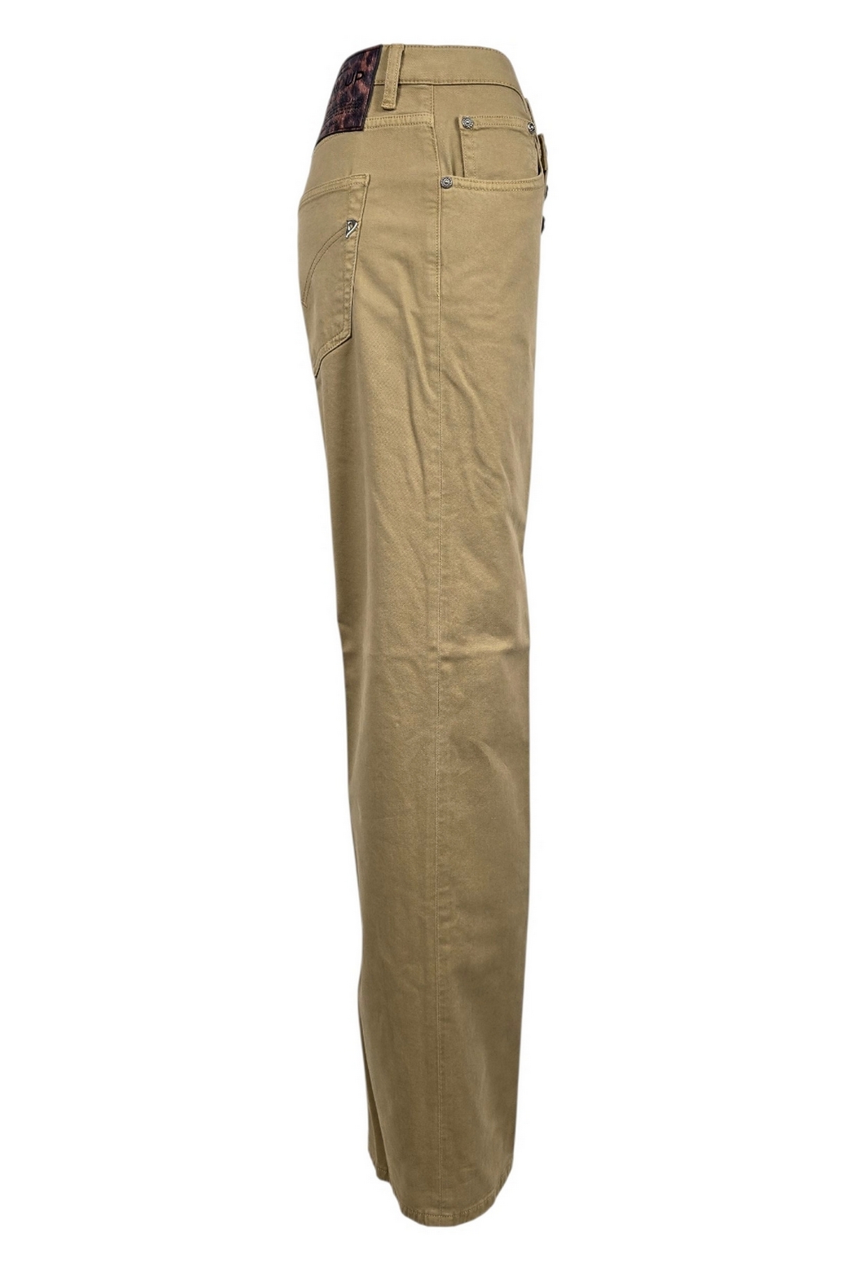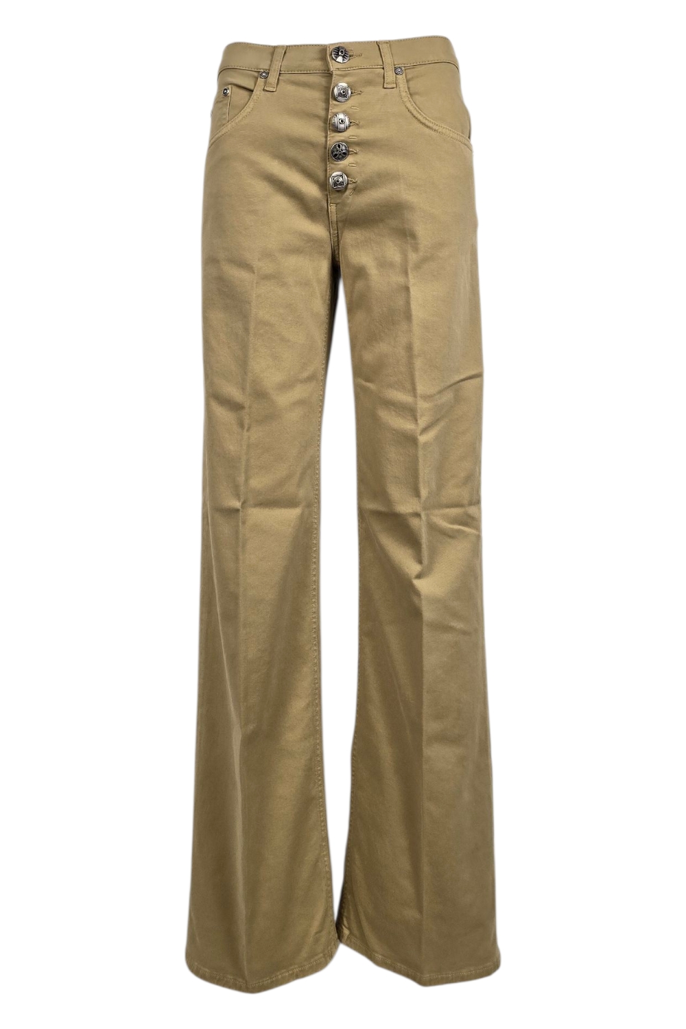 Pantalons Dondup Jaqueline modèle dans la pêche à la main en coton. 5 poches. Large jambe. Fermeture avec boutons bijoux. Une vie régulière. Étiquette Maxi au dos avec logo. Composition : 98 % coton, 2 % élasthanne. Fabriqué en Italie.