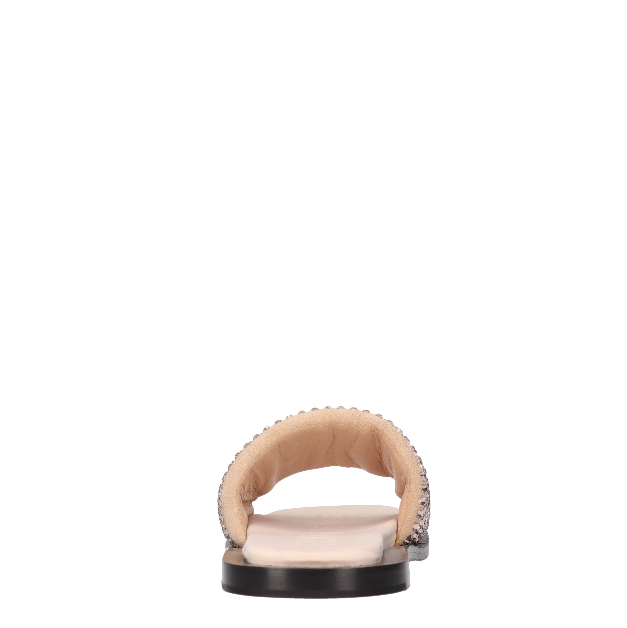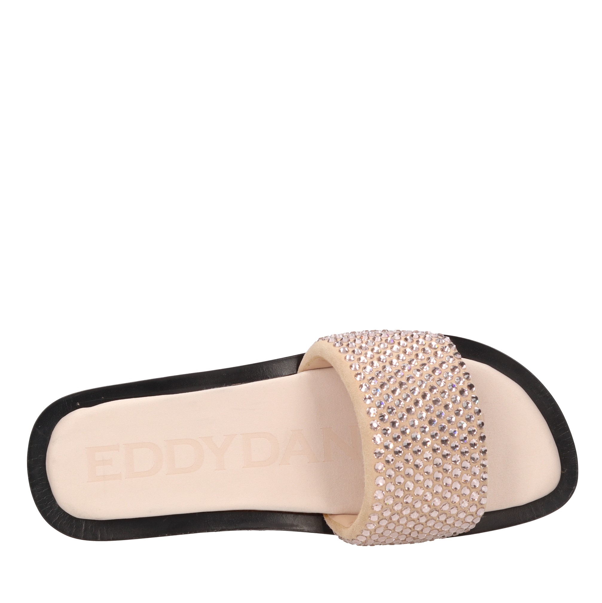 Mules en daim et strass. Tige interne en tissu et cuir. Semelle extérieure en cuir.