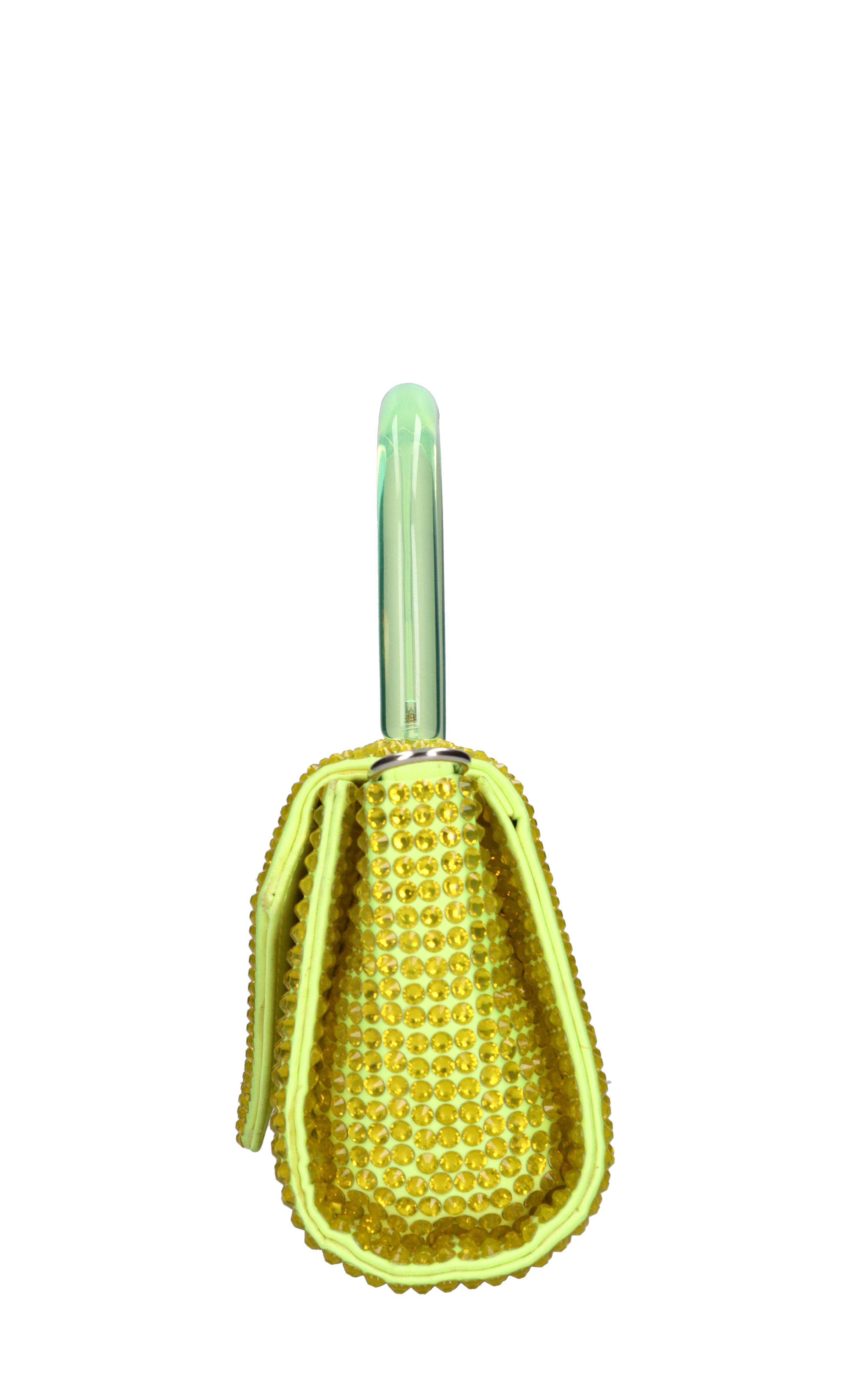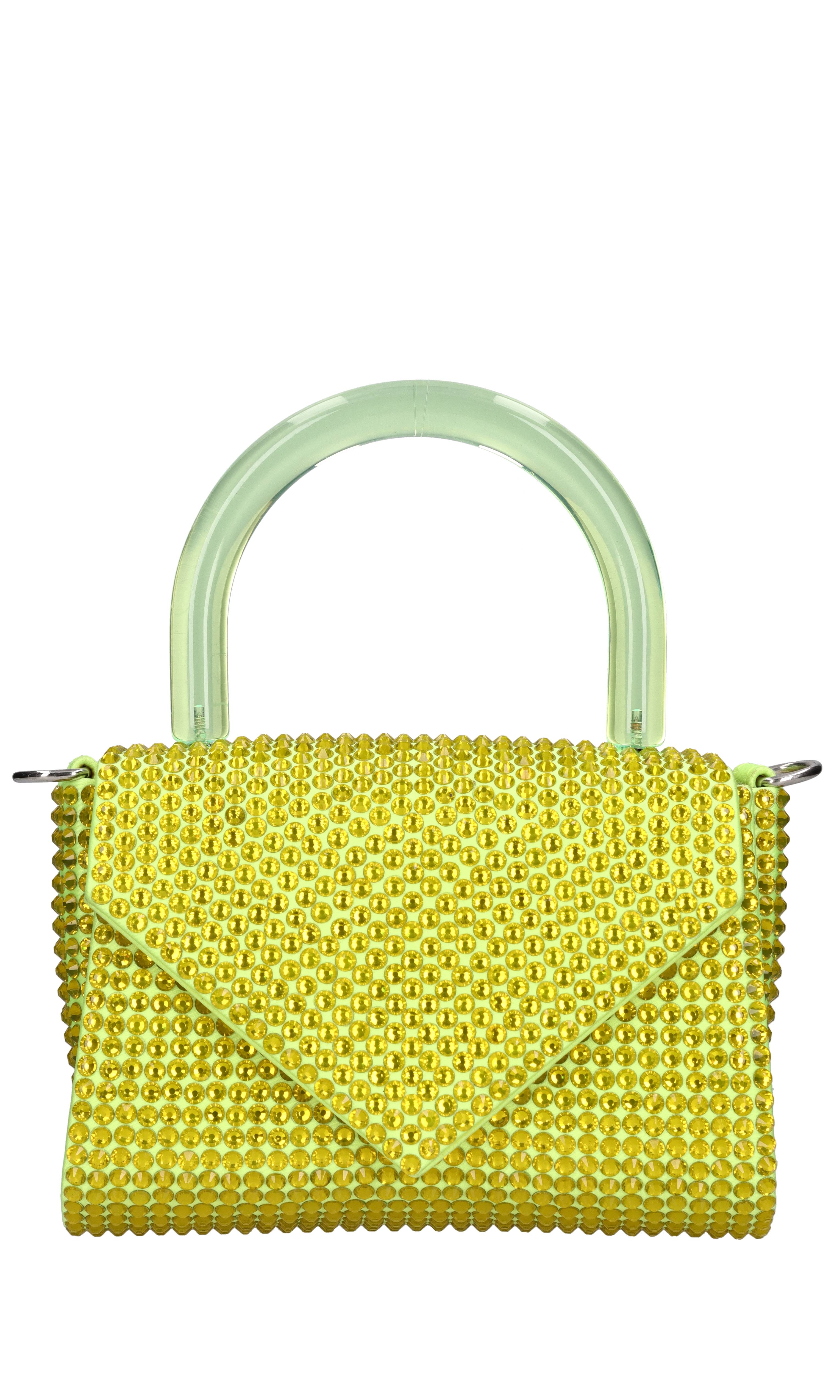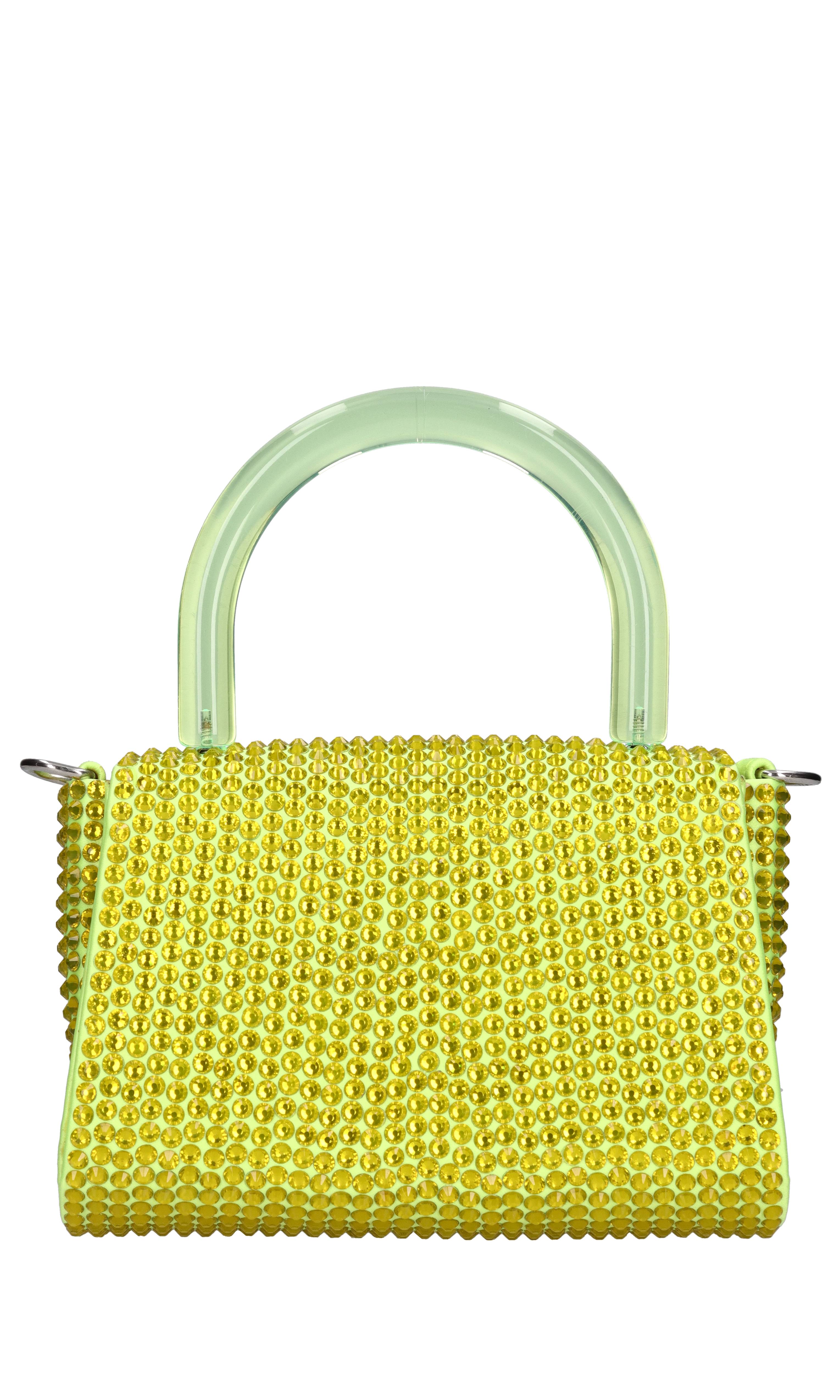 Sac Mini Cookie en satin et strass. Un compartiment. Plexi poignée. Bouton magnétique et rabat. Bande d'épaule en satin amovible. Des échantillons.