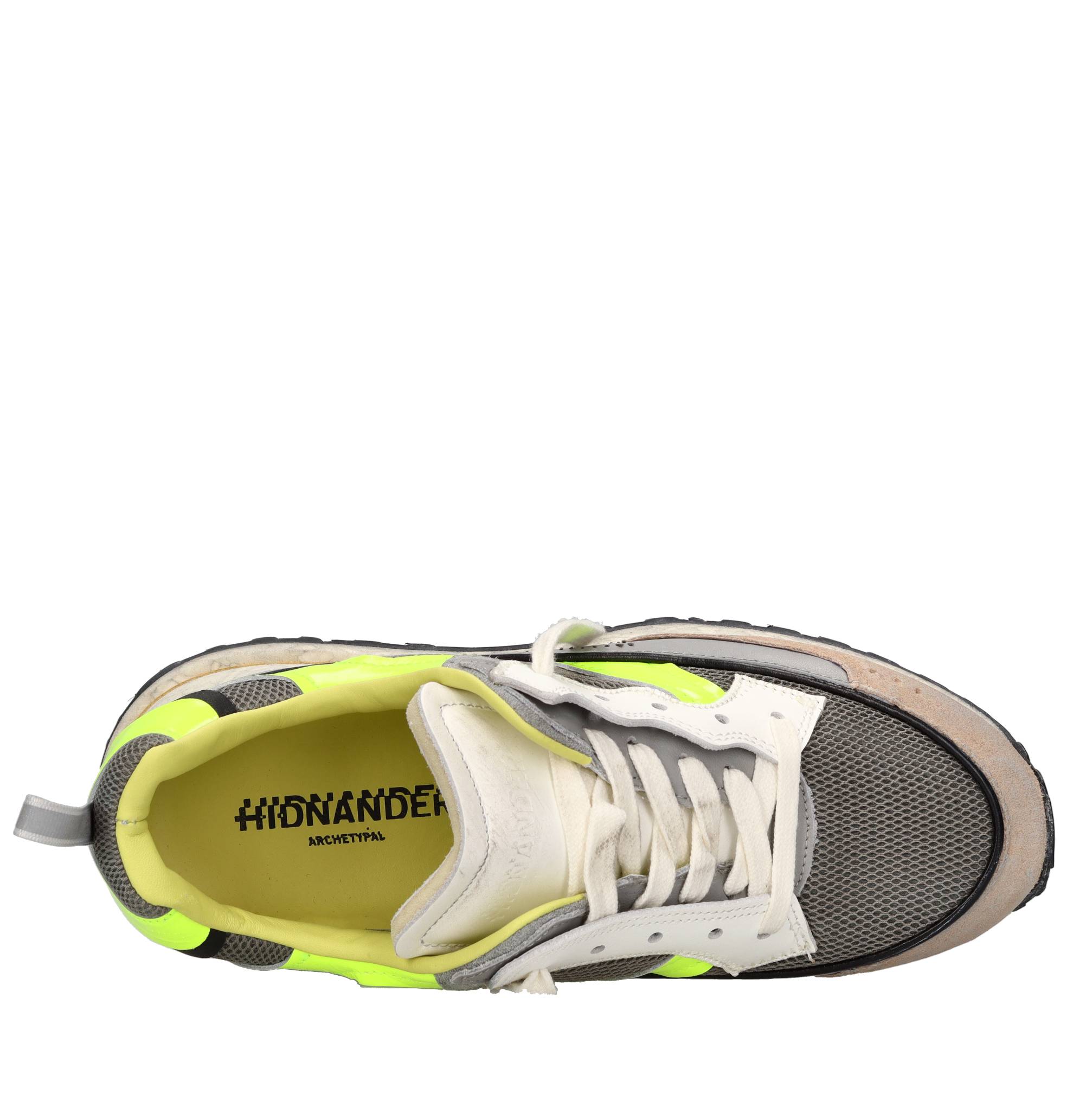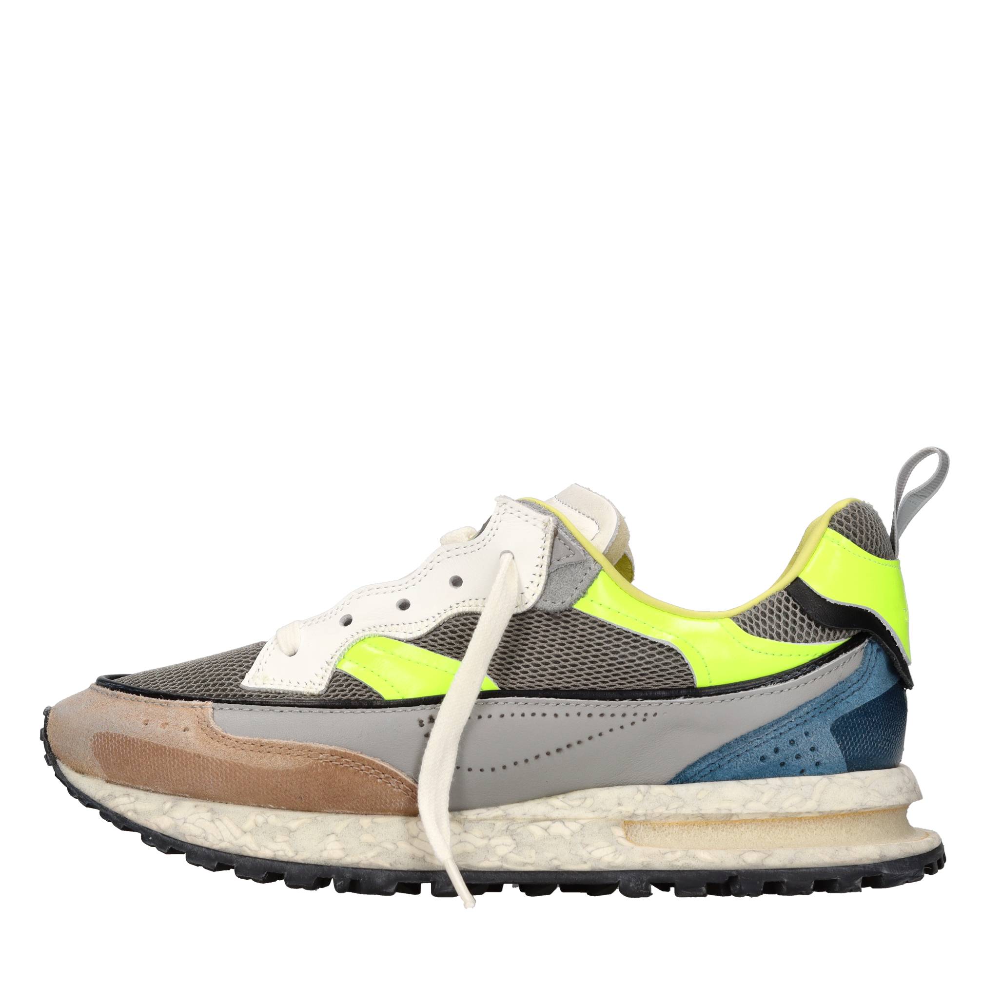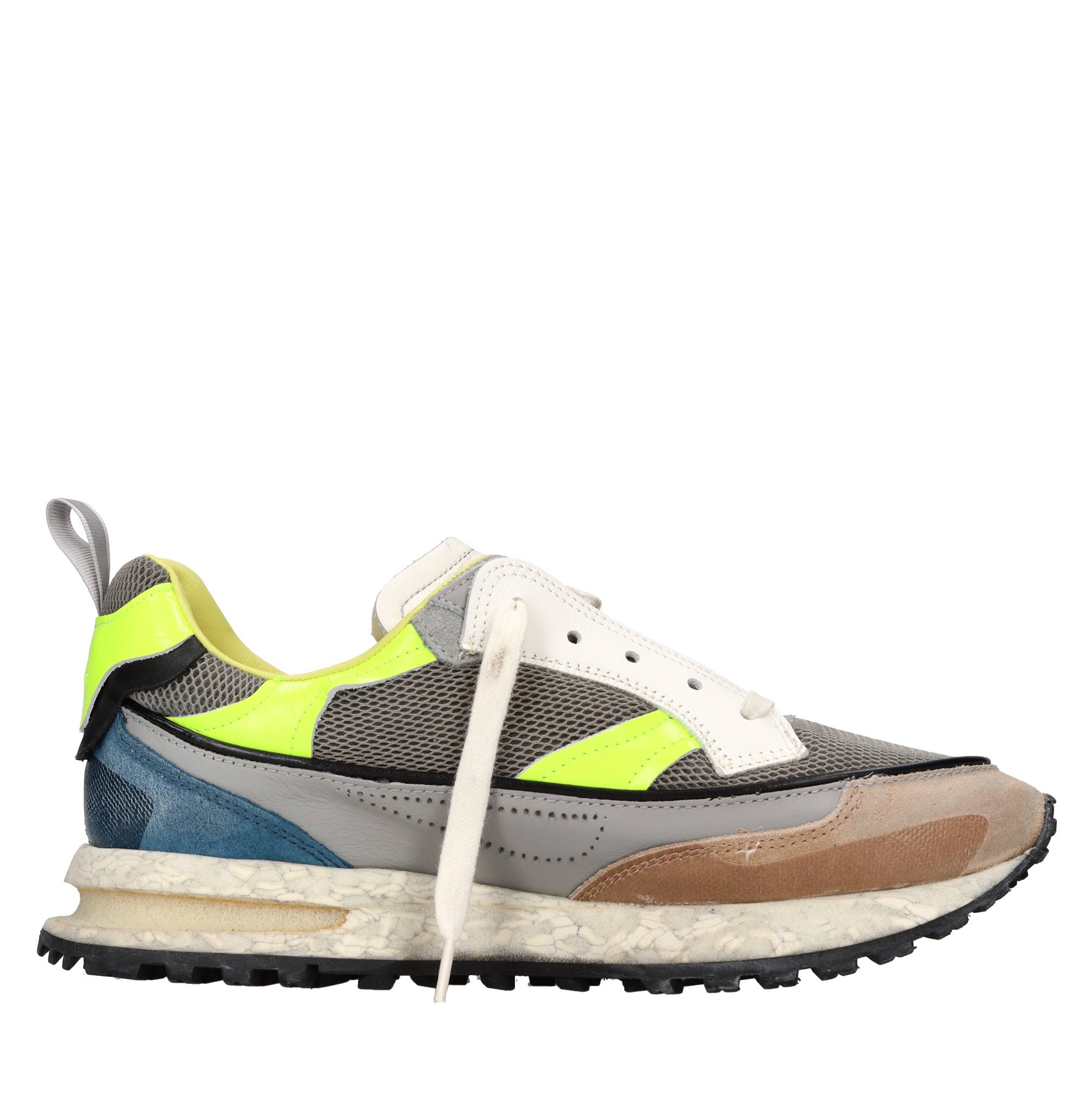 Baskets en cuir et tissu. Semelle extérieure en caoutchouc. Tige intérieure en cuir et en daim. Détails en jaune fluo.