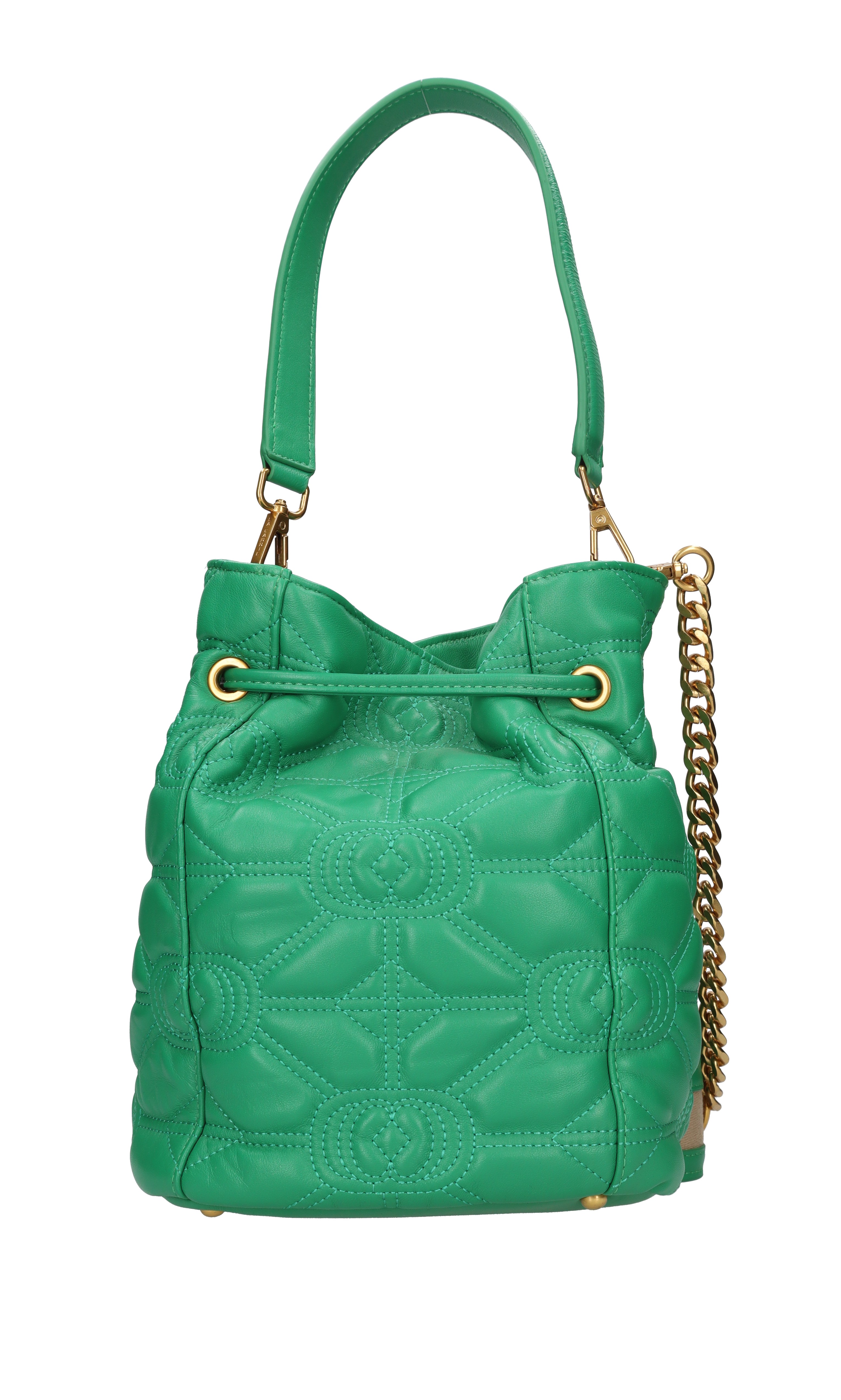 Sac en cuir rembourré et matelassé avec poignée en cuir et chaîne avec insert en cuir et tissu, tous deux amovibles. Fermeture par cordon et bouton magnétique.