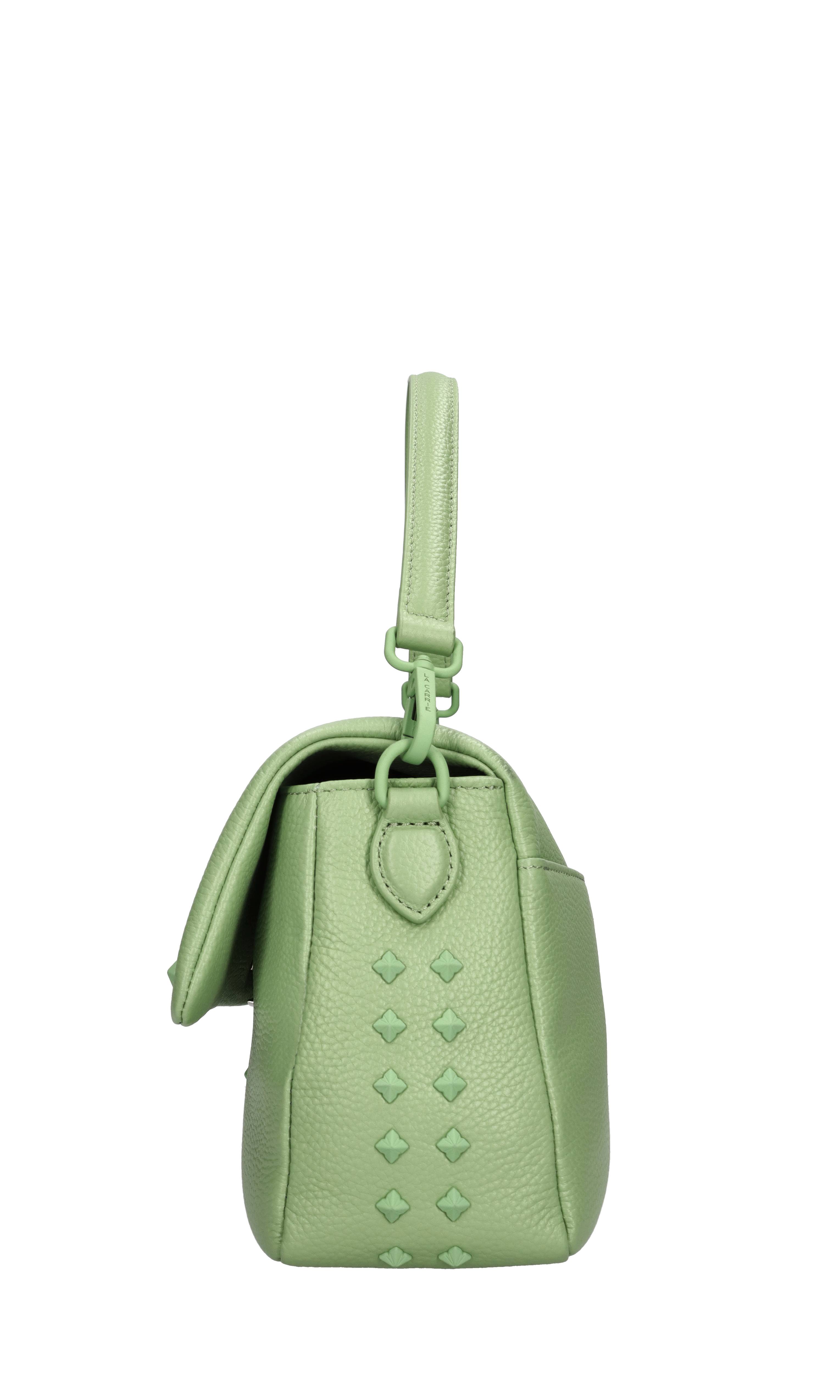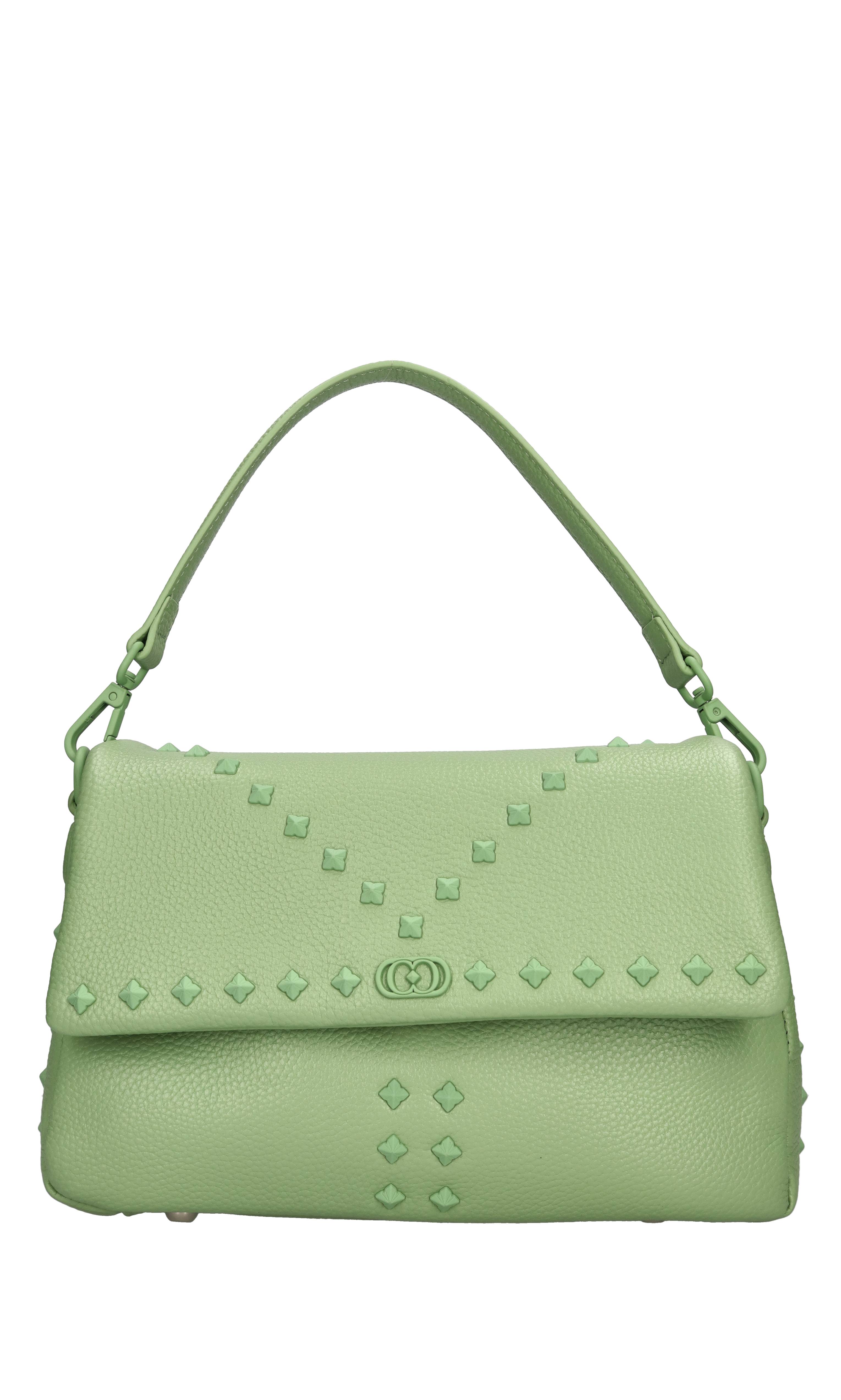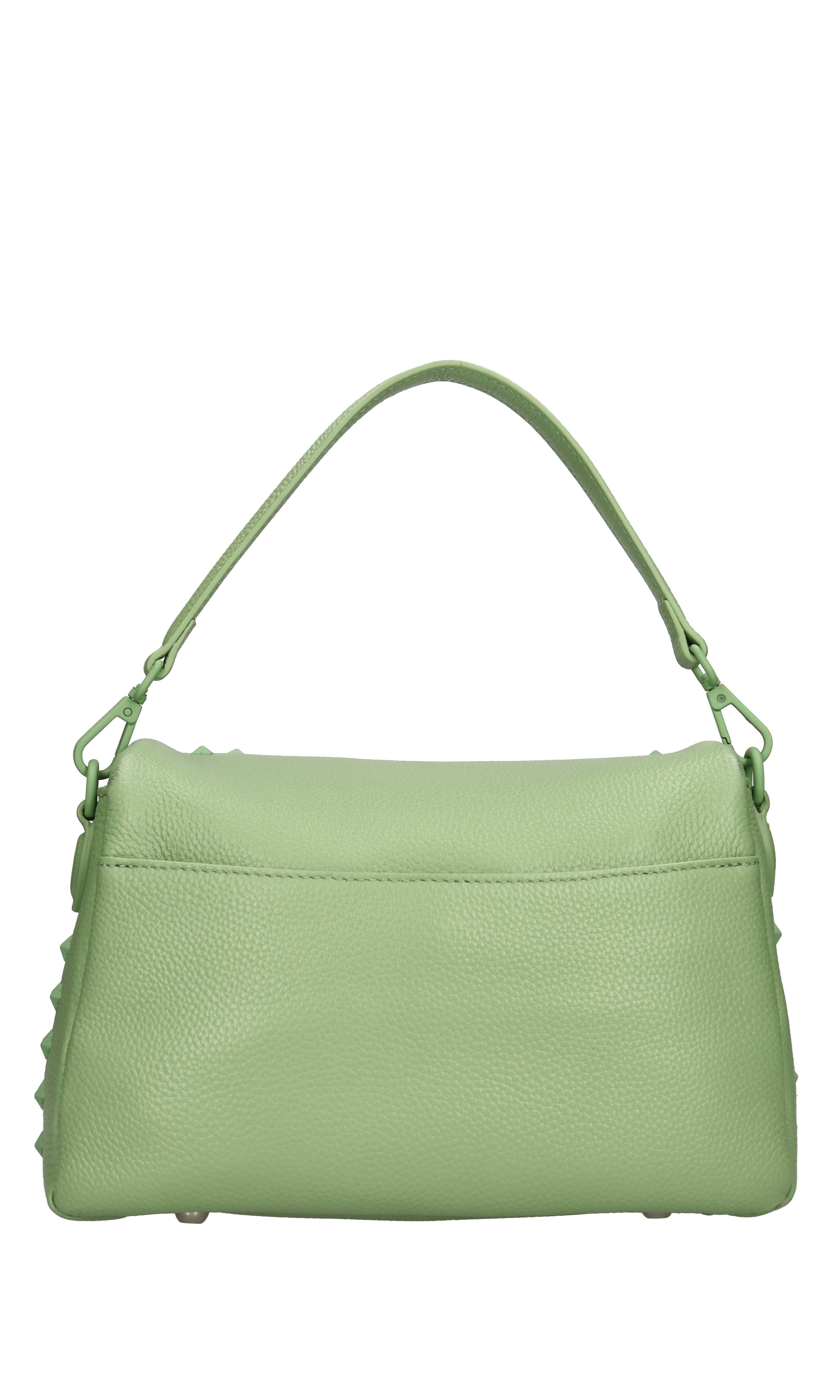 Sac en cuir frivole et clous. Un compartiment. Détails en métal ton sur ton. Fermeture avec bouton-pression. Chaîne bandoulière en cuir amovible.
