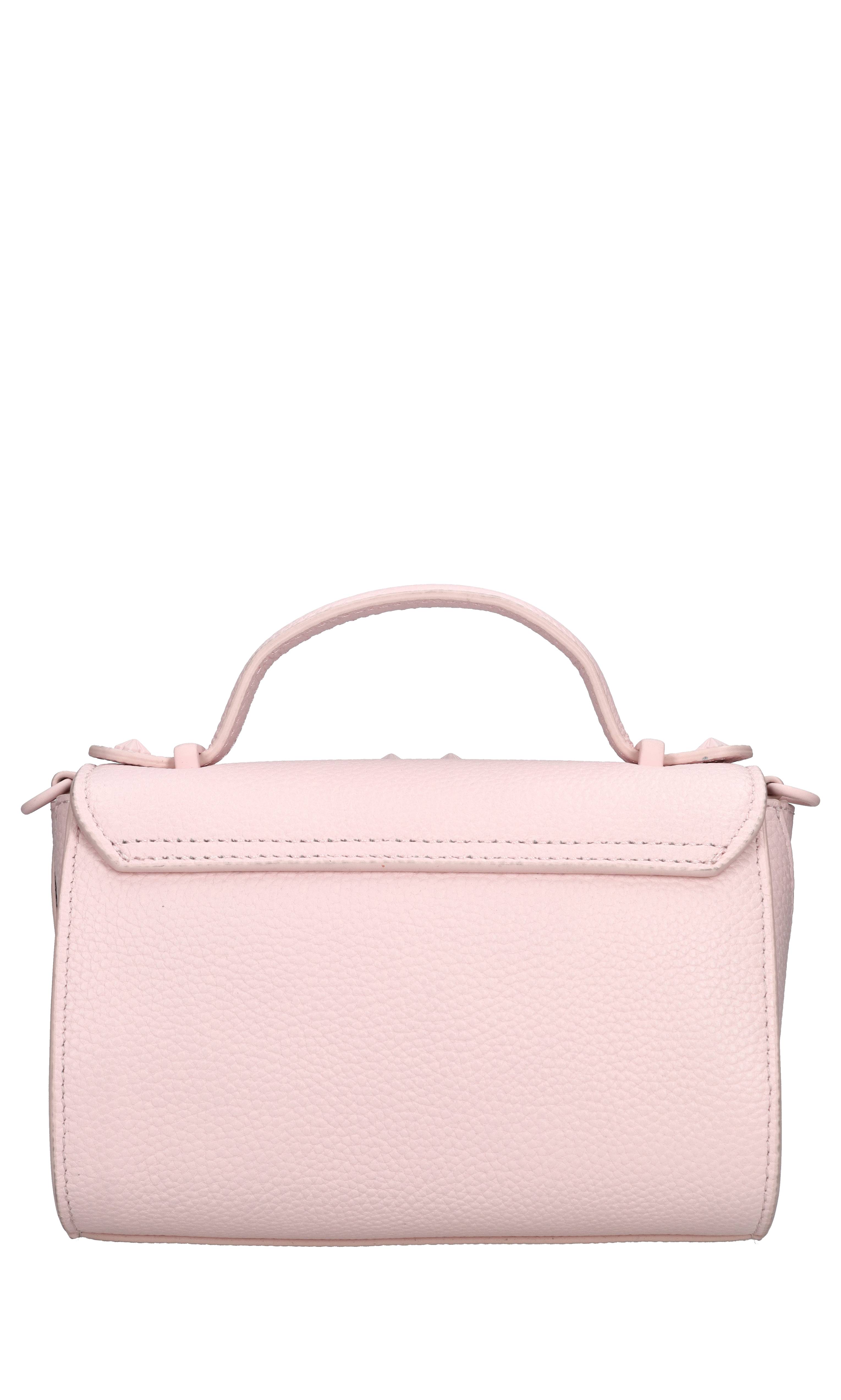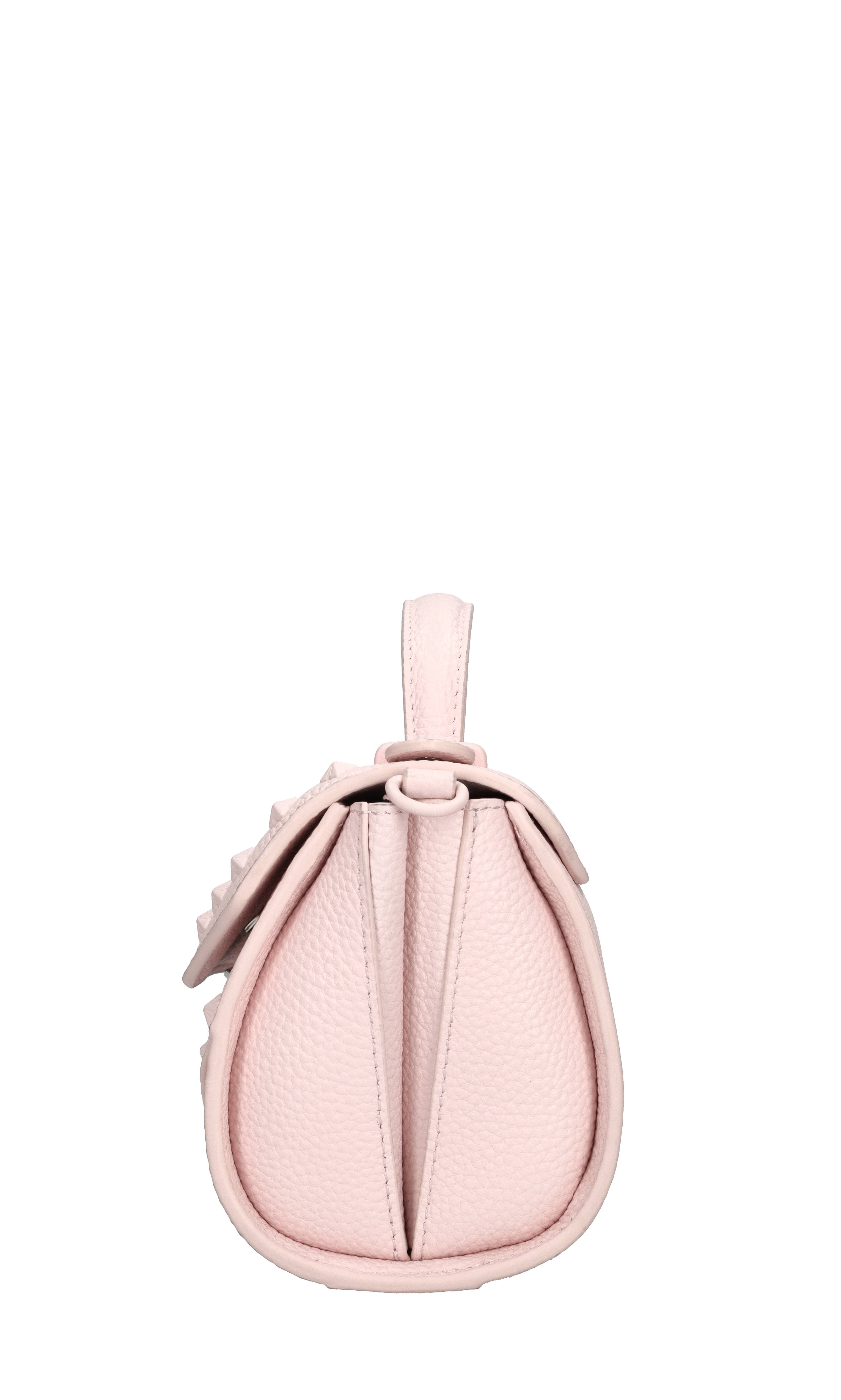 Mini sac frivole en cuir et clous. Un compartiment. Détails en métal ton sur ton. Fermeture avec bouton-pression. Chaîne rose bandoulière en cuir amovible.
