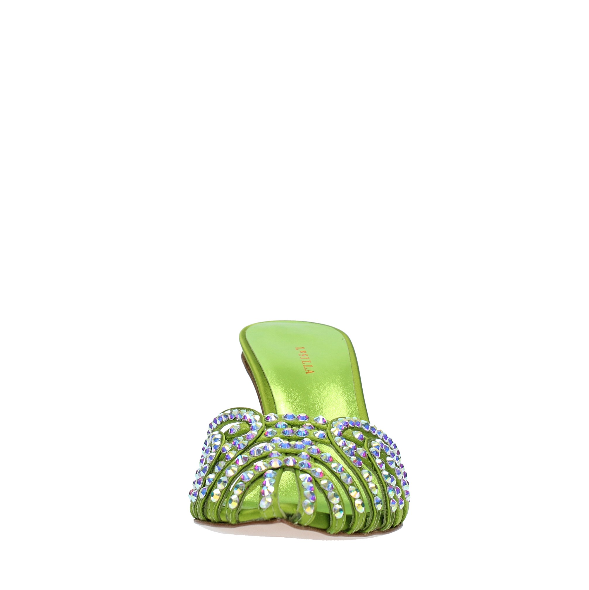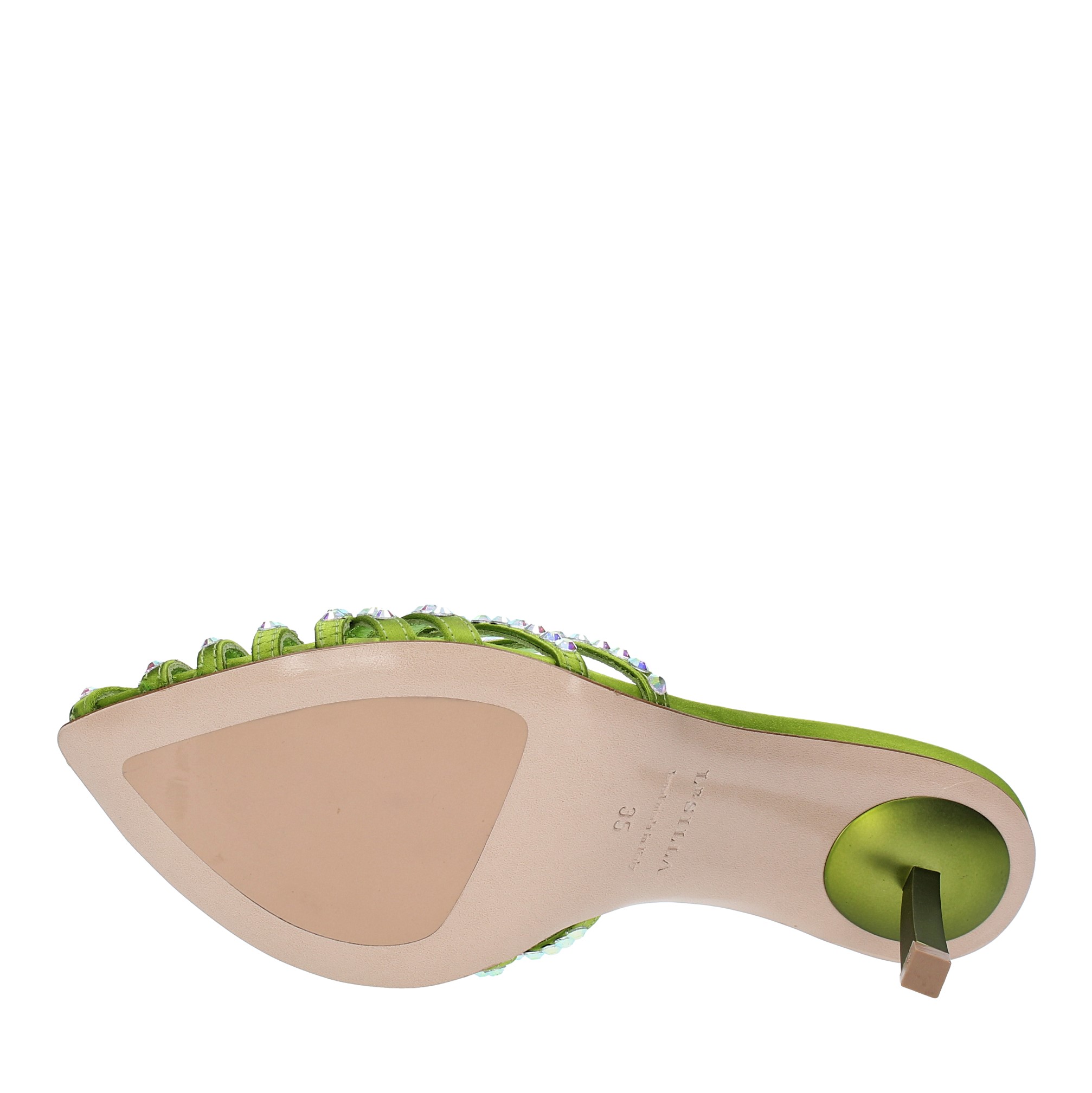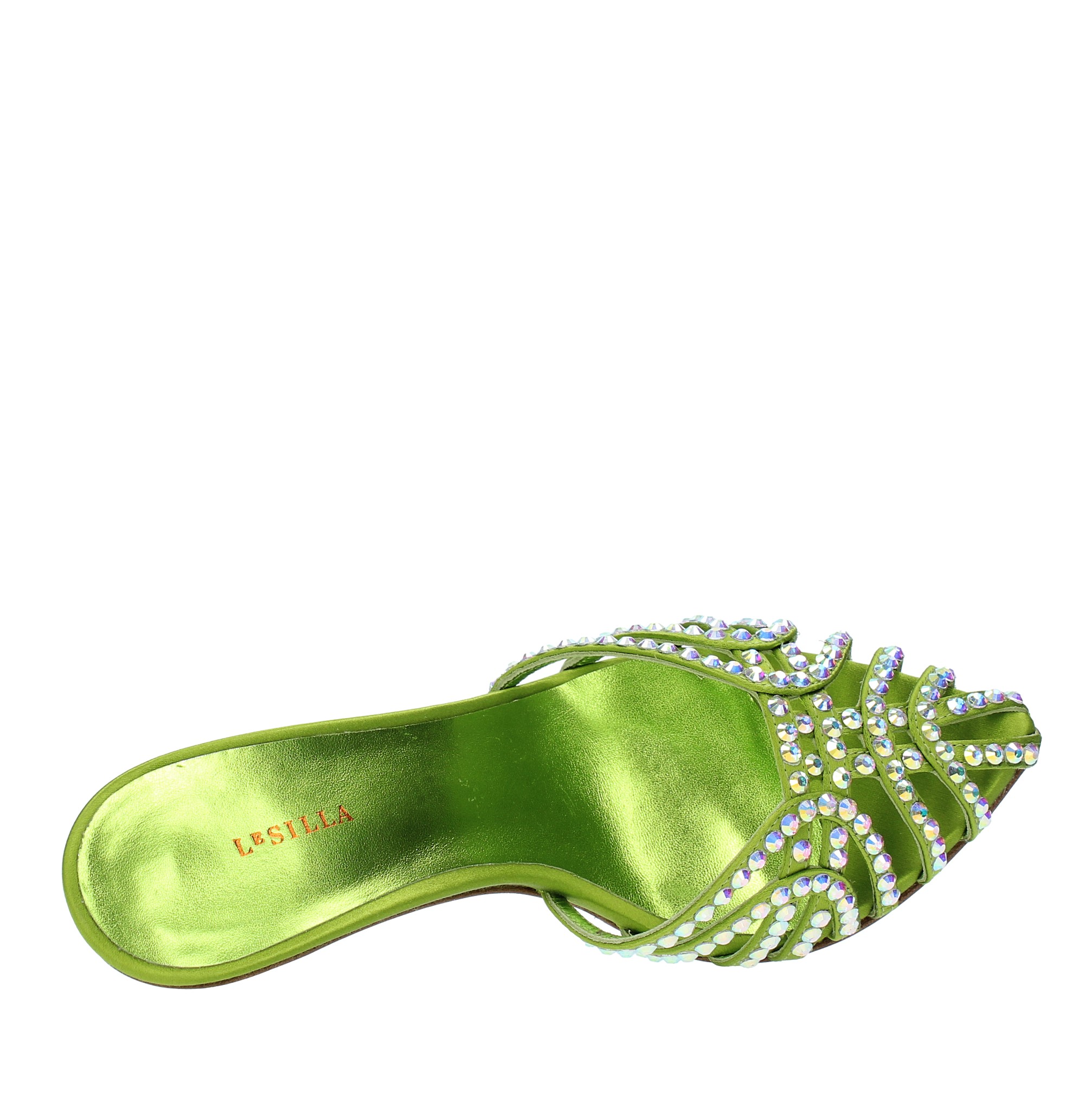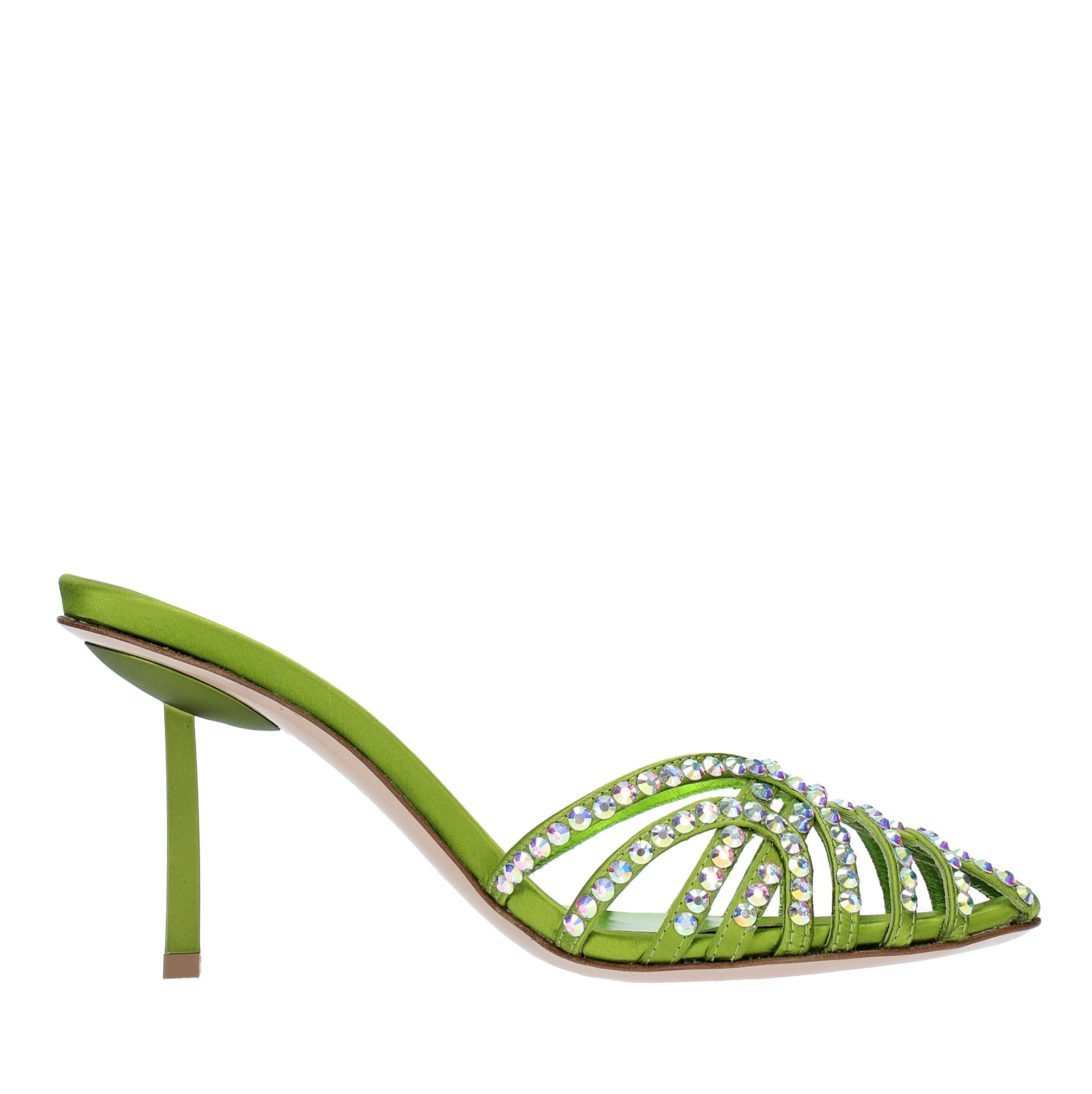 Mules en satin et strass. Semelle extérieure en cuir et caoutchouc. Tige interne en cuir et satin.